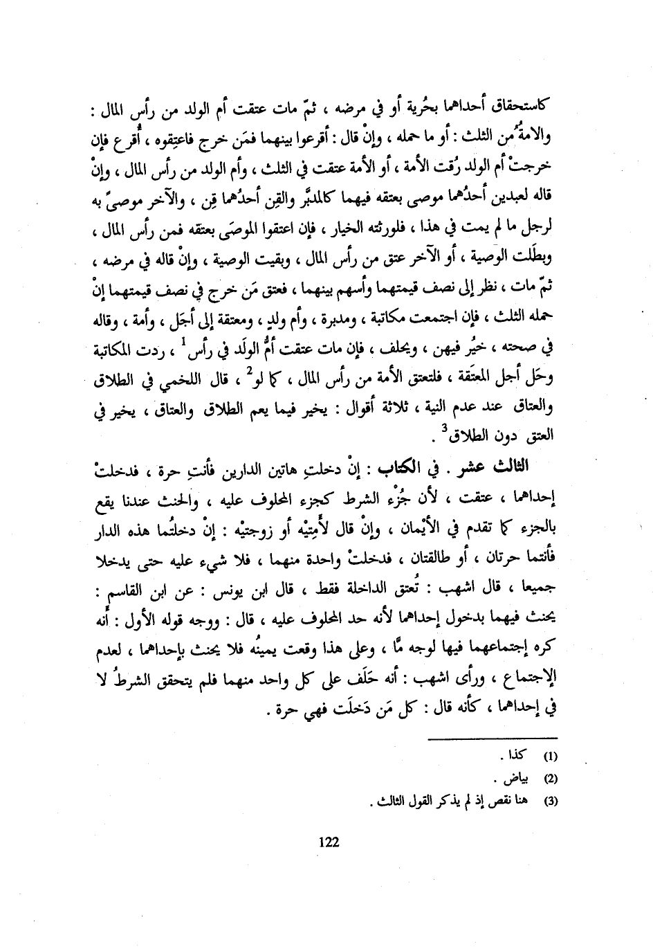 كَاسْتِحْقَاقِ إِحْدَاهُمَا بِحُرِّيَّةٍ أَوْ فِي مَرَضِهِ ثُمَّ مَاتَ عَتَقَتْ أُمُّ الْوَلَدِ مِنْ رَأْسِ الْمَالِ وَالْأمة من الثُّلُث وَأما مَا حَمَلَهُ وَإِنْ قَالَ أَقْرِعُوا بَيْنَهُمَا فَمَنْ خَرَجَ فَأَعْتِقُوهُ أُقْرِعَ فَإِنْ خَرَجَتْ أُمُّ الْوَلَدِ رَقَّتِ الْأَمَةُ أَوِ الْأَمَةُ عَتَقَتْ فِي الثُّلُثِ وَأُمُّ الْوَلَدِ مِنْ رَأْسِ الْمَالِ وَإِنْ قَالَهُ لِعَبْدَيْنِ أَحَدُهُمَا مُوصًى بِعِتْقِهِ فِيهِمَا كَالْمُدَبَّرِ وَالْقِنِّ أَحَدُهُمَا قِنٌّ وَالْآخَرُ مُوصًى بِهِ لِرَجُلٍ مَا لَمْ يَمُتْ فِي هَذَا فَلِوَرَثَتِهِ الْخِيَارُ فَإِنْ أَعْتَقُوا الْمُوصَى بِعِتْقِهِ فَمِنْ رَأْسِ الْمَالِ وَبَطَلَتِ الْوَصِيَّةُ أَوِ الْآخَرُ عَتَقَ مِنْ رَأْسِ الْمَالِ وَبَقِيَتِ الْوَصِيَّةُ وَإِنْ قَالَهُ فِي مَرَضِهِ ثُمَّ مَاتَ نُظِرَ إِلَى نِصْفِ قِيمَتِهِمَا وَأُسْهِمَ بَيْنَهُمَا فَعَتَقَ مَنْ خَرَجَ فِي نِصْفِ قِيمَتِهِمَا إِنْ حَمَلَهُ الثُّلُثُ فَإِنِ اجْتَمَعَتْ مُكَاتَبَةٌ وَمُدَبَّرَةٌ وَأُمُّ وَلَدٍ وَمُعْتَقَةٌ إِلَى أَجَلٍ وَأَمَةٌ وَقَالَهُ فِي صِحَّتِهِ خُيِّرَ فِيهِنَّ وَيَحْلِفُ فَإِنْ مَاتَ عَتَقَتْ أم الْوَلَد فِي رَأس رُدَّتِ الْمُكَاتَبَةُ وَحَلَّ أَجَلُ الْمُعْتَقَةِ فَلْتُعْتَقِ الْأَمَةُ مِنْ رَأْسِ الْمَالِ كَمَا لَوْ قَالَ اللَّخْمِيُّ فِي الطَّلَاق وَالْعتاق عِنْدَ عَدَمِ النِّيَّةِ ثَلَاثَةُ أَقْوَالٍ يُخَيَّرُ فِيمَا يَعُمُّ الطَّلَاقَ وَالْعَتَاقَ يُخَيَّرُ فِي الْعِتْقِ دُونَ الطَّلَاقِ الثَّالِثَ عَشَرَ فِي الْكِتَابِ إِنْ دَخَلْتِ هَاتَيْنِ الدَّارَيْنِ فَأَنْتِ حُرَّةٌ فَدَخَلَتْ إِحْدَاهُمَا عَتَقَتْ لِأَنَّ جُزْءَ الشَّرْطِ كَجُزْءِ الْمَحْلُوفِ عَلَيْهِ وَالْحِنْثُ عِنْدَنَا يَقَعُ بِالْجُزْءِ كَمَا تَقَدَّمَ فِي الْأَيْمَانِ وَإِنْ قَالَ لِأَمَتَيْهِ أَوْ زَوْجَتَيْهِ إِنْ دَخَلْتُمَا هَذِهِ الدَّارَ فَأَنْتُمَا حُرَّتَانِ أَوْ طَالِقَتَانِ فَدَخَلَتْ وَاحِدَةٌ مِنْهُمَا فَلَا شَيْءَ عَلَيْهِ حَتَّى يَدْخُلَا جَمِيعًا قَالَ أَشْهَبُ تَعْتِقُ الدَّاخِلَةُ فَقَطْ قَالَ ابْن يُونُس عَن ابْن الْقَاسِم يَحْنَث فِيهَا بِدُخُولِ إِحْدَاهُمَا لِأَنَّهُ حَدُّ الْمَحْلُوفِ عَلَيْهِ قَالَ وَوَجْهُ قَوْلِهِ الْأَوَّلِ أَنَّهُ كَرِهَ اجْتِمَاعَهُمَا فِيهَا لِوَجْهٍ مَا وَعَلَى هَذَا وَقَعَتْ يَمِينُهُ فَلَا يَحْنَثُ بِإِحْدَاهُمَا لِعَدَمِ الِاجْتِمَاعِ وَرَأَى أَشْهَبُ أَنَّهُ حلف على كل وَاحِد مِنْهُمَا فَلَمْ يَتَحَقَّقِ الشَّرْطُ لَا فِي إِحْدَاهُمَا كَأَنَّهُ قَالَ كُلُّ مَنْ دَخَلَتْ فَهِيَ حُرَّةٌ