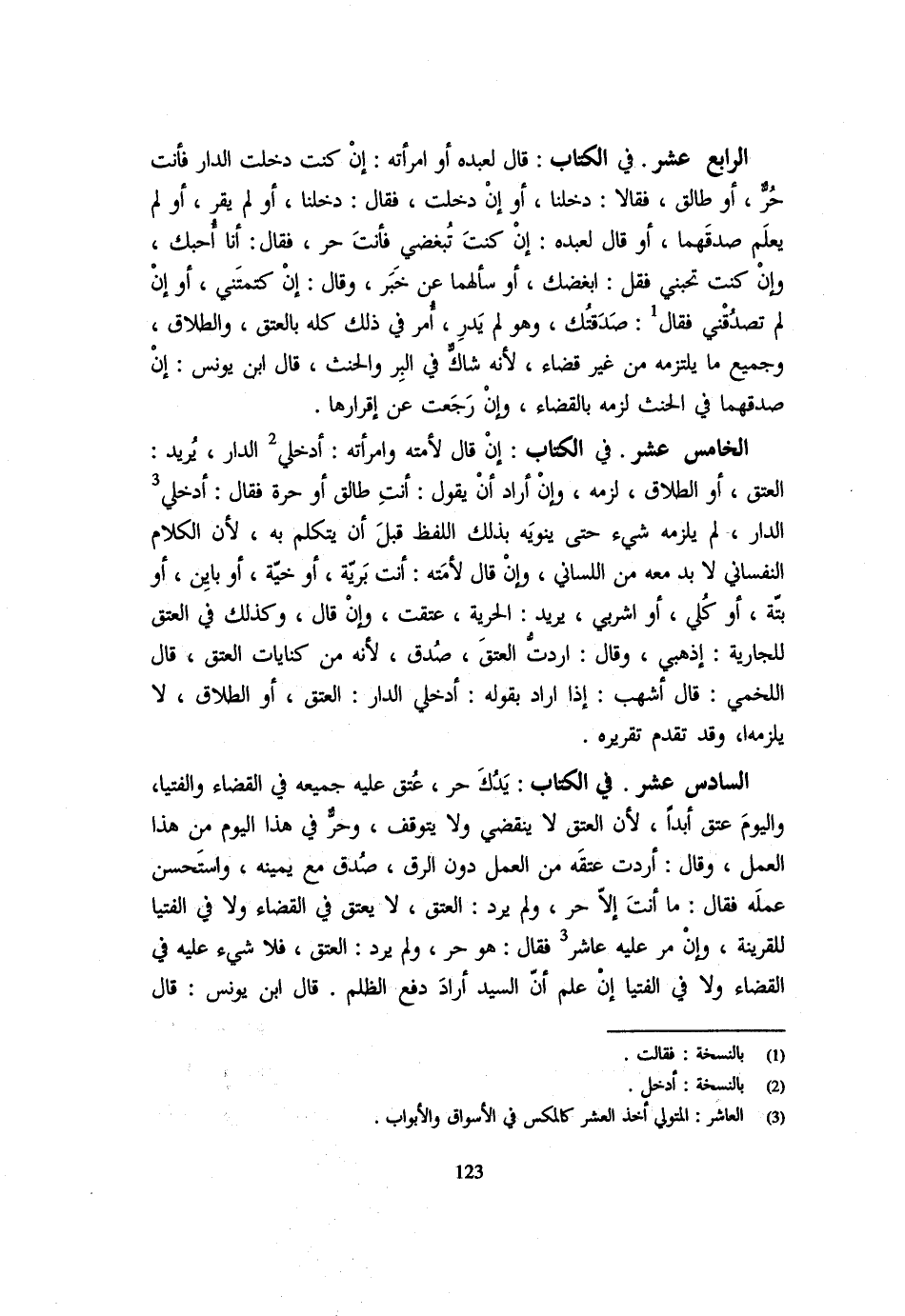 الرَّابِعَ عَشَرَ فِي الْكِتَابِ قَالَ لِعَبْدِهِ أَوِ امْرَأَتِهِ إِنْ كُنْتَ دَخَلْتَ الدَّارَ فَأَنْتَ حُرٌّ أَوْ طَالِقٌ فَقَالَا دَخَلْنَا أَوْ إِنْ دَخَلَتْ فَقَالَ دَخَلْنَا أَوْ لَمْ يُقِرَّ أَوْ لَمْ يَعْلَمْ صِدْقَهُمَا أَوْ قَالَ لِعَبْدِهِ إِنْ كُنْتَ تُبْغِضُنِي فَأَنت حر فَقَالَ أَنا احبك وَإِن كنت تحبني فَقل أُبْغِضُكَ أَوْ سَأَلَهُمَا عَنْ خَبَرٍ وَقَالَ إِنْ كَتَمْتَنِي أَوْ إِنْ لَمْ تَصْدُقْنِي فَقَالَ صَدَقْتُكَ وَهُوَ لَمْ يَدْرِ أُمِرَ فِي ذَلِكَ كُلِّهِ بِالْعِتْقِ وَالطَّلَاقِ وَجَمِيعِ مَا يَلْتَزِمُهُ مِنْ غَيْرِ قَضَاءٍ لِأَنَّهُ شَاكٌّ فِي الْبِرِّ وَالْحِنْثِ قَالَ ابْنُ يُونُسَ إِنْ صَدَّقَهُمَا فِي الْحِنْثِ لَزِمَهُ بِالْقَضَاءِ وَإِنْ رَجَعَتْ عَنْ إِقْرَارِهَا الْخَامِسَ عَشَرَ فِي الْكِتَابِ إِنْ قَالَ لِأَمَتِهِ وَامْرَأَتِهِ ادْخُلِي الدَّارَ يُرِيدُ الْعِتْقَ أَوِ الطَّلَاقَ لَزِمَهُ وَإِنْ أَرَادَ أَنْ يَقُولَ أَنْتِ طَالِقٌ أَوْ حُرَّةٌ فَقَالَ ادْخُلِي الدَّارَ لَمْ يَلْزَمْهُ شَيْءٌ حَتَّى يَنْوِيَهُ بِذَلِكَ اللَّفْظِ قَبْلَ أَنْ يَتَكَلَّمَ بِهِ لِأَن الْكَلَام النفساني لابد مَعَهُ مِنَ اللِّسَانِيِّ وَإِنْ قَالَ لِأَمَتِهِ أَنْتِ بَريَّة اَوْ خية اَوْ باين أَوْ بَتَّةٌ أَوْ كُلِي أَوِ اشْرَبِي يُرِيدُ الْحُرِّيَّة عتقت وَإِن قَالَ وَكَذَلِكَ فِي الْعِتْقِ لِلْجَارِيَةِ اذْهَبِي وَقَالَ أَرَدْتُ الْعِتْقَ صُدِّقَ لِأَنَّهُ مِنْ كِنَايَاتِ الْعِتْقِ قَالَ اللَّخْمِيُّ قَالَ أَشْهَبُ إِذَا أَرَادَ بِقَوْلِهِ ادْخُلِي الدَّارَ الْعِتْقَ أَوِ الطَّلَاقَ لَا يَلْزَمُهُ وَقَدْ تَقَدَّمَ تَقْرِيرُهُ السَّادِسَ عَشَرَ فِي الْكِتَابِ يَدُكَ حُرٌّ عتق عَلَيْهِ جَمِيعه فِي الْقَضَاء والفتيا وَالْيَوْم عتق أبدا لِأَن الْعتْق لَا يَنْقَضِي وَلَا يتَوَقَّف وحر فِي هَذَا الْيَوْمِ مِنْ هَذَا الْعَمَلِ وَقَالَ أَرَدْتُ عِتْقَهُ مِنَ الْعَمَلِ دُونَ الرِّقِّ صُدِّقَ مَعَ يَمِينه وَاسْتحْسن عَمَلَهُ فَقَالَ مَا أَنْتَ إِلَّا حُرٌّ وَلَمْ يُرِدِ الْعِتْقَ لَا يَعْتِقُ فِي الْقَضَاءِ وَلَا فِي الْفُتْيَا لِلْقَرِينَةِ وَإِنْ مَرَّ عَلَيْهِ عَاشِرٌ فَقَالَ هُوَ حُرٌّ وَلَمْ يُرِدِ الْعِتْقَ فَلَا شَيْءَ عَلَيْهِ فِي الْقَضَاءِ وَلَا فِي الْفُتْيَا إِنْ عَلِمَ أَنَّ السَّيِّدَ أَرَادَ دَفْعَ الظُّلْمِ قَالَ ابْنُ يُونُسَ قَالَ