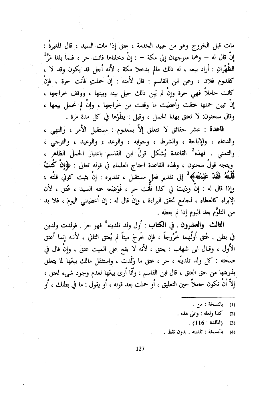 مَاتَ قبل الْخُرُوج وَهُوَ من بعيد الْخِدْمَةِ عَتَقَ إِذَا مَاتَ السَّيِّدُ قَالَ الْمُغِيرَةُ إِنْ قَالَ لَهُ وَهُمَا مُتَوَجِّهَانِ إِلَى مَكَّةَ إِنْ دَخَلْنَاهَا فَأَنْتَ حُرٌّ فَلَمَّا بَلَغَا مَرَّ الظَّهْرَانِ أَرَادَ بَيْعَهُ لَهُ ذَلِكَ مَا لَمْ يَدْخُلَا مَكَّةَ لِأَنَّهُ أَجَلٌ قَدْ يَكُونُ وَقَدْ لَا كَقُدُومِ فُلَانٍ وَعَنِ ابْنِ الْقَاسِمِ قَالَ لِأَمَتِهِ إِنْ حَمَلْتِ فَأَنْتِ حُرَّةٌ فَإِنْ كَانَتْ حَامِلًا فَهِيَ حُرَّةٌ وَإِنْ لَمْ يَبِنْ ذَلِكَ حِيلَ بَيْنَهُ وَبَيْنَهَا وَوَقَفَ خَرَاجَهَا إِنْ تَبَيَّنَ حملهَا عتقت وَأعْطيت مَا وقفت من خراجها وَإِن لم تحمل بَيْعُهَا وَقَالَ سَحْنُونٌ لَا تَعْتِقُ بِهَذَا الْحَمْلِ وَقيل يَطَؤُهَا فِي كل مُدَّة مَرَّةً قَاعِدَةٌ عَشْرُ حَقَائِقَ لَا تَتَعَلَّقُ إِلَّا بِمَعْدُومٍ مُسْتَقْبَلُ الْأَمْرِ وَالنَّهْيِ وَالدُّعَاءِ وَالْإِبَاحَةِ وَالشَّرْطِ وَجَوَابِهِ وَالْوَعْدِ وَالْوَعِيدِ وَالتَّرَجِّي وَالتَّمَنِّي فَهَذِهِ الْقَاعِدَةُ يُشْكِلُ قَوْلُ ابْنِ الْقَاسِمِ بِاعْتِبَارِ الْحَمْلِ الظَّاهِرِ وَيَتَّجِهُ قَوْلُ سَحْنُونٍ وَلِهَذِهِ الْقَاعِدَةِ احْتَاجَ الْعُلَمَاءُ فِي قَوْله تَعَالَى {إِنْ كُنْتُ قُلْتُهُ فَقَدْ عَلمته} إِلَى تَقْدِيرِ فِعْلٍ مُسْتَقْبَلٍ تَقْدِيرُهُ إِنْ يَثْبُتْ كوني قلته وَإِذا قَالَ لَهُ إِن وديت لِي كَذَا فَأَنْتَ حُرٌّ فَوَضَعَهُ عَنْهُ السَّيِّدُ عَتَقَ لِأَنَّ الْإِبْرَاءَ كَالْعَطَاءِ لِجَامِعِ تَحَقُّقِ الْبَرَاءَةِ وَإِنْ قَالَ لَهُ إِنْ أَعْطَيْتَنِي الْيَوْمَ فَلَا بُدَّ مِنَ التَّلَوُّمِ بَعْدَ الْيَوْمِ إِذَا لَمْ يُعْطِهِ الثَّالِثُ وَالْعِشْرُونَ فِي الْكِتَابِ أَوَّلُ وَلَدٍ تَلِدِينَهُ فَهُوَ حُرٌّ فَوَلَدَتْ وَلَدَيْنِ فِي بَطْنٍ عَتَقَ أَوَّلُهُمَا خُرُوجًا فَإِنْ خَرَجَ مَيِّتًا لَمْ يَعْتِقِ الثَّانِي لِأَنَّهُ إِنَّمَا أَعْتَقَ الْأَوَّلَ وَقَالَ ابْنُ شِهَابٍ يَعْتِقُ لِأَنَّهُ لَا يَقَعُ عَلَى الْمَيِّتِ عِتْقٌ وَإِنْ قَالَ فِي صِحَّتِهِ كُلُّ وَلَدٍ تَلِدِينَهُ حُرٌّ عَتَقَ مَا وَلَدَتْ وَاسْتَثْقَلَ مَالِكٌ بَيْعَهَا لِمَا يَتَعَلَّقُ بِذُرِّيَّتِهَا مِنْ حَقِّ الْعِتْقِ قَالَ ابْنُ الْقَاسِمِ وَأَنَا أَرَى بَيْعَهَا لعدم وجود شَيْء لعتق إِلَّا أَنْ تَكُونَ حَامِلًا حِينَ التَّعْلِيقِ أَوْ حَمَلَتْ بَعْدَ قَوْلِهِ أَوْ يَقُولُ مَا فِي بَطْنك اَوْ