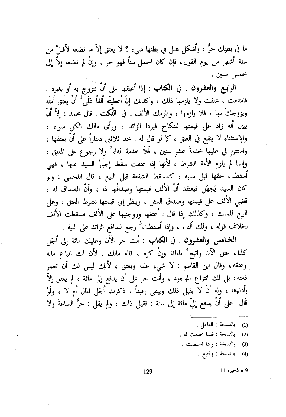 مَا فِي بَطْنِكَ حُرٌّ وَأَشْكَلَ هَلْ فِي بَطْنِهَا شَيْءٌ لَا يَعْتِقُ إِلَّا مَا تَضَعُهُ لِأَقَلَّ مِنْ سِتَّةِ أَشْهُرٍ مِنْ يَوْمِ الْقَوْلِ فَإِنْ كَانَ الْحَمْلُ بَيِّنًا فَهُوَ حُرٌّ وَإِنْ لَمْ تَضَعْهُ إِلَّا إِلَى خَمْسِ سِنِينَ الرَّابِعُ وَالْعِشْرُونَ فِي الْكِتَابِ إِذَا أَعْتَقَهَا عَلَى أَنْ تَتَزَوَّجَ بِهِ أَوْ بِغَيْرِهِ فَامْتَنَعَتْ عَتَقَتْ وَلَا يَلْزَمُهَا ذَلِكَ وَكَذَلِكَ إِنْ أَعْطَيْتَهُ أَلْفًا عَلَى أَنْ يَعْتِقَ أَمَتَهُ وَيُزَوِّجَكَ بِهَا فَلَا يَلْزَمُهَا وتلزمك الْألف فِي النُّكَتِ قَالَ مُحَمَّدٌ إِلَّا أَنْ يُبَيِّنَ أَنه زَاد على قيمتهَا للنِّكَاح فيردا الزَّائِد وَرَأى مَالك الْكل سَوَاء والإستناء لَا ينفع فِي الْعتْق كَمَا لَو قَالَ لَهُ خُذْ ثَلَاثِينَ دِينَارًا عَلَى أَنْ يَعْتِقَهَا وَاسْتَثْنِ لِي عَلَيْهَا خِدْمَةَ عَشْرِ سِنِينَ فَلَا خدمَة اله اولا رُجُوعَ عَلَى الْمُعْتِقِ وَإِنَّمَا لَمْ يَلْزَمِ الْأَمَةَ الشَّرْطُ لِأَنَّهَا إِذَا عَتَقَتْ سَقَطَ إِجْبَارُ السَّيِّدِ عَنْهَا فَهِيَ أَسْقَطَتْ حَقَّهَا قَبْلَ سَبَبِهِ كَمُسْقِطِ الشُّفْعَةِ قَبْلَ الْبَيْعِ قَالَ اللَّخْمِيُّ وَلَوْ كَانَ السَّيِّدُ يَجْهَلُ فَيَعْتَقِدُ أَنَّ الْأَلْفَ قِيمَتُهَا وَصَدَاقُهَا لَهَا وَأَنَّ الصَّدَاقَ لَهُ قُضِيَ الْأَلْفُ عَلَى قِيمَتِهَا وَصَدَاقُ الْمِثْلِ وَيُنْظَرُ إِلَى قِيمَتِهَا بِشَرْطِ الْعِتْقِ وَعَلَى الْبَيْعِ لِلْمِلْكِ وَكَذَلِكَ إِذَا قَالَ أَعْتِقْهَا وَزَوِّجْنِيهَا عَلَى الْأَلْفِ فَسَقَطَتِ الْأَلِفُ بِخِلَافِ قَوْلِهِ وَلَكَ أَلْفٌ وَإِذَا أُسْقِطَتْ رَجَعَ لِلدَّافِعِ الزَّائِدُ عَلَى النِّيَّةِ الْخَامِسُ وَالْعِشْرُونَ فِي الْكِتَابِ أَنْتَ حُرٌّ الْآنَ وَعَلَيْكَ مِائَةٌ إِلَى أَجَلِ كَذَا عَتَقَ الْآنَ وَاتَّبَعَ بِالْمِائَةِ وَإِنْ كَرِهَ قَالَهُ مَالِكٌ لِأَنَّ لَكَ اتِّبَاعَ مَالِهِ وَعِتْقَهُ وَقَالَ ابْنُ الْقَاسِمِ لَا شَيْءَ عَلَيْهِ وَيَعْتِقُ لِأَنَّكَ لَيْسَ لَكَ أَنْ تَعْمُرَ ذِمَّتَهُ بَلْ لَكَ انْتِزَاعُ الْمَوْجُودِ وَأَنْتَ حُرٌّ عَلَى أَنْ يدْفع إِلَى مائَة لم يعْتق إِلَّا بأداءها وَله أَن لَا يَقْبَلَ ذَلِكَ وَيَبْقَى رَقِيقًا ذَكَرْتَ أَجَلَ الْمَالِ أَمْ لَا وَلَوْ قَالَ عَلَى أَنْ يَدْفَعَ إِلَيَّ مِائَةً إِلَى سَنَةٍ فَقِيلَ ذَلِكَ وَلَمْ يَقُلْ حُرٌّ السَّاعَةَ وَلَا