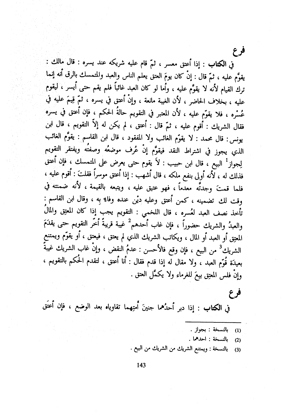 فِي الْكِتَابِ إِذَا أَعْتَقَ مُعْسِرٌ ثُمَّ قَامَ عَلَيْهِ شَرِيكُهُ عِنْدَ يُسْرِهِ قَالَ مَالِكٌ يُقَوَّمُ عَلَيْهِ ثُمَّ قَالَ إِنْ كَانَ يَوْمَ الْعِتْقِ يُعْلِمُ النَّاسَ وَالْعَبْدَ وَالْمُتَمَسِّكَ بِالرِّقِّ أَنَّهُ إِنَّمَا تَرَكَ الْقِيَامَ لِأَنَّهُ لَا يُقَوَّمُ عَلَيْهِ وَأَمَّا لَوْ كَانَ الْعَبْدُ غَائِبًا فَلَمْ يَقُمْ حَتَّى أيسر ليقوم عَلَيْهِ بِخِلَافِ الْحَاضِرِ لِأَنَّ الْغَيْبَةَ مَانِعَةٌ وَإِنْ أعتق فِي يسره ثمَّ قيم عَلَيْهِ فِي عُسْرِهِ فَلَا يُقَوَّمُ عَلَيْهِ لِأَنَّ الْمُعْتَبَرَ فِي التَّقْوِيمِ حَالَةُ الْحُكْمِ فَإِنْ أَعْتَقَ فِي يُسْرِهِ فَقَالَ الشَّرِيكُ أُقْوِمَ عَلَيْهِ ثُمَّ قَالَ أُعْتِقَ لَمْ يَكُنْ لَهُ إِلَّا التَّقْوِيمُ قَالَ ابْنُ يُونُسَ قَالَ مُحَمَّدٌ لَا يُقَوَّمُ الْغَائِبُ وَلَا الْمَفْقُودُ قَالَ ابْنُ الْقَاسِمِ يُقَوَّمُ الْغَائِبُ الَّذِي يَجُوزُ فِي اشْتِرَاطِ النَّقْدِ فَيَقُومُ إِنْ عَرَفَ مَوْضِعَهُ وَصِفَتَهُ وَيَفْتَقِرُ التَّقْوِيمُ لِجَوَازِ الْبَيْعِ قَالَ ابْنُ حَبِيبٍ لَا يُقَوَّمُ حَتَّى يُعْرَضَ عَلَى الْمُتَمَسِّكَ فَإِنْ أَعْتَقَ فَذَلِكَ لَهُ لِأَنَّهُ أَوْلَى بِنَفْعِ مِلْكِهِ قَالَ أَشْهَبُ إِذَا أَعْتَقَ مُوسِرًا فَقُلْتُ أُقْوِمَ عَلَيْهِ فَلَمَّا قُمْتُ وجدته معدما فَهُوَ عَتيق عَلَيْهِ ويتبعه بِالْقيمَةِ لِأَنَّهُ ضَمِنْتَهُ فِي وَقْتٍ لَكَ تَضْمِينُهُ كَمَنْ أَعْتَقَ وَعَلَيْهِ دَيْنٌ عِنْدَهُ وَفَاءٌ بِهِ وَقَالَ ابْنُ الْقَاسِمِ تَأْخُذُ نِصْفَ الْعَبْدِ لِعُسْرِهِ قَالَ اللَّخْمِيُّ التَّقْوِيمُ يَجِبُ إِذَا كَانَ الْمُعْتِقُ وَالْمَالُ وَالْعَبْدُ وَالشَّرِيكُ حُضُورًا فَإِنْ غَابَ أَحَدُهُمْ غَيْبَةً قَرِيبَةً أُخِّرَ التَّقْوِيمُ حَتَّى يَقْدَمَ الْمُعْتِقُ أَوِ الْعَبْدُ أَوِ الْمَالُ وَيُكَاتَبُ الشَّرِيكُ الَّذِي لَمْ يَعْتِقْ فَيُعْتِقُ أَوْ يُقَوَّمُ وَيَمْتَنِعُ الشَّرِيكُ مِنَ الْبَيْعِ فَإِنْ وَقَعَ فَالْأَحْسَنُ عَدَمُ النَّقْضِ وَإِنْ غَابَ الشَّرِيكُ غَيْبَةً بَعِيدَةً قُوِّمَ الْعَبْدُ وَلَا مَقَالَ لَهُ إِذَا قَدِمَ فَقَالَ أَنَا أَعْتِقُ لِتَقَدُّمِ الْحُكْمِ بِالتَّقْوِيمِ وَإِنْ فُلِّسَ الْمُعْتِقُ بِيعَ لِلْغُرَمَاءِ وَلَا يَكْمُلُ الْعِتْقُ