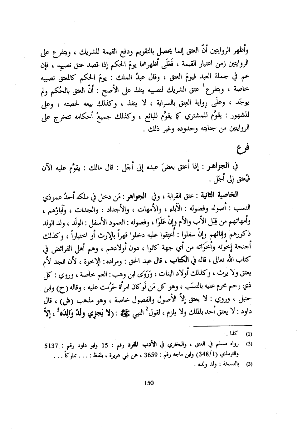 فِي الْجَوَاهِرِ إِذَا أَعْتَقَ بَعْضَ عَبْدِهِ إِلَى أَجَلٍ قَالَ مَالِكٌ يُقَوَّمُ عَلَيْهِ الْآنَ فَيُعْتَقُ إِلَى أَجَلٍ الْخَاصِّيَّةُ الثَّانِيَةُ عِتْقُ الْقَرَابَةِ وَفِي الْجَوَاهِرِ مَنْ دَخَلَ فِي مِلْكِهِ أَحَدُ عَمُودَيِ النَّسَبِ أُصُولُهُ وَفُصُولُهُ الْآبَاءُ وَالْأُمَّهَاتُ وَالْأَجْدَادُ وَالْجَدَّاتُ وَآبَاؤُهُمْ وَأُمَّهَاتُهُمْ مِنْ قِبَلِ الْأَبِ وَالْأُمِّ وَإِنْ عَلَوْا وَفُصُولُهُ العمود الاسفل الْوَلَد وَلَدُ الْوَلَدِ ذُكُورُهُمْ وَإِنَاثُهُمْ وَإِنْ سَفُلُوا أُعْتِقُوا عَلَيْهِ دخلُوا قهرا بالارث اَوْ أختيار وَكَذَلِكَ أَجْنِحَة إِخْوَتُهُ وَأَخَوَاتُهُ مِنْ أَيِّ جِهَةٍ كَانُوا دُونَ أَوْلَادِهِمْ وَهُمْ أَهْلُ الْفَرَائِضِ فِي كِتَابِ اللَّهِ تَعَالَى قَالَهُ فِي الْكِتَابِ قَالَ عَبْدُ الْحَقِّ وَمُرَادُهُ الْإِخْوَةُ لِأَنَّ الْجَدَّ لِأُمٍّ يُعْتَقُ وَلَا يَرِثُ وَكَذَلِكَ أَوْلَادُ الْبَنَاتِ وَرَوَى ابْنُ وَهْبٍ الْعَمُّ خَاصَّةً وَرُوِيَ كُلُّ ذِي رَحِمٍ مُحَرَّمٍ عَلَيْهِ بِالنَّسَبِ وَهُوَ كُلُّ مَنْ لَوْ كَانَ امْرَأَةً حَرُمَتْ عَلَيْهِ وَقَالَهُ ح وَابْنُ حَنْبَلٍ وَرُوِيَ لَا يُعْتَقُ إِلَّا الْأُصُولُ وَالْفُصُولُ خَاصَّةً وَهُوَ مَذْهَبُ ش قَالَ دَاوُدُ لَا يُعْتَقُ أَحَدٌ بِالْمِلْكِ وَلَا يَلْزَمُ لِقَوْلِ النَّبِيِّ - صَلَّى اللَّهُ عَلَيْهِ وَسَلَّم َ - لَا يَجْزِي وَلَدٌ وَالِدَهُ إِلَّا