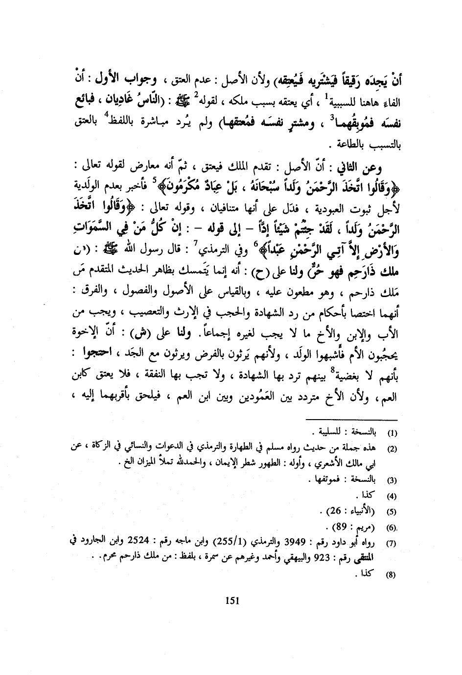 أَنْ يَجِدَهُ رَقِيقًا فَيَشْتَرِيهِ فَيُعْتِقُهُ وَلِأَنَّ الْأَصْلَ عَدَمُ الْعِتْقِ وَجَوَابُ الْأَوَّلِ أَنَّ الْفَاءَ هَاهُنَا لِلسَّبَبِيَّةِ أَيْ يُعْتِقُهُ بِسَبَبِ مُلْكِهِ لِقَوْلِهِ - صَلَّى اللَّهُ عَلَيْهِ وَسَلَّم َ - النَّاس غاديان فبائع نَفسه فموبقهما وَمُشْتَرٍ نَفْسَهُ فَمُعْتِقُهَا وَلَمْ يَرِدْ مُبَاشَرَةً بِاللَّفْظِ بِالْعِتْقِ بِالتَّسَبُّبِ بِالطَّاعَةِ وَعَنِ الثَّانِي أَنَّ الْأَصْلَ تَقَدُّمُ الْمِلْكِ فَيُعْتَقُ ثُمَّ إِنَّهُ مُعَارِضٌ لِقَوْلِهِ تَعَالَى {وَقَالُوا اتَّخَذَ الرَّحْمَنُ وَلَدًا سُبْحَانَهُ بَلْ عباد مكرمون} فَأخْبر بعد الولدية لاجل ثُبُوت الْعُبُودِيَّة فَدلَّ على أَنَّهَا مُتَنَافِيَانِ وقَوْله تَعَالَى {وَقَالُوا اتَّخَذَ الرَّحْمَنُ وَلَدًا لقد جئْتُمْ شَيْئا إدا إِلَى قَوْله إِن كل من فِي السَّمَوَات وَالْأَرْض إِلَّا آتِي الرَّحْمَن عبدا} وَفِي التِّرْمِذِيِّ قَالَ رَسُولُ اللَّهِ - صَلَّى اللَّهُ عَلَيْهِ وَسَلَّم َ - مَنْ مَلَكَ ذَا رَحِمٍ فَهُوَ حُرٌّ وَلَنَا عَلَى ح أَنَّهُ إِنَّمَا يُتَمَسَّكُ بِظَاهِرِ الْحَدِيثِ الْمُتَقَدِّمِ مَنْ مَلَكَ ذَا رَحِمٍ وَهُوَ مَطْعُونٌ عَلَيْهِ وَبِالْقِيَاسِ عَلَى الْأُصُولِ وَالْفُصُولِ وَالْفَرْقُ أَنَّهُمَا اخْتَصَّا بِأَحْكَامِ مِنْ رَدِّ الشَّهَادَةِ وَالْحَجْبِ فِي الْإِرْثِ وَالتَّعْصِيبِ وَيَجِبُ مِنَ الْأَبِ وَالِابْنِ وَالْأَخِ مَا لَا يَجِبُ لِغَيْرِهِ إِجْمَاعًا وَلَنَا عَلَى ش أَنَّ الْإِخْوَةَ يَحْجُبُونَ الْأُمَّ فَأَشْبَهُوا الْوَلَدَ وَلِأَنَّهُمْ يَرِثُونَ بِالْفَرْضِ وَيَرِثُونَ مَعَ الْجِدِّ احْتَجُّوا بِأَنَّهُم لَا بغضية بَيْنَهُمْ تُرَدُّ بِهَا الشَّهَادَةُ وَلَا تَجِبُ بِهَا النَّفَقَةُ فَلَا يُعْتَقُ كَابْنِ الْعَمِّ وَلِأَنَّ الْأَخَ مُتَرَدِّدٌ بَيْنَ الْعَمُودَيْنِ وَبَيْنَ ابْنِ الْعَمِّ فَيُلْحَقُ بأقربهما إِلَيْهِ