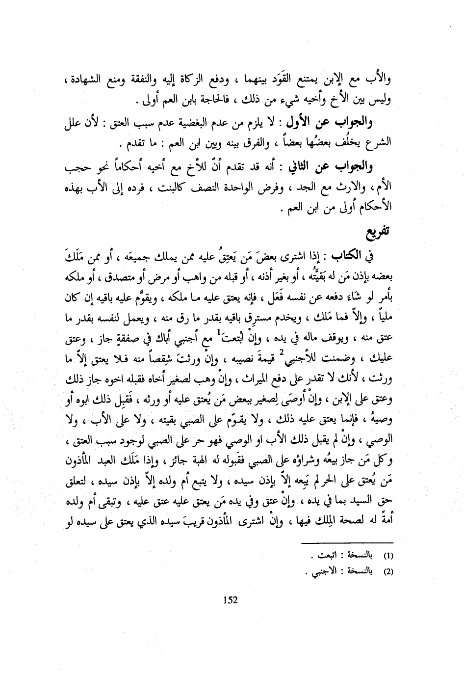 فِي الْكِتَابِ إِذَا اشْتَرَى بَعْضَ مَنْ يُعْتَقُ عَلَيْهِ مِمَّنْ يَمْلِكُ جَمِيعَهُ أَوْ مِمَّنْ مَلَكَ بَعْضَهُ بِإِذْنِ مَنْ لَهُ بَقِيَّتُهُ أَوْ بِغَيْرِ إِذْنِهِ أَوْ قبله من واهب اَوْ مرض أَوْ مُتَصَدِّقٍ أَوْ مَلَكَهُ بِأَمْرٍ لِوْ شَاءَ دَفَعَهُ عَنْ نَفْسِهِ فَعَلَ فَإِنَّهُ يُعْتَقُ عَلَيْهِ مَا مَلَكَهُ وَيُقَوَّمُ عَلَيْهِ بَاقِيهِ إِنْ كَانَ مَلِيًّا وَإِلَّا فَمَا مَلَكَ وَيَخْدُمُ مُسْتَرَقَّ بَاقِيهِ بِقَدْرِ مَا رَقَّ مِنْهُ وَيَعْمَلُ لِنَفْسِهِ بِقَدْرِ مَا عَتَقَ مِنْهُ وَيُوقَفُ مَالُهُ فِي يَدِهِ وَإِن اتبعت مَعَ أَجْنَبِيٍّ أَبَاكَ فِي صَفْقَةٍ جَازَ وَعَتَقَ عَلَيْكَ وَضَمِنْتَ لِلْأَجْنَبِيِّ قِيمَةَ نَصِيبِهِ وَإِنْ وَرِثْتَ شِقْصًا مِنْهُ فَلَا يُعْتَقُ إِلَّا مَا وَرِثْتَ لِأَنَّكَ لَا تَقْدِرُ عَلَى دَفْعِ الْمِيرَاثِ وَإِنْ وهب لصغير أَخَاهُ فَقبله اخوه جَازَ ذَلِكَ وَعَتَقَ عَلَى الِابْنِ وَإِنْ أَوْصَى لِصَغِيرٍ بِبَعْضِ مَنْ يُعْتَقُ عَلَيْهِ أَوْ وَرِثَهُ فَقَبِلَ ذَلِكَ أَبُوهُ أَوْ وَصِيُّهُ فَإِنَّمَا يُعْتَقُ عَلَيْهِ ذَلِكَ وَلَا يُقَوَّمُ عَلَى الصَّبِيِّ بَقِيَّتُهُ وَلَا عَلَى الْأَبِ وَلَا الْوَصِيِّ وَإِنْ لَمْ يَقْبَلْ ذَلِكَ الْأَبُ أَوِ الْوَصِيُّ فَهُوَ حُرٌّ عَلَى الصَّبِيِّ لِوُجُودِ سَبَبِ الْعِتْقِ وَكُلُّ مَنْ جَازَ بَيْعُهُ وَشِرَاؤُهُ عَلَى الصَّبِيِّ فَقَبُولُهُ لَهُ الْهِبَة جَائِز وَإِذا مَلَكَ الْعَبْدُ الْمَأْذُونُ مَنْ يُعْتَقُ عَلَى الْحُرِّ لم يَبِعْهُ إِلَّا بِإِذن سَيّده وَلَا يتبع أُمَّ وَلَدِهِ إِلَّا بِإِذْنِ سَيِّدِهِ لِتَعَلُّقِ حَقِّ السَّيِّدِ بِمَا فِي يَدِهِ وَإِنْ عَتَقَ وَفِي يَدِهِ مَنْ يُعْتَقُ عَلَيْهِ عَتَقَ عَلَيْهِ وَتَبْقَى أُمُّ وَلَدِهِ أَمَةً لَهُ لِصِحَّةِ الْمِلْكِ فِيهَا وَإِنِ اشْتَرَى الْمَأْذُونُ قَرِيبَ سَيِّدِهِ الَّذِي يُعْتَقُ عَلَى سَيِّدِهِ لَوْ