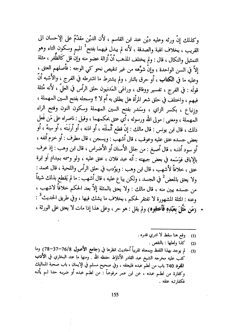 وَكَذَلِكَ إِنْ وَرِثَهُ وَعَلَيْهِ دَيْنٌ عِنْدَ ابْنِ الْقَاسِمِ لِأَنَّ الدَّيْنَ مُقَدَّمٌ عَلَى الْإِحْسَانِ إِلَى الْقَرِيبِ بِخِلَافِ الْهِبَةِ وَالصَّدَقَةِ لِأَنَّهُ لَمْ يُبْدَلْ فيهمَا بِفَتْح الْمِيم وَسُكُون التَّاء وَهُوَ التَّمْثِيلُ وَالنَّكَالُ قَالَ وَلَمْ يَخْتَلِفِ الْمَذْهَبُ أَنَّ إِزَالَةَ عُضْوٍ مِنْهُ وَإِنْ قَلَّ كَالظُّفْرِ مُثْلَةٌ إِلَّا فِي السِّنِّ الْوَاحِدَةِ وَإِنْ شَوَّهَهُ مِنْ غَيْرِ تَنْقِيصٍ نَحْوَ كَيِّ الْوَجْهِ فَأَصْلُهُمُ الْعِتْقُ وَعَلَيْهِ مَا فِي الْكِتَابِ أَوْ حُرِّقَ بالنَّار وَلم يَشْتَرِطه فِي الْفَرْجِ وَالْأَشْبَهُ أَنَّ قَوْلَهُ فِي الْفَرْجِ تَفْسِيرٌ وَوِفَاقٌ وَرَاعَى الْمَدَنِيُّونَ حَلْقَ الرَّأْسِ فِي الْعَلِيِّ لِأَنَّهُ مُثْلَةٌ فِيهِمْ وَاخْتُلِفَ فِي حَلْقِ شَعْرِ الْمَرْأَةِ هَلْ يُطَلِّقُ بِهِ أَمْ لَا وَسَجْلِهِ بِفَتْحِ السِّينِ الْمُهْمَلَةِ وَزِنْبَاعٍ بِكَسْرِ الزَّايِ وَسَنْدَرَ بِفَتْحِ السِّينِ الْمُهْمَلَةِ وَسُكُونِ النُّونِ وَفَتْحِ الرَّاء الْمُهْمَلَةِ وَمَعْنَى مَوْلَى اللَّهِ وَرَسُولِهِ أَيْ عَتَقَ بِحُكْمِهِمَا وَقِيلَ نَاصَرَاهُ عَلَى مَنْ فَعَلَ ذَلِكَ قَالَ ابْنُ يُونُسَ قَالَ مَالِكٌ إِنْ قَطَعَ أُنْمُلَتَهُ أَوْ أُذُنَهُ أَوْ أَرْنَبَتَهُ أَوْ سِنَّهُ أَوْ بَعْضَ جَسَدِهِ عَتَقَ عَلَيْهِ وَعُوقِبَ قَالَ أَشْهَبُ وَيُسْجَنُ قَالَ مُطَرِّفٌ أَوْ خَزَمَ أَنْفَهُ أَوْ سَوَّدَ أُذُنَهُ قَالَ أَصْبَغُ مَنْ جَلَّلَ الْأَسْنَانَ أَوِ الْأَضْرَاسَ قَالَ ابْنُ وَهْبٍ إِذْ عُرِفَ بِالْإِبَاقِ فَوَسَمَهُ فِي بَعْضِ جَبْهَتِهِ أَنَّهُ عَبْدُ فُلَانٍ عَتَقَ عَلَيْهِ وَلَوْ وَسَمَهُ بِمِدَادٍ أَوْ إِبْرَةٍ عَتَقَ خِلَافًا لِأَشْهَبَ قَالَ ابْنُ وَهْبٍ وَيُؤَدَّبُ فِي حَلْقِ الرَّأْسِ وَاللِّحْيَةِ قَالَ مُحَمَّدٌ وَلَا يُعْتَقُ بِالْمَعْضِ فِي الْجَسَدِ وَلَكِنْ يُبَاعُ عَلَيْهِ قَالَ أَشْهَبُ مَا لَمْ يَقْطَعْ بِذَلِكَ شَيْئًا مِنْ جَسَدِهِ يَبِينُ مِنْهُ قَالَ مَالِكٌ وَلَا يُعْتَقُ بِالْمُثْلَةِ إِلَّا بَعْدَ الْحُكْمِ خِلَافًا لِأَشْهَبَ وَعَنْهُ الْمُثْلَةُ الْمَشْهُورَةُ لَا تَفْتَقِرُ لحكم بِخِلَاف مَا يشك فِيهَا وَفِي طَرِيق الْحَدِيثِ مَنْ مَثَّلَ بِعَبْدِهِ فَأَعْتِقُوهُ وَلَمْ يَقُلْ هُوَ حُرٌّ وَعَلَى هَذَا إِذَا مَاتَ لَا يُعْتَقُ عَلَى الْوَرَثَةِ