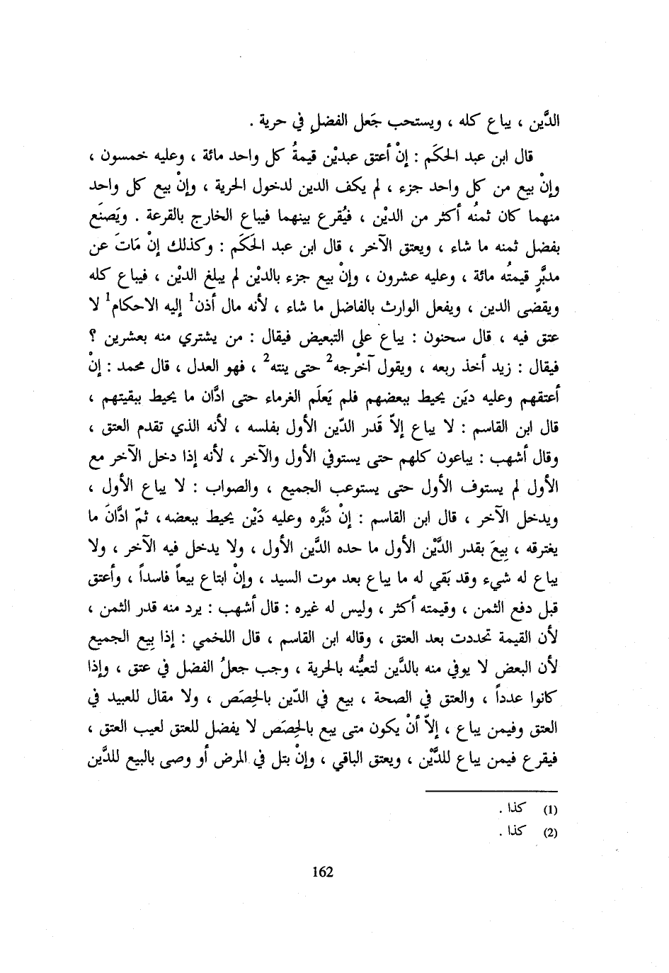 الدّين يُبَاع كُلُّهُ وَيُسْتَحَبُّ جَعْلُ الْفَضْلِ فِي حُرِّيَّةٍ قَالَ ابْنُ عَبْدِ الْحَكَمِ إِنْ أَعْتَقَ عَبْدَيْنِ قِيمَةُ كُلِّ وَاحِدٍ مِائَةٌ وَعَلَيْهِ خَمْسُونَ وَإِنْ بِيعَ مِنْ كُلِّ وَاحِدٍ جُزْءٌ لَمْ يَكْفِ الدَّيْنُ لِدُخُولِ الْحُرِّيَّةِ وَإِنْ بِيعَ كُلُّ وَاحِدٍ مِنْهُمَا كَانَ ثَمَنُهُ أَكْثَرَ مِنَ الدَّيْنِ فَيُقْرَعُ بَيْنَهُمَا فَيُبَاعُ الْخَارِجُ بِالْقُرْعَةِ وَيُصْنَعُ بِفَضْلِ ثَمَنِهِ مَا شَاءَ وَيعتق الآخر قَالَ ابْن عبد الْحَكَمِ وَكَذَلِكَ إِنْ مَاتَ عَنْ مُدَبَّرٍ قِيمَتُهُ مِائَةٌ وَعَلَيْهِ عِشْرُونَ وَإِنْ بِيعَ جُزْءٌ بِالدَّيْنِ لَمْ يَبْلُغِ الدَّيْنُ فَيُبَاعُ كُلُّهُ وَيُقْضَى الدَّيْنُ وَيَفْعَلُ الْوَارِثُ بِالْفَاضِلِ مَا شَاءَ لِأَنَّهُ مَالٌ أذن إِلَيْهِ الاحكام لَا عِتْقَ فِيهِ قَالَ سَحْنُونٌ يُبَاعُ عَلَى التَّبْعِيضِ فَيُقَالُ مَنْ يَشْتَرِي مِنْهُ بِعِشْرِينَ فَيُقَالُ زَيْدٌ اخذ ربعه وَيَقُول أخرجه حَتَّى ينْتَه فَهُوَ الْعَدْلُ قَالَ مُحَمَّدٌ إِنْ أَعْتَقَهُمْ وَعَلَيْهِ دَيْنٌ يُحِيطُ بِبَعْضِهِمْ فَلَمْ يَعْلَمِ الْغُرَمَاءُ حَتَّى أَدَّانَ مَا يُحِيطُ بِبَقِيَّتِهِمْ قَالَ ابْنُ الْقَاسِمِ لَا يُبَاعُ إِلَّا قَدْرُ الدَّيْنِ الْأَوَّلِ بِفَلَسِهِ لِأَنَّهُ الَّذِي تَقَدَّمَ الْعِتْقَ وَقَالَ أَشْهَبُ يُبَاعُونَ كُلَّهُمْ حَتَّى يَسْتَوْفِيَ الْأَوَّلَ وَالْآخِرَ لِأَنَّهُ إِذَا دَخَلَ الْآخَرُ مَعَ الْأَوَّلِ لَمْ يَسْتَوْفِ الْأَوَّلُ حَتَّى يَسْتَوْعِبَ الْجَمِيعَ وَالصَّوَابُ لَا يُبَاعُ الْأَوَّلُ وَيَدْخُلُ الْآخَرُ قَالَ ابْنُ الْقَاسِمِ إِنْ دَبَّرَهُ وَعَلَيْهِ دَيْنٌ يُحِيطُ بِبَعْضِهِ ثُمَّ ادَّانَ مَا يغترقه بِيعَ بِقَدْرِ الدَّيْنِ الْأَوَّلِ مَا حَدُّهُ الدَّيْنُ الْأَوَّلُ وَلَا يُدْخَلُ فِيهِ الْآخَرُ وَلَا يُبَاعُ لَهُ شَيْءٌ وَقَدْ بَقِيَ لَهُ مَا يُبَاعُ بَعْدَ مَوْتِ السَّيِّدِ وَإِنِ ابْتَاعَ بَيْعًا فَاسِدًا وَأَعْتَقَ قَبْلَ دَفْعِ الثَّمَنِ وَقِيمَتُهُ أَكْثَرُ وَلَيْسَ لَهُ غَيْرُهُ قَالَ أَشْهَبُ يُرَدُّ مِنْهُ قَدْرُ الثَّمَنِ لِأَنَّ الْقِيمَةَ تَحَدَّدَتْ بَعْدَ الْعِتْقِ وَقَالَهُ ابْنُ الْقَاسِمِ قَالَ اللَّخْمِيُّ إِذَا بِيعَ الْجَمِيعُ لِأَن الْبَعْض لَا يُوفي مِنْهُ بِالدّينِ لتعينه بِالْحُرِّيَّةِ وَجَبَ جَعْلُ الْفَضْلِ فِي عِتْقٍ وَإِذَا كَانُوا عَدَدًا وَالْعِتْقُ فِي الصِّحَّةِ بِيعَ فِي الدَّيْنِ بِالْحِصَصِ وَلَا مَقَالَ لِلْعَبِيدِ فِي الْعِتْقِ وفيمن يُبَاع إِلَّا أَن يكون مَتى يبع بِالْحِصَصِ لَا يَفْضُلُ لِلْعِتْقِ لِعَيْبِ الْعِتْقِ فَيُقْرَعُ فِيمَنْ يُبَاعُ لِلدَّيْنِ وَيُعْتَقُ الْبَاقِي وَإِنْ بَتَلَ فِي الْمَرَضِ أَوْ وَصَّى بِالْبَيْعِ لِلدَّيْنِ