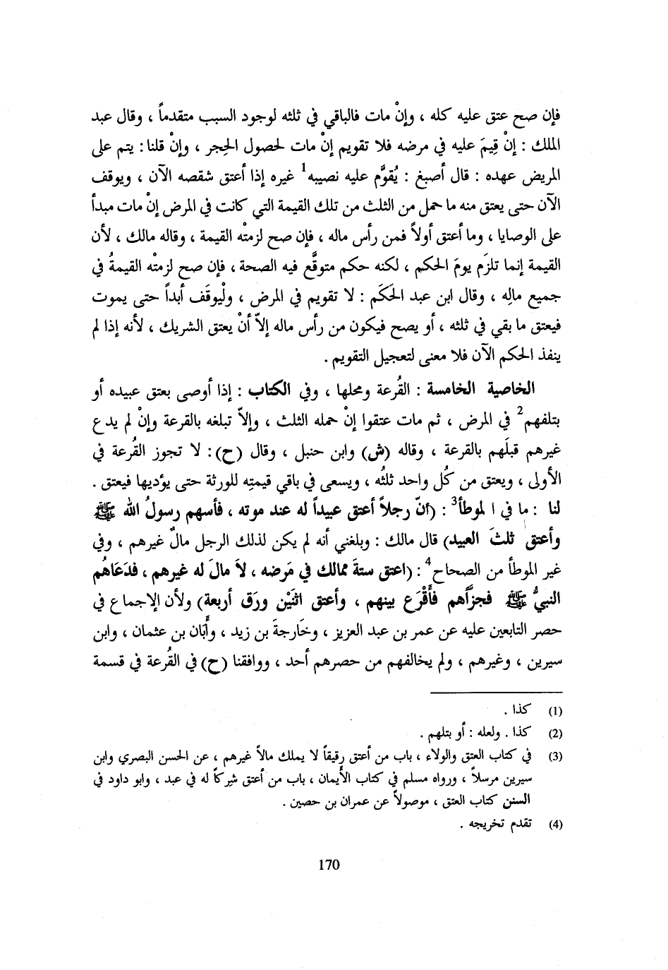 فَإِنْ صَحَّ عُتِقَ عَلَيْهِ كُلُّهُ وَإِنْ مَاتَ فَالْبَاقِي فِي ثُلُثِهِ لِوُجُودِ السَّبَبِ مُتَقَدِّمًا وَقَالَ عَبْدُ الْمَلِكِ إِنْ قُيِّمَ عَلَيْهِ فِي مَرَضِهِ فَلَا تَقْوِيمَ إِنْ مَاتَ لِحُصُولِ الْحَجْرِ وَإِنْ قُلْنَا يُتَمُّ عَلَى الْمَرِيضِ عَهْدُهُ قَالَ أَصْبَغُ يقوم عَلَيْهِ نصِيبه غَيْرِهِ إِذَا أَعْتَقَ شِقْصَهُ الْآنَ وَيُوقَفُ الْآنَ حَتَّى يُعْتَقَ مِنْهُ مَا حَمَلَ مِنَ الثُّلُثِ مِنْ تِلْكَ الْقَيِّمَةِ الَّتِي كَانَتْ فِي الْمَرَضِ إِنْ مَاتَ مُبَدَّأً عَلَى الْوَصَايَا وَمَا أَعْتَقَ أَوَّلًا فَمِنْ رَأْسِ مَالِهِ فَإِنْ صَحَّ لَزِمَتْهُ الْقِيمَةُ وَقَالَهُ مَالِكٌ لِأَنَّ الْقِيمَةَ إِنَّمَا تَلْزَمُ يَوْمَ الْحُكْمِ لَكِنَّهُ حُكْمٌ مُتَوَقَّعٌ فِيهِ الصِّحَّةُ فَإِنْ صَحَّ لَزِمَتْهُ الْقِيمَةُ فِي جَمِيعِ مَالِهِ وَقَالَ ابْنُ عَبْدِ الْحَكَمِ لَا تَقْوِيمَ فِي الْمَرَضِ وَلْيُوقَفْ أَبَدًا حَتَّى يَمُوتَ فَيُعْتَقُ مَا بَقِيَ فِي ثُلُثِهِ أَوْ يَصِحُّ فَيَكُونُ مِنْ رَأْسِ مَالِهِ إِلَّا أَنْ يَعْتِقَ الشَّرِيكُ لِأَنَّهُ إِذَا لَمْ يَنْفُذِ الْحُكْمُ الْآنَ فَلَا مَعْنَى لِتَعْجِيلِ التَّقْوِيمِ الْخَاصِّيَّةُ الْخَامِسَةُ الْقُرْعَةُ وَمَحَلُّهَا وَفِي الْكتاب إِذا أوصى بِعِتْق عبيده اَوْ بتلفهم فِي الْمَرَضِ ثُمَّ مَاتَ عَتَقُوا إِنْ حَمَلَهُ الثُّلُث وَإِلَّا تبلغه بِالْقُرْعَةِ وَإِن لم يدع غَيرهم قبلهم بِالْقُرْعَةِ وَقَالَهُ ش وَابْنُ حَنْبَلٍ وَقَالَ ح لَا تَجُوزُ الْقُرْعَةُ فِي الْأَوْلَى وَيُعْتَقُ مِنْ كُلِّ وَاحِدٍ ثُلُثُهُ وَيُسَعَّى فِي بَاقِي قِيمَتِهِ لِلْوَرَثَةِ حَتَّى يُؤَدِّيَهَا فَيُعْتَقَ لَنَا مَا فِي الْمُوَطَّأِ إِنَّ رَجُلًا أَعْتَقَ عَبِيدًا لَهُ عِنْدَ مَوْتِهِ فَأَسْهَمَ رَسُولُ اللَّهِ - صَلَّى اللَّهُ عَلَيْهِ وَسَلَّم َ - وَأَعْتَقَ ثُلُثَ الْعَبِيدِ قَالَ مَالِكٌ وَبَلَغَنِي أَنَّهُ لَمْ يَكُنْ لِذَلِكَ الرَّجُلِ مَالٌ غَيْرَهُمْ وَفِي غير الْمُوَطَّأ من الصِّحَاح أعتق سِتَّة ممالك فِي مَرَضِهِ لَا مَالَ لَهُ غَيْرُهُمْ فَدَعَاهُمُ النَّبِي - صَلَّى اللَّهُ عَلَيْهِ وَسَلَّم َ - فَجَزَّأَهُمْ فَأَقْرَعَ بَيْنَهُمْ وَأَعْتَقَ اثْنَيْنِ وَرَقَّ أَرْبَعَةً وَلِأَن الْإِجْمَاع فِي حصر التَّابِعِينَ عَلَيْهِ عَنْ عُمَرَ بْنِ عَبْدِ الْعَزِيزِ وَخَارِجَةَ بْنِ زَيْدٍ وَأَبَانَ بْنِ عُثْمَانَ وَابْنِ سِيرِين وَغَيرهم وَلم يخالفهم من حصرهم أَحَدٌ وَوَافَقَنَا ح فِي الْقُرْعَةِ فِي قِسْمَةٍ