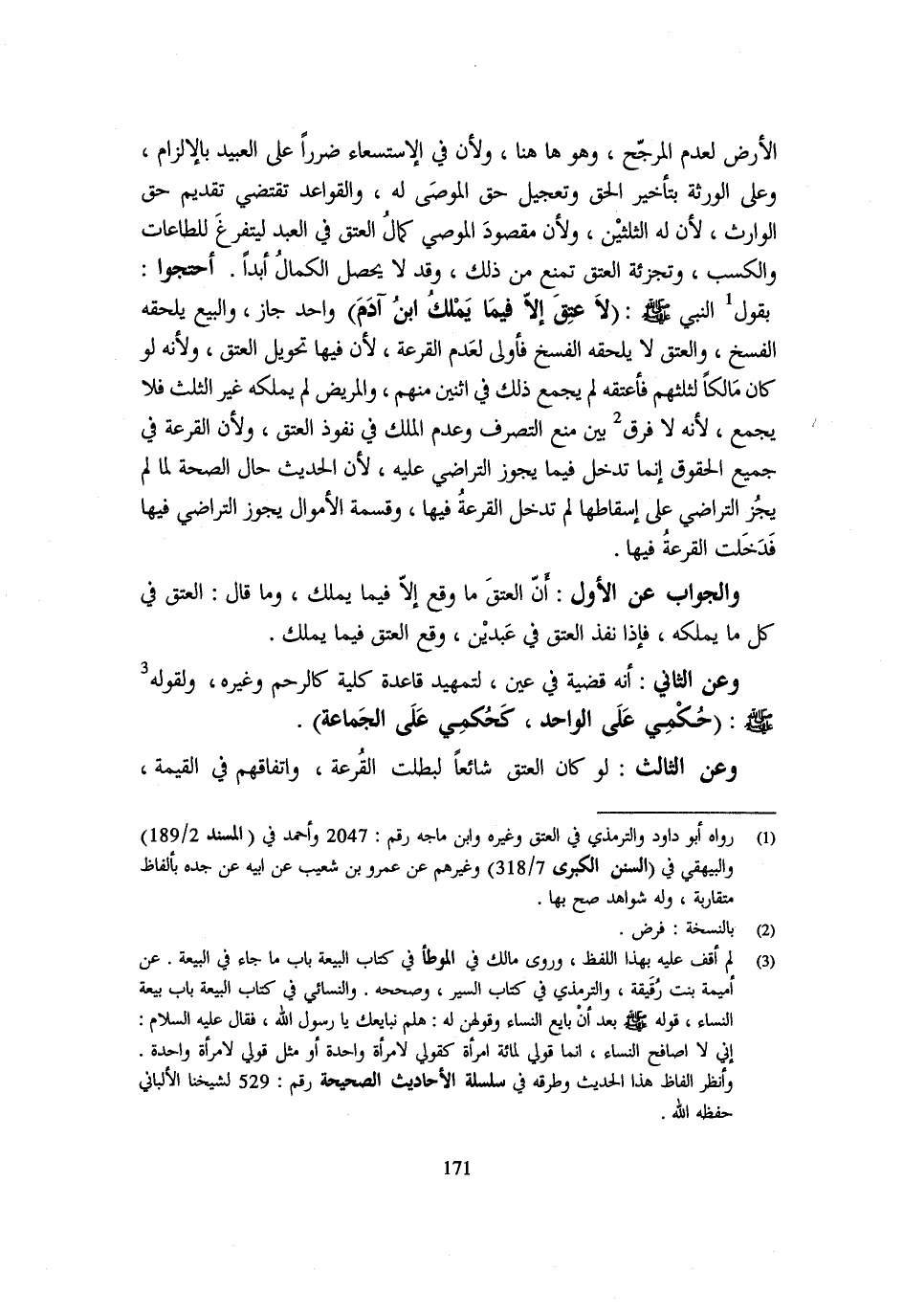 الْأَرْضِ لِعَدَمِ الْمُرَجِّحِ وَهُوَ هَاهُنَا وَلِأَنَّ فِي الِاسْتِسْعَاءِ ضَرَرًا عَلَى الْعَبِيدِ بِالْإِلْزَامِ وَعَلَى الْوَرَثَةِ بِتَأْخِيرِ الْحَقِّ وَتَعْجِيلِ حَقِّ الْمُوصَى لَهُ وَالْقَوَاعِدُ تَقْتَضِي تَقْدِيمَ حَقِّ الْوَارِثِ لِأَنَّ لَهُ الثُّلُثُيْنِ وَلِأَنَّ مَقْصُودَ الْمُوصِي كَمَالُ الْعِتْقِ فِي الْعَبْدِ لِيَتَفَرَّغَ لِلطَّاعَاتِ وَالْكَسْبِ وَتَجْزِئَةُ الْعِتْقِ تَمْنَعُ مِنْ ذَلِكَ وَقَدْ لَا يَحْصُلُ الْكَمَالُ أَبَدًا احْتَجُّوا بِقَوْلِ النَّبِيِّ - صَلَّى اللَّهُ عَلَيْهِ وَسَلَّم َ - لَا عِتْقَ إِلَّا فِيمَا يَمْلِكُ ابْنُ آدَمَ وَاحِد جَازَ وَالْبَيْعُ يَلْحَقُهُ الْفَسْخُ وَالْعِتْقُ لَا يَلْحَقُهُ الْفَسْخُ فَأَوْلَى لِعَدَمِ الْقُرْعَةِ لِأَنَّ فِيهَا تَحْوِيلَ الْعِتْقِ وَلِأَنَّهُ لَوْ كَانَ مَالِكًا لِثُلُثِهِمْ فَأَعْتَقَهُ لَمْ يَجْمَعْ ذَلِكَ فِي اثْنَيْنِ مِنْهُمْ وَالْمَرِيضُ لَمْ يملكهُ غَيْرَ الثُّلُثِ فَلَا يُجْمَعُ لِأَنَّهُ لَا فَرْقَ بَيْنَ مَنْعِ التَّصَرُّفِ وَعَدَمِ الْمِلْكِ فِي نُفُوذِ الْعِتْقِ وَلِأَنَّ الْقُرْعَةَ فِي جَمِيعِ الْحُقُوقِ إِنَّمَا تَدْخُلُ فِيمَا يَجُوزُ التَّرَاضِي عَلَيْهِ لِأَنَّ الْحَدِيثَ حَالَ الصِّحَّةِ لَمَّا لَمْ يَجُزِ التَّرَاضِي عَلَى إِسْقَاطِهَا لَمْ تَدْخُلِ الْقُرْعَةُ فِيهَا وَقِسْمَةُ الْأَمْوَالِ يَجُوزُ التَّرَاضِي فِيهَا فَدَخَلَتِ الْقُرْعَةُ فِيهَا وَالْجَوَابُ عَنِ الْأَوَّلِ أَنَّ الْعِتْقَ مَا وَقَعَ إِلَّا فِيمَا يَمْلِكُ وَمَا قَالَ الْعِتْقُ فِي كُلِّ مَا يَمْلِكُهُ فَإِذَا نَفَذَ الْعِتْقُ فِي عَبْدَيْنِ وَقَعَ الْعِتْقُ فِيمَا يَمْلِكُ وَعَنِ الثَّانِي أَنَّهُ قَضِيَّةٌ فِي عَيْنٍ لِتَمْهِيدِ قَاعِدَةٍ كُلِّيَّةٍ كَالرَّحِمِ وَغَيره وَلقَوْله - صَلَّى اللَّهُ عَلَيْهِ وَسَلَّم َ - حُكْمِي عَلَى الْوَاحِدِ كَحُكْمِي عَلَى الْجَمَاعَةِ وَعَنِ الثَّالِثِ لَوْ كَانَ الْعِتْقُ شَائِعًا لَبَطَلَتِ الْقُرْعَةُ واتفاقهم فِي الْقيمَة