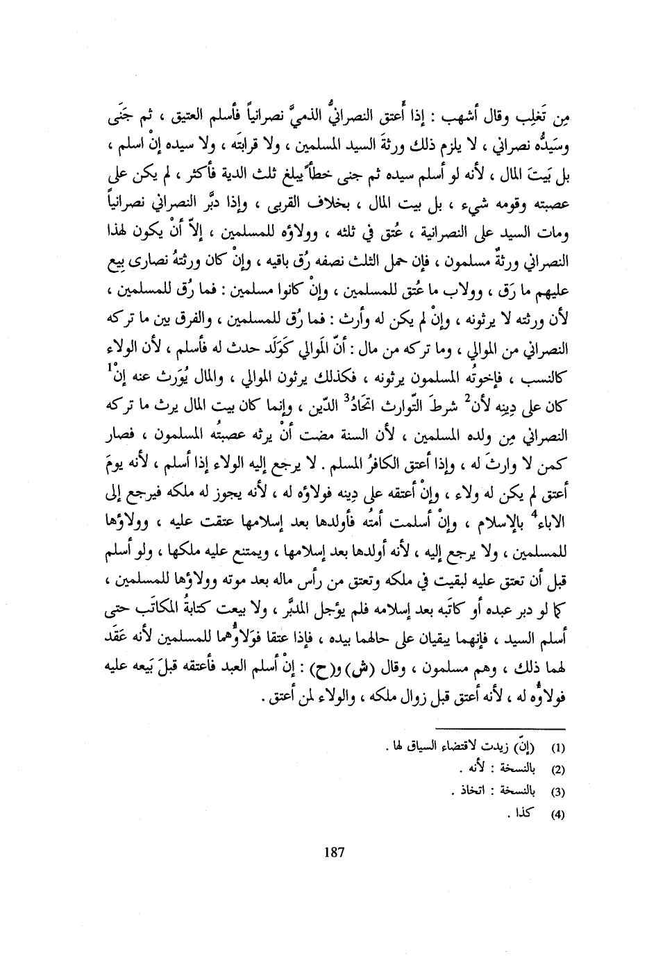 من تَغْلِبَ وَقَالَ أَشْهَبُ إِذَا أَعْتَقَ النَّصْرَانِيُّ الذِّمِّيُّ نَصْرَانِيًّا فَأَسْلَمَ الْعَتِيقُ ثُمَّ جَنَى وَسَيِّدُهُ نَصْرَانِيٌّ لَا يَلْزَمُ ذَلِكَ وَرَثَةَ السَّيِّدِ الْمُسْلِمِينَ وَلَا قرَابَته وَلَا سَيّده إِنْ أَسْلَمَ بَلْ بَيْتُ الْمَالِ لِأَنَّهُ لَوْ أَسْلَمَ سَيِّدُهُ ثُمَّ جَنَى خَطَأً يَبْلُغُ ثُلُثَ الدِّيَةِ فَأَكْثَرَ لَمْ يَكُنْ عَلَى عَصَبَتِهِ وَقَوْمِهِ شَيْءٌ بَلْ بَيْتُ الْمَالِ بِخِلَافِ الْقُرْبَى وَإِذَا دَبَّرَ النَّصْرَانِيُّ نَصْرَانِيًّا وَمَاتَ السَّيِّدُ عَلَى النَّصْرَانِيَّةِ عَتَقَ فِي ثُلُثِهِ وَوَلَاؤُهُ لِلْمُسْلِمِينَ إِلَّا أَنْ يَكُونَ لِهَذَا النَّصْرَانِيِّ وَرَثَةٌ مُسْلِمُونَ فَإِنْ حَمَلَ الثُّلُثُ نِصْفَهُ رَقَّ بَاقِيهِ وَإِنْ كَانَ وَرَثَتُهُ نَصَارَى بيع عَلَيْهِم مَا رق وولاب مَا عَتَقَ لِلْمُسْلِمِينَ وَإِنْ كَانُوا مُسْلِمِينَ فَمَا رَقَّ لِلْمُسْلِمِينَ لِأَنَّ وَرَثَتَهُ لَا يَرِثُونَهُ وَإِنْ لَمْ يَكُنْ لَهُ وَارِثٌ فَمَا رَقَّ لِلْمُسْلِمِينَ وَالْفَرْقُ بَيْنَ مَا تَرَكَهُ النَّصْرَانِيُّ مِنَ الْمَوَالِي وَمَا تَركه من مَال أَن الموَالِي كَوَلَدٍ حَدَثَ لَهُ فَأَسْلَمَ لِأَنَّ الْوَلَاءَ كَالنَّسَبِ فاخوته الْمُسلمُونَ يرثونه فَكَذَلِك يَرِثُونَ الموَالِي وَالْمَالُ يُورَثُ عَنْهُ إِنْ كَانَ عَلَى دِينِهِ لِأَنَّ شَرْطَ التَّوَارُثِ اتِّحَادُ الدِّينِ وَإِنَّمَا كَانَ بَيْتُ الْمَالِ يَرِثُ مَا تَرَكَهُ النَّصْرَانِيُّ مِنْ وَلَدِهِ الْمُسْلِمِينَ لِأَنَّ السُّنَّةَ مَضَتْ أَنْ يَرِثَهُ عَصَبَتُهُ الْمُسْلِمُونَ فَصَارَ كَمَنْ لَا وَارِثَ لَهُ وَإِذَا أَعْتَقَ الْكَافِرُ الْمُسْلِمَ لَا يَرْجِعُ إِلَيْهِ الْوَلَاءُ إِذَا أَسْلَمَ لِأَنَّهُ يَوْمَ أَعْتَقَ لَمْ يَكُنْ لَهُ وَلَاءٌ وَإِنْ أَعْتَقَهُ عَلَى دِينِهِ فَوَلَاؤُهُ لَهُ لِأَنَّهُ يَجُوزُ لَهُ مِلْكُهُ فَيَرْجِعُ إِلَى الاباء بِالْإِسْلَامِ وَإِنْ أَسْلَمَتْ أَمَتُهُ فَأَوْلَدَهَا بَعْدَ إِسْلَامِهَا عَتَقَتْ عَلَيْهِ وَوَلَاؤُهَا لِلْمُسْلِمِينَ وَلَا يَرْجِعُ إِلَيْهِ لِأَنَّهُ أَوْلَدَهَا بَعْدَ إِسْلَامِهَا وَيَمْتَنِعُ عَلَيْهِ مِلْكُهَا وَلَوْ أَسْلَمَ قَبْلَ أَنْ تَعْتِقَ عَلَيْهِ لَبَقِيَتْ فِي مِلْكِهِ وَتُعْتَقُ مِنْ رَأْسِ مَالِهِ بَعْدَ مَوْتِهِ وَوَلَاؤُهَا لِلْمُسْلِمِينَ كَمَا لَوْ دَبَّرَ عَبْدَهُ أَوْ كَاتَبَهُ بَعْدَ إِسْلَامِهِ فَلَمْ يُؤَجِّلِ الْمُدَبَّرَ وَلَا بِيعَتْ كِتَابَةُ الْمُكَاتَبِ حَتَّى أَسْلَمَ السَّيِّدُ فَإِنَّهُمَا يَبْقَيَانِ عَلَى حَالِهِمَا بِيَدِهِ فَإِذَا عَتَقَا فَوَلَاؤُهُمَا لِلْمُسْلِمِينَ لِأَنَّهُ عَقَدَ لَهُمَا ذَلِكَ وَهُمْ مُسلمُونَ وَقَالَ ش وح إِنْ أَسْلَمَ الْعَبْدُ فَأَعْتَقَهُ قَبْلَ بَيْعِهِ عَلَيْهِ فَوَلَاؤُهُ لَهُ لِأَنَّهُ أَعْتَقَ قَبْلَ زَوَالِ مِلْكِهِ وَالْوَلَاءُ لِمَنْ أَعْتَقَ