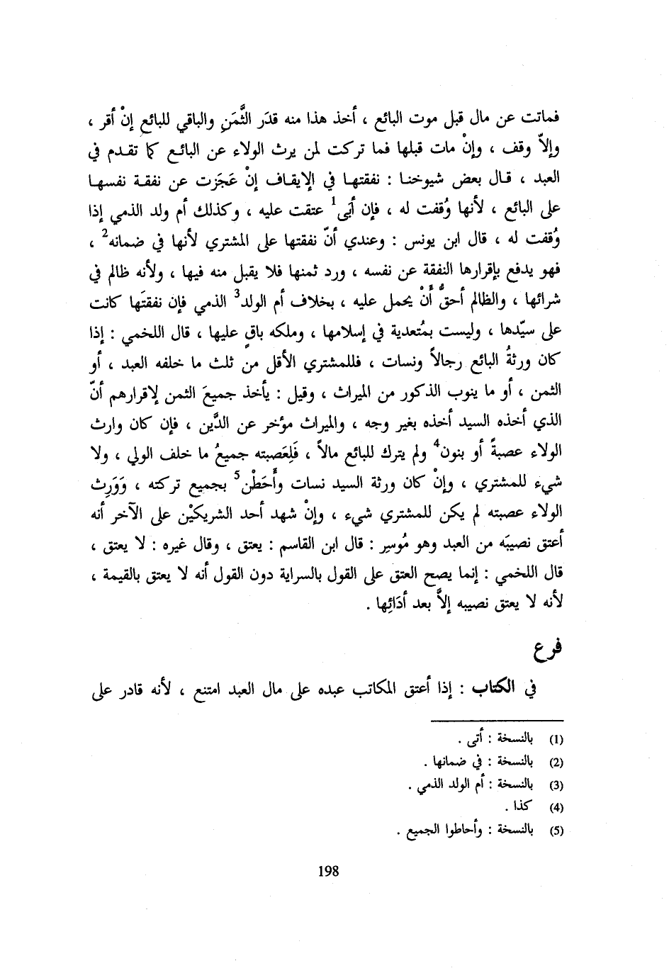 فَمَاتَتْ عَنْ مَالٍ قَبْلَ مَوْتِ الْبَائِعِ أَخَذَ هَذَا مِنْهُ قَدْرَ الثَّمَنِ وَالْبَاقِي لِلْبَائِعِ إِنْ أَقَرَّ وَإِلَّا وُقِفَ وَإِنْ مَاتَ قَبْلَهَا فَمَا تَرَكَتْ لِمَنْ يَرِثُ الْوَلَاءَ عَنِ الْبَائِعِ كَمَا تَقَدَّمَ فِي الْعَبْدِ قَالَ بَعْضُ شُيُوخِنَا نَفَقَتُهَا فِي الْإِيقَافِ إِنْ عَجَزَتْ عَنْ نَفَقَةِ نَفْسِهَا عَلَى الْبَائِعِ لِأَنَّهَا وَقَفَتْ لَهُ فَإِنْ أَبَى عَتَقَتْ عَلَيْهِ وَكَذَلِكَ أُمُّ وَلَدِ الذِّمِّيِّ إِذَا وُقِفَتْ لَهُ قَالَ ابْنُ يُونُسَ وَعِنْدِي أَنَّ نَفَقَتَهَا عَلَى الْمُشْتَرِي لِأَنَّهَا فِي ضَمَانِهِ فَهُوَ يدْفع بإقرارها النَّفَقَةَ عَنْ نَفْسِهِ وَرَدِّ ثَمَنِهَا فَلَا يَقْبَلُ مِنْهُ فِيهَا وَلِأَنَّهُ ظَالِمٌ فِي شِرَائِهَا وَالظَّالِمُ أَحَق أَن يحمل عَلَيْهِ بِخِلَاف أم الْوَلَد الذِّمِّيِّ فَإِنَّ نَفَقَتَهَا كَانَتْ عَلَى سَيِّدِهَا وَلَيْسَتْ بِمُتَعَدِّيَةٍ فِي إِسْلَامِهَا وَمِلْكُهُ بَاقٍ عَلَيْهَا قَالَ اللَّخْمِيّ إِذا كَانَ وَرَثَة البَائِع رجَالًا ونسات فَلِلْمُشْتَرِي الْأَقَلُّ مِنْ ثُلُثِ مَا خَلَّفَهُ الْعَبْدُ أَوِ الثَّمَنُ أَوْ مَا يَنُوبُ الذُّكُورُ مِنَ الْمِيرَاثِ وَقِيلَ يَأْخُذُ جَمِيعَ الثَّمَنِ لِإِقْرَارِهِمْ أَنَّ الَّذِي أَخَذَهُ السَّيِّدُ أَخَذَهُ بِغَيْرِ وَجْهٍ وَالْمِيرَاثُ مُؤَخَّرٌ عَنِ الدَّيْنِ فَإِنْ كَانَ وَارِثُ الْوَلَاءِ عصبَة اَوْ بنُون وَلم يتْرك للْبَائِع مَالا فلعصبته جَمِيع مَا خلف الْوَلِيّ وَلَا شَيْءَ لِلْمُشْتَرِي وَإِنْ كَانَ وَرَثَةُ السَّيِّدِ نسات وَأَحَطْنَ بِجَمِيعِ تَرِكَتِهِ وَوَرِثَ الْوَلَاءَ عَصَبَتُهُ لَمْ يَكُنْ لِلْمُشْتَرِي شَيْءٌ وَإِنْ شَهِدَ أَحَدُ الشَّرِيكَيْنِ عَلَى الْآخَرِ أَنَّهُ أَعْتَقَ نَصِيبَهُ مِنَ الْعَبْدِ وَهُوَ مُوسِرٌ قَالَ ابْنُ الْقَاسِمِ يُعْتَقُ وَقَالَ غَيْرُهُ لَا يُعْتَقُ قَالَ اللَّخْمِيُّ إِنَّمَا يَصِحُّ الْعِتْقُ عَلَى الْقَوْلِ بِالسَّرَايَةِ دُونَ الْقَوْلِ أَنَّهُ لَا يُعْتَقُ بِالْقِيمَةِ لِأَنَّهُ لَا يُعْتَقُ نَصِيبُهُ إِلَّا بَعْدَ أَدَائِهَا