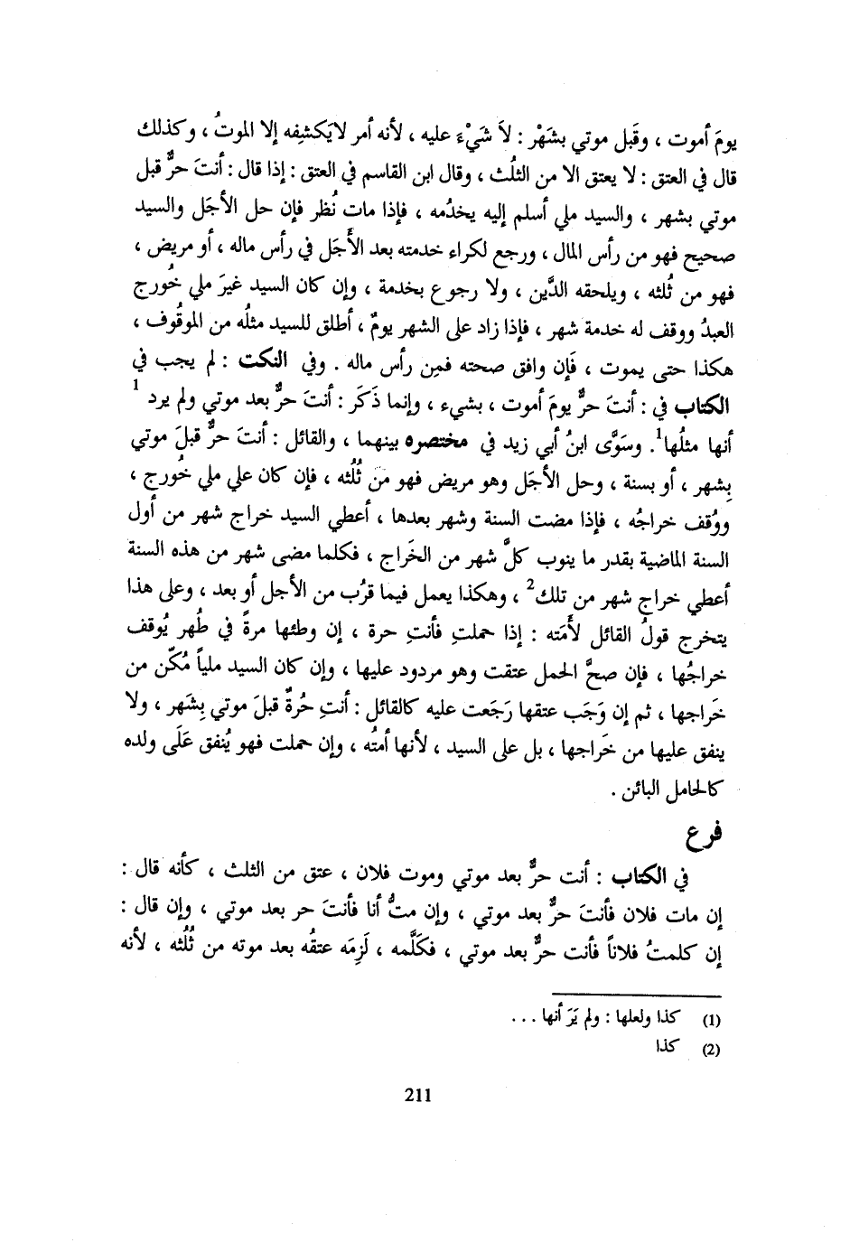 فِي الْكِتَابِ أَنْتَ حُرٌّ بَعْدَ مَوْتِي وَمَوْتِ فُلَانٍ عَتَقَ مِنَ الثُّلُثِ كَأَنَّهُ قَالَ إِنْ مَاتَ فلَان فَأَنت حر بعد موتِي وَإِن مت أَنا فَأَنت حر بعد موتِي وَإِنْ قَالَ إِنْ كَلَّمْتُ فُلَانًا فَأَنْتَ حُرٌّ بَعْدَ مَوْتِي فَكَلَّمَهُ لَزِمَهُ عِتْقُهُ بَعْدَ مَوْتِهِ مِنْ ثُلُثِهِ لِأَنَّهُ