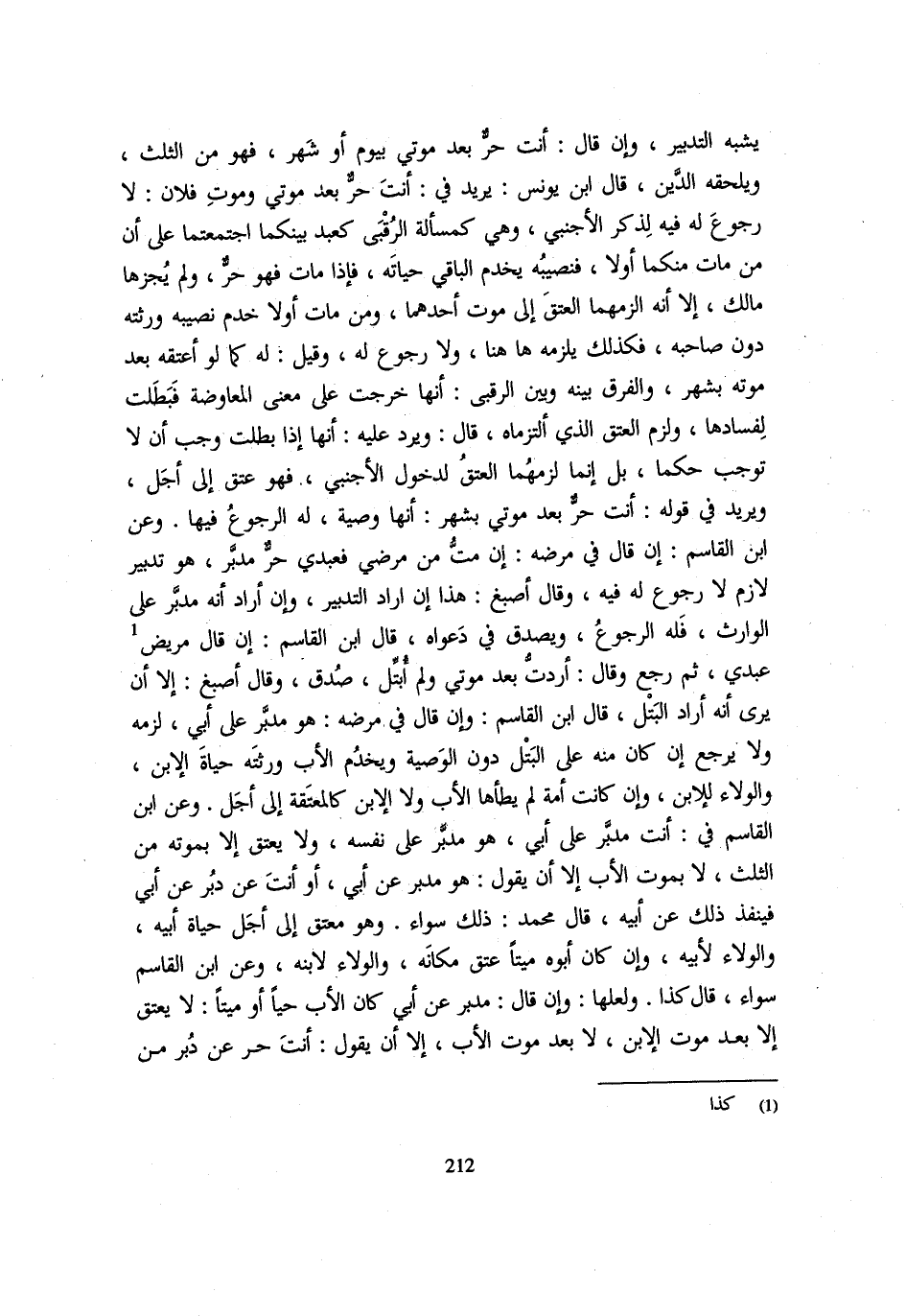 يُشْبِهُ التَّدْبِيرَ وَإِنْ قَالَ أَنْتَ حُرٌّ بَعْدَ مَوْتِي بِيَوْمٍ أَوْ شَهَرٍ فَهُوَ مِنَ الثُّلُثِ وَيَلْحَقُهُ الدَّيْنُ قَالَ ابْنُ يُونُسَ يُرِيدُ فِي أَنْتَ حُرٌّ بَعْدَ مَوْتِي وَمَوْتِ فُلَانٍ لَا رُجُوعَ لَهُ فِيهِ لِذِكْرِ الْأَجْنَبِيِّ وَهِيَ كَمَسْأَلَةِ الرُّقْبَى كَعَبْدٍ بَيْنَكُمَا اجْتَمَعْتُمَا عَلَى أَنَّ مَنْ مَاتَ مِنْكُمَا أَوَّلًا فَنَصِيبُهُ يَخْدُمُ الْبَاقِيَ حَيَاتَهُ فَإِذَا مَاتَ فَهُوَ حُرٌّ وَلَمْ يُجِزْهَا مَالِكٌ إِلَّا أَنَّهُ أَلْزَمَهُمَا الْعِتْقَ إِلَى مَوْتِ أَحَدِهِمَا وَمَنْ مَاتَ أَوَّلًا خَدَمَ نَصِيبُهُ وَرَثَتَهُ دُونَ صَاحِبِهِ فَكَذَلِكَ يَلْزَمُهُ هَاهُنَا وَلَا رُجُوعَ لَهُ وَقِيلَ لَهُ كَمَا لَوْ أَعْتَقَهُ بَعْدَ مَوْتِهِ بِشَهْرٍ وَالْفَرْقُ بَيْنَهُ وَبَيْنَ الرُّقْبَى أَنَّهَا خَرَجَتْ عَلَى مَعْنَى الْمُعَاوَضَةِ فَبَطَلَتْ لِفَسَادِهَا وَلَزِمَ الْعِتْقُ الَّذِي الْتَزَمَاهُ قَالَ وَيُرَدُّ عَلَيْهِ أَنَّهَا إِذَا بطلت وَجب أَن لَا تُوجِبَ حُكْمًا بَلْ إِنَّمَا لَزِمَهُمَا الْعِتْقُ لِدُخُولِ الْأَجْنَبِيِّ فَهُوَ عِتْقٌ إِلَى أَجَلٍ وَيُرِيدُ فِي قَوْلِهِ أَنْتَ حُرٌّ بَعْدَ مَوْتِي بِشَهْرٍ أَنَّهَا وَصِيَّةٌ لَهُ الرُّجُوعُ فِيهَا وَعَنِ ابْنِ الْقَاسِمِ إِنْ قَالَ فِي مَرَضِهِ إِنْ مِتُّ مِنْ مَرَضِي فَعَبْدِي حُرٌّ مُدَبَّرٌ هُوَ تَدْبِيرٌ لَازِمٌ لَا رُجُوعَ لَهُ فِيهِ وَقَالَ أَصْبَغُ هَذَا إِنْ أَرَادَ التَّدْبِيرَ وَإِنْ أَرَادَ أَنَّهُ مُدَبَّرٌ عَلَى الْوَارِثِ فَلَهُ الرُّجُوعُ وَيُصَدَّقُ فِي دَعْوَاهُ قَالَ ابْنُ الْقَاسِمِ إِنْ قَالَ مَرِيضٌ عَبْدِي ثُمَّ رَجَعَ وَقَالَ أَرَدْتُ بَعْدَ مَوْتِي وَلَمْ أُبَتِّلْ صُدِّقَ وَقَالَ أَصْبَغُ إِلَّا أَنْ يَرَى أَنَّهُ أَرَادَ الْبَتْلَ قَالَ ابْنُ الْقَاسِمِ وَإِنْ قَالَ فِي مَرَضِهِ هُوَ مُدَبَّرٌ عَلَى أَبِي لَزِمَهُ وَلَا يَرْجِعُ إِنْ كَانَ مِنْهُ عَلَى البتل دون الْوَصِيَّة ويخدم الْأَب ورثته حَيَاةَ الِابْنِ وَالْوَلَاءُ لِلِابْنِ وَإِنْ كَانَتْ أَمَةً لَمْ يَطَأْهَا الْأَبُ وَلَا الِابْنُ كَالْمُعْتَقَةِ إِلَى أَجَلٍ وَعَنِ ابْنِ الْقَاسِمِ فِي أَنْتَ مُدَبَّرٌ عَلَى أَبِي هُوَ مُدَبَّرٌ عَلَى نَفْسِهِ وَلَا يَعْتِقُ إِلَّا بِمَوْتِهِ مِنَ الثُّلُثِ لَا بِمَوْتِ الْأَبِ إِلَّا أَنْ يَقُولَ هُوَ مُدَبَّرٌ عَنْ أَبِي أَوْ أَنْتَ عَنْ دُبُرٍ عَنْ أَبِي فَيُنَفِّذُ ذَلِكَ عَنْ أَبِيهِ قَالَ مُحَمَّدٌ ذَلِكَ سَوَاءٌ وَهُوَ مُعْتِقٌ إِلَى أَجَلِ حَيَاةِ أَبِيهِ وَالْوَلَاءُ لِأَبِيهِ وَإِنْ كَانَ أَبُوهُ مَيِّتًا عَتَقَ مَكَانَهُ وَالْوَلَاءُ لِابْنِهِ وَعَنِ ابْنِ الْقَاسِمِ سَوَاءٌ قَالَ كَذَا وَلَعَلَّهَا وَإِنْ قَالَ مُدَبَّرٌ عَنْ أَبِي كَانَ الْأَبُ حَيًّا أَوْ مَيِّتًا لَا يُعْتَقُ إِلَّا بَعْدَ مَوْتِ الِابْنِ لَا بَعْدَ مَوْتِ الْأَبِ إِلَّا أَنْ يَقُولَ أَنْتَ حُرٌّ عَنْ دُبُرٍ مِنْ