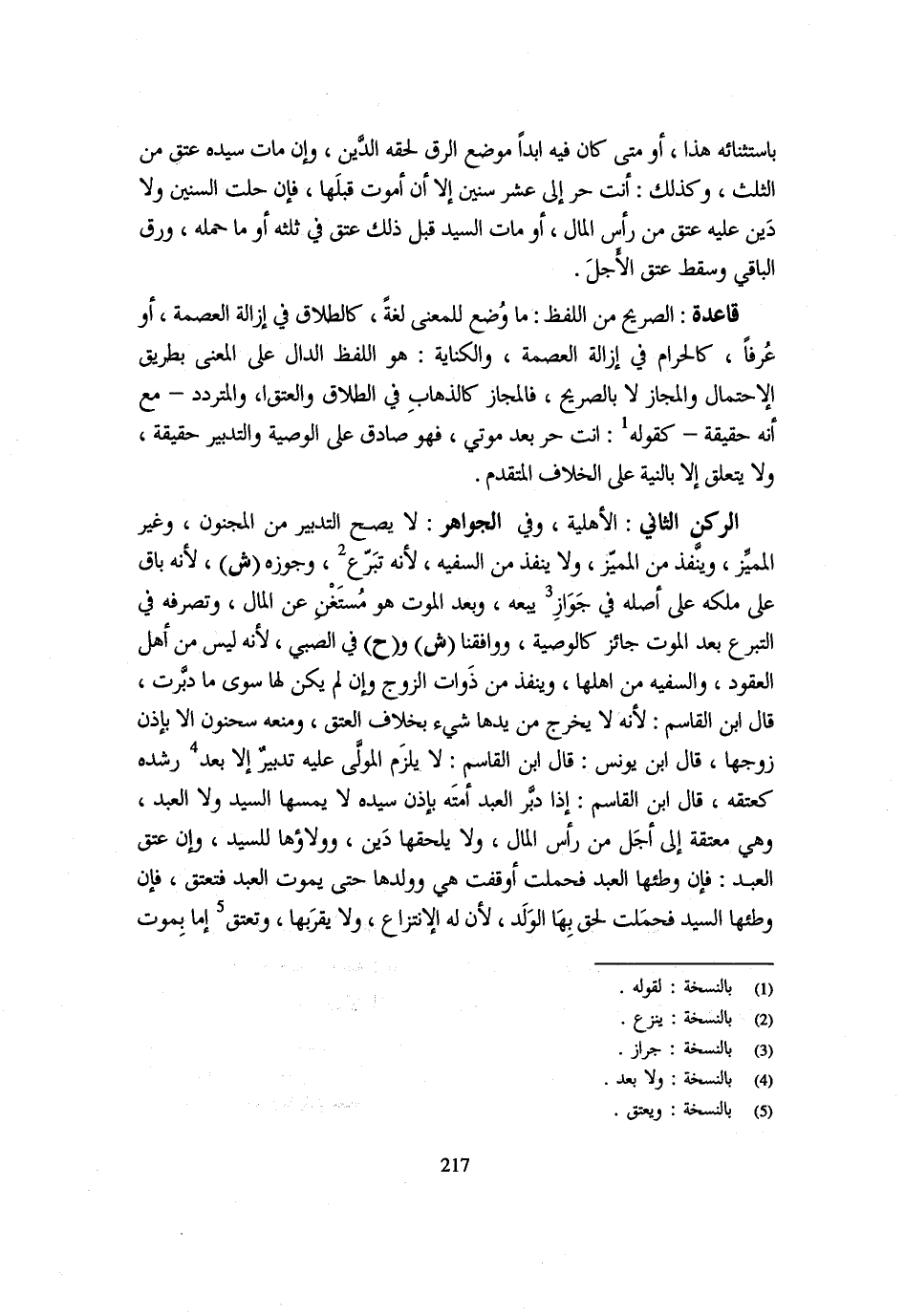 بِاسْتِثْنَائِهِ هَذَا أَوْ مَتَى كَانَ فِيهِ أَبَدًا مَوضِع الرِّقِّ لَحِقَهُ الدَّيْنُ وَإِنْ مَاتَ سَيِّدُهُ عَتَقَ مِنَ الثُّلُثِ وَكَذَلِكَ أَنْتَ حُرٌّ إِلَى عَشْرِ سِنِينَ إِلَّا أَنْ أَمُوتَ قَبْلَهَا فَإِنْ حَلَّتِ السِّنِينَ وَلَا دَيْنَ عَلَيْهِ عَتَقَ مِنْ رَأْسِ الْمَالِ أَوْ مَاتَ السَّيِّدُ قَبْلَ ذَلِكَ عَتَقَ فِي ثُلُثِهِ أَوْ مَا حَمَلَهُ وَرُقَّ الْبَاقِي وَسَقَطَ عِتْقُ الْأَجَلِ قَاعِدَةٌ الصَّرِيحُ مِنَ اللَّفْظِ مَا وُضِعَ لِلْمَعْنَى لُغَةً كَالطَّلَاقِ فِي إِزَالَةِ الْعِصْمَةِ أَوْ عُرْفًا كَالْحَرَامِ فِي إِزَالَةِ الْعِصْمَةِ وَالْكِنَايَةُ هُوَ اللَّفْظُ الدَّالُّ عَلَى الْمَعْنَى بِطَرِيقِ الِاحْتِمَالِ وَالْمَجَازِ لَا بِالصَّرِيحِ فَالْمَجَازُ كَالذَّهَابِ فِي الطَّلَاقِ وَالْعِتْقِ وَالْمُتَرَدِّدُ مَعَ أَنَّهُ حَقِيقَةٌ كَقَوْلِهِ أَنْتَ حُرٌّ بَعْدَ مَوْتِي فَهُوَ صَادِقٌ عَلَى الْوَصِيَّةِ وَالتَّدْبِيرِ حَقِيقَةً وَلَا يَتَعَلَّقُ إِلَّا بِالنِّيَّةِ على الْخلاف الْمُتَقَدّم الرُّكْن الثَّانِي الْأَهْلِيَّة وَفِي الْجَوَاهِرِ لَا يَصِحُّ التَّدْبِيرُ مِنَ الْمَجْنُونِ وَغَيْرِ الْمُمَيِّزِ وَيُنَفَّذُ مِنَ الْمُمَيِّزِ وَلَا يُنَفَّذُ مِنَ السَّفِيهِ لِأَنَّهُ تَبَرُّعٌ وَجَوَّزَهُ ش لِأَنَّهُ بَاقٍ عَلَى مِلْكِهِ عَلَى أَصْلِهِ فِي جَوَازِ بَيْعه وَبعد الْمَوْت وَهُوَ مُسْتَغْنٍ عَنِ الْمَالِ وَتَصَرُّفُهُ فِي التَّبَرُّعِ بَعْدَ الْمَوْت جَائِز كَالْوَصِيَّةِ ووافقنا ش وح فِي الصَّبِيِّ لِأَنَّهُ لَيْسَ مِنْ أَهْلِ الْعُقُودِ وَالسَّفِيه من أَهلهَا وَينفذ من ذَوَات الزَّوْجِ وَإِنْ لَمْ يَكُنْ لَهَا سِوَى مَا دَبَّرَتْ قَالَ ابْنُ الْقَاسِمِ لِأَنَّهُ لَا يَخْرُجُ مِنْ يَدِهَا شَيْءٌ بِخِلَافِ الْعِتْقِ وَمَنَعَهُ سَحْنُونٌ إِلَّا بِإِذْنِ زَوَّجَهَا قَالَ ابْنُ يُونُسَ قَالَ ابْنُ الْقَاسِمِ لَا يَلْزَمُ الْمَوْلَى عَلَيْهِ تَدْبِيرٌ إِلَّا بَعْدَ رُشْدِهِ كَعِتْقِهِ قَالَ ابْنُ الْقَاسِمِ إِذَا دَبَّرَ الْعَبْدُ أَمَتَهُ بِإِذْنِ سَيِّدِهِ لَا يَمَسُّهَا السَّيِّدُ وَلَا الْعَبْدُ وَهِيَ مُعْتَقَةٌ إِلَى أَجَلٍ مِنْ رَأْسِ الْمَالِ وَلَا يَلْحَقُهَا دَيْنٌ وَوَلَاؤُهَا لِلسَّيِّدِ وَإِنْ عَتَقَ الْعَبْدُ فَإِنْ وَطِئَهَا الْعَبْدُ فَحَمَلَتْ أُوْقِفَتْ هِيَ وَوَلَدُهَا حَتَّى يَمُوتَ الْعَبْدُ فَتُعْتَقُ فَإِنْ وَطِئَهَا السَّيِّدُ فَحَمَلَتْ لَحِقَ بِهَا الْوَلَدُ لِأَنَّ لَهُ الِانْتِزَاعَ وَلَا يَقْرَبُهَا وَتُعْتَقُ إِمَّا بِمَوْتِ