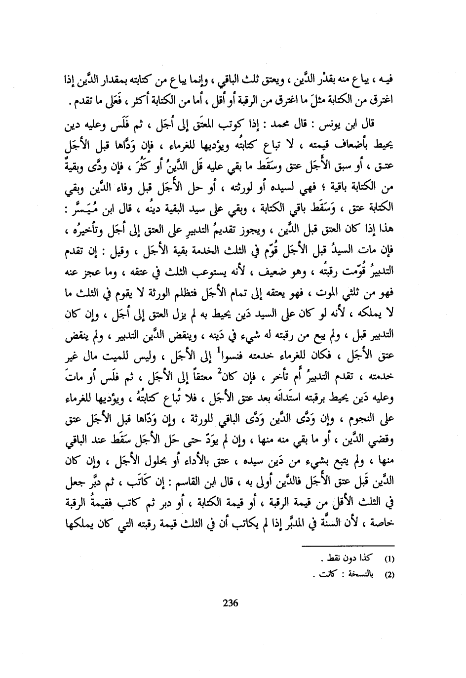 فِيهِ يُبَاعُ مِنْهُ بِقَدْرِ الدَّيْنِ وَيُعْتَقُ ثُلُثُ الْبَاقِي وَإِنَّمَا يُبَاعُ مِنْ كِتَابَتِهِ بِمِقْدَارِ الدَّيْنِ إِذَا اغْتَرَقَ مِنَ الْكِتَابَةِ مِثْلَ مَا اغْتَرَقَ من الرَّقَبَة اَوْ اقل أما مِنَ الْكِتَابَةِ أَكْثَرَ فَعَلَى مَا تَقَدَّمَ قَالَ ابْنُ يُونُسَ قَالَ مُحَمَّدٌ إِذَا كُوتِبَ الْمُعْتَقُ إِلَى أَجَلٍ ثُمَّ فَلَسَ وَعَلَيْهِ دَيْنٌ يُحِيطُ بِأَضْعَافِ قِيمَتِهِ لَا تُبَاعُ كِتَابَتُهُ وَيُؤَدِّيهَا لِلْغُرَمَاءِ فَإِن وداها قَبْلَ الْأَجَلِ عَتَقَ أَوْ سَبَقَ الْأَجَلُ عَتَقَ وَسَقَطَ مَا بَقِيَ عَلَيْهِ قَلَّ الدَّيْنُ أَوْ كثر فَإِن ودى وَبَقِيَّةٌ مِنَ الْكِتَابَةِ بَاقِيَةٌ فَهِيَ لِسَيِّدِهِ أَوْ لِوَرَثَتِهِ أَوْ حَلَّ الْأَجَلُ قَبْلَ وَفَاءِ الدَّيْنِ وَبَقِي الْكِتَابَةُ عَتَقَ وَسَقَطَ بَاقِي الْكِتَابَةِ وَبَقِيَ عَلَى سَيِّدِ الْبَقِيَّةِ دَيْنُهُ قَالَ ابْنُ مُيَسَّرٍ هَذَا إِذَا كَانَ الْعِتْقُ قَبْلَ الدَّيْنِ وَيَجُوزُ تَقْدِيمُ التَّدْبِيرِ عَلَى الْعِتْقِ إِلَى أَجَلٍ وَتَأْخِيرُهُ فَإِنْ مَاتَ السَّيِّدُ قَبْلَ الْأَجَلِ قُوِّمَ فِي الثُّلُثِ الْخِدْمَةُ بَقِيَّةِ الْأَجَلِ وَقِيلَ إِنْ تَقَدَّمَ التَّدْبِيرُ قَوِّمَتْ رَقَبَتُهُ وَهُوَ ضَعِيفٌ لِأَنَّهُ يَسْتَوْعِبُ الثُّلُثَ فِي عِتْقِهِ وَمَا عَجَزَ عَنْهُ فَهُوَ مِنْ ثُلثي الْمَوْت فَهُوَ يعتقهُ إِلَى تَمام الْأَجَل فتظلم الْوَرَثَةِ لَا يُقَوَّمُ فِي الثُّلُثِ مَا لَا يَمْلِكُهُ لِأَنَّهُ لَوْ كَانَ عَلَى السَّيِّدِ دَيْنٌ يُحِيطُ بِهِ لَمْ يَزَلِ الْعِتْقُ إِلَى أَجَلٍ وَإِنْ كَانَ التَّدْبِيرُ قَبْلُ وَلَمْ يُبَعْ مِنْ رقبته لَهُ شَيْء فِي دينه وينقض الدَّيْنُ التَّدْبِيرَ وَلَمْ يَنْقُضْ عِتْقُ الْأَجَلِ فَكَانَ لِلْغُرَمَاءِ خِدْمَتُهُ فَنَسَوْا إِلَى الْأَجَلِ وَلَيْسَ لِلْمَيِّتِ مَالٌ غَيْرَ خِدْمَتِهِ تَقَدَّمَ التَّدْبِيرُ أَمْ تَأَخَّرَ فَإِنْ كَانَ مُعْتَقًا إِلَى الْأَجَلِ ثُمَّ فَلَسَ أَوْ مَاتَ وَعَلَيْهِ دَيْنٌ يُحِيطُ بِرَقَبَتِهِ اسْتَدَانَهُ بَعْدَ عِتْقِ الْأَجَلِ فَلَا تُبَاعُ كِتَابَتُهُ وَيُؤَدِّيهَا للْغُرَمَاء على النُّجُوم وَإِن ودى الدّين ودى الْبَاقِي للْوَرَثَة وَإِن وداها قَبْلَ الْأَجَلِ عَتَقَ وَقُضِيَ الدَّيْنُ أَوْ مَا بَقِي مِنْهُ مِنْهَا وَإِن لم يود حَتَّى حل الْأَجَل سقط عِنْد الْبَاقِي مِنْهَا وَلَمْ يُتْبَعْ بِشَيْءٍ مِنْ دَيْنِ سَيِّدِهِ عَتَقَ بِالْأَدَاءِ أَوْ بِحُلُولِ الْأَجَلِ وَإِنْ كَانَ الدَّيْنُ قَبْلَ عِتْقِ الْأَجَلِ فَالدَّيْنُ أَوْلَى بِهِ قَالَ ابْنُ الْقَاسِمِ إِنْ كَاتَبَ ثُمَّ دَبَّرَ جُعِلَ فِي الثُّلُثِ الْأَقَلِّ مِنْ قِيمَةِ الرَّقَبَةِ أَوْ قِيمَةِ الْكِتَابَةِ أَوْ دَبَّرَ ثُمَّ كَاتَبَ فَقِيمَةُ الرَّقَبَةِ خَاصَّةٌ لِأَنَّ السُّنَّةَ فِي الْمُدَبَّرِ إِذَا لَمْ يُكَاتَبْ أَنَّ فِي الثُّلُثِ قِيمَةَ رَقَبَتِهِ الَّتِي كَانَ يَمْلِكُهَا
