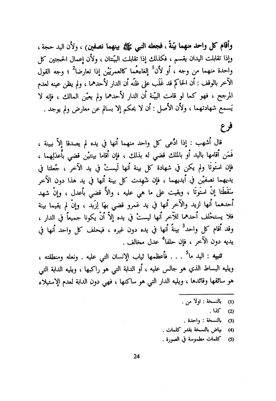 قَالَ أَشْهَبُ إِذَا ادَّعَى كُلُّ وَاحِدٍ مِنْهُمَا أَنَّهَا فِي يَدِهِ لَمْ يُصَدَّقَا إِلَّا بِبَيِّنَةٍ فَمَنْ أَقَامَهَا بِالْيَدِ أَوْ بِالْمِلْكِ قُضِيَ لَهُ بذلك فَإِن أَقَامَا ببينتين قُضِيَ بِأَعْدَلِهِمَا فَإِنِ اسْتَوَتَا وَلَمْ يَكُنْ فِي شَهَادَةِ كُلِّ بَيِّنَةٍ أَنَّهَا لَيْسَتْ فِي يَدِ الآخر جعلتا فِي يديهما نِصْفَيْنِ فِي أَيْدِيهِمَا فَإِنْ شَهِدَتْ كُلُّ بَيِّنَةٍ أَنَّهَا فِي يَدِ هَذَا دُونَ الْآخَرِ سَقَطَتَا إِنِ اسْتَوَتَا وَبَقِيَتْ على مَا هِيَ عَلَيْهِ والا قضي بأعدل وَإِنْ شَهِدَ أَحَدُهُمَا أَنَّهَا لِزَيْدٍ وَالْآخَرُ أَنَّهَا فِي يَدِ عَمْرٍو قُضِيَ بِهَا لِزَيْدٍ وَإِنْ لَمْ يُقِيمَا بَيِّنَةً فَلَا يُسْتَحْلَفُ أَحَدُهُمَا لِلْآخَرِ أَنَّهَا لَيْسَتْ فِي يَدِهِ إِلَّا أَنْ يَكُونَا جَمِيعًا فِي الدَّارِ وَقَدْ أَقَامَ كُلُّ وَاحِدٍ بَيِّنَةً أَنَّهَا فِي يَدِهِ دُونَ غَيْرِهِ فَيَحْلِفُ كُلُّ وَاحِدٍ أَنَّهَا فِي يَدَيْهِ دُونَ الْآخَرِ فَإِنْ حَلَفَا عَدَلَ مُخَالِفٌ تَنْبِيهٌ الْيَدُ مَا فَأَعْظَمُهَا ثِيَابُ الْإِنْسَانِ الَّتِي عَلَيْهِ وَنَعْلُهُ وَمِنْطَقَتُهُ وَيَلِيهِ الْبِسَاطُ الَّذِي هُوَ جَالِسٌ عَلَيْهِ أَوِ الدَّابَّةُ الَّتِي هُوَ رَاكِبُهَا وَيَلِيهِ الدَّابَّةُ الَّتِي هُوَ سَائِقُهَا وَقَائِدُهَا وَيَلِيهِ الدَّارُ الَّتِي هُوَ سَاكِنُهَا فَهِيَ دُونَ الدَّابَّةِ لِعَدَمِ الِاسْتِيلَاءِ