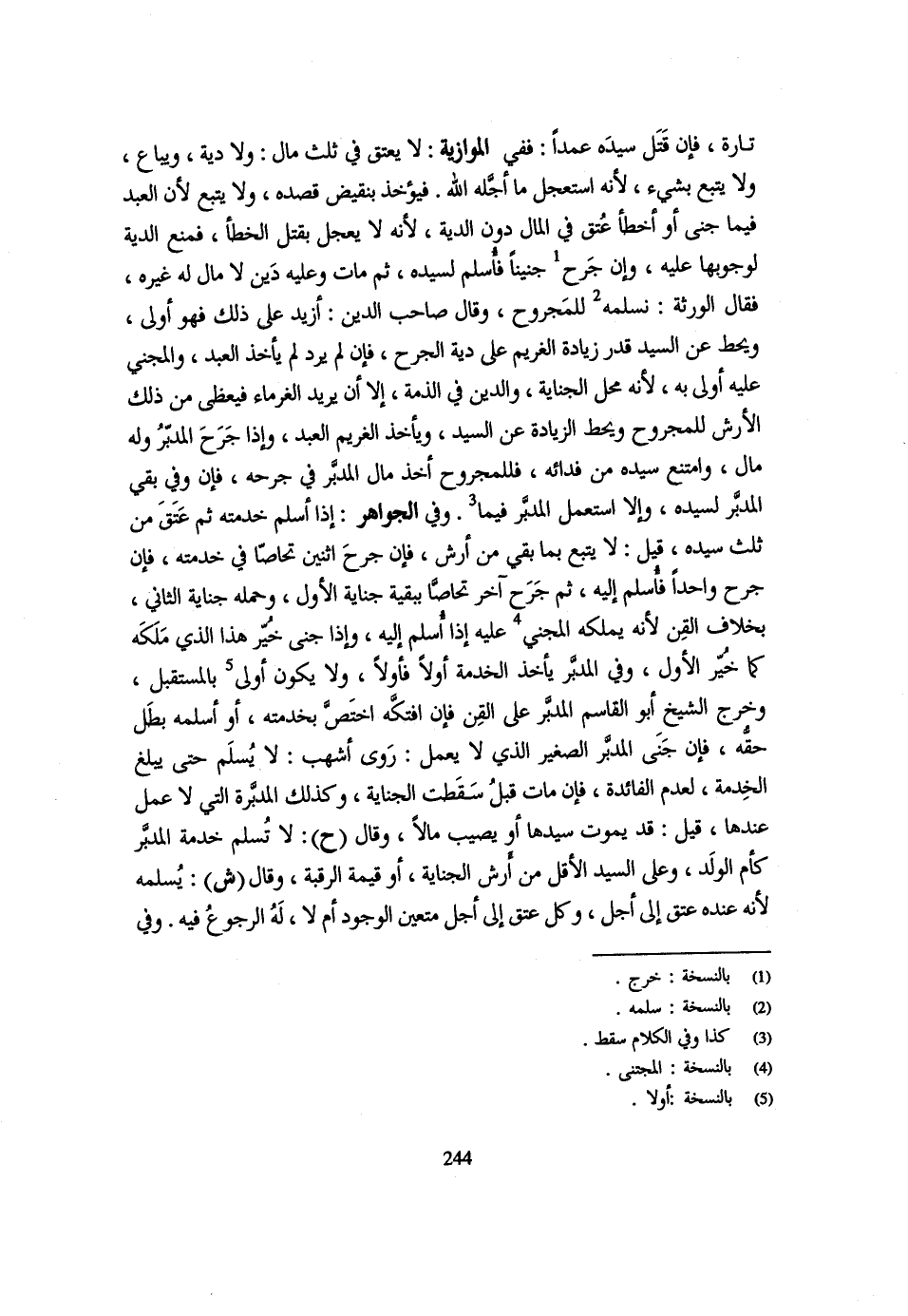 تَارَةً فَإِنْ قَتَلَ سَيِّدَهُ عَمْدًا فَفِي الْمَوَّازِيَّةِ لَا يُعْتَقُ فِي ثُلُثِ مَالٍ وَلَا دِيَةٍ وَيُبَاعُ وَلَا يُتْبَعُ بِشَيْءٍ لِأَنَّهُ اسْتَعْجَلَ مَا أَجَّلَهُ اللَّهُ فَيُؤْخَذُ بِنَقِيضِ قَصْدِهِ وَلَا يُتَّبَعُ لِأَن العَبْد فِيمَا جَنَى أَوْ أَخْطَأَ عَتَقَ فِي الْمَالِ دُونَ دِيَة الدِّيَةِ لِأَنَّهُ لَا يُعَجَّلُ بِقَتْلِ الْخَطَأِ فَمَنْعُ الدِّيَةِ لِوُجُوبِهَا عَلَيْهِ وَإِنْ جَرَحَ جَنِينًا فَأُسْلِمَ لِسَيِّدِهِ ثُمَّ مَاتَ وَعَلَيْهِ دِينٌ لَا مَالَ لَهُ غَيْرُهُ فَقَالَ الْوَرَثَةُ نُسَلِّمُهُ لِلْمَجْرُوحِ وَقَالَ صَاحِبُ الدَّيْنِ أَزِيَدُ عَلَى ذَلِكَ فَهُوَ أَوْلَى وَيُحَطُّ عَنِ السَّيِّدِ قَدْرُ زِيَادَةِ الْغَرِيمِ عَلَى دِيَةِ الْجَرْحِ فَإِنْ لَمْ يُرِدْ لَمْ يَأْخُذِ الْعَبْدَ وَالْمَجْنِيُّ عَلَيْهِ أَوْلَى بِهِ لِأَنَّهُ مَحَلُّ الْجِنَايَةِ وَالدَّيْنُ فِي الذِّمَّةِ إِلَّا أَنْ يُرِيدَ الْغُرَمَاء فيعظى من ذَلِك الْأَرْش للمجروح ويحط الزِّيَادَةُ عَنِ السَّيِّدِ وَيَأْخُذُ الْغَرِيمُ الْعَبْدَ وَإِذَا جَرَحَ الْمُدَبَّرُ وَلَهُ مَالٌ وَامْتَنَعَ سَيِّدُهُ مِنْ فِدَائِهِ فَلِلْمَجْرُوحِ أَخْذُ مَالِ الْمُدَبَّرِ فِي جَرْحِهِ فَإِنْ وَفَّى بَقِيَ الْمُدَبَّرُ لِسَيِّدِهِ وَإِلَّا اسْتَعْمَلَ الْمُدبر فِيمَا وَفِي الْجَوَاهِرِ إِذَا أَسْلَمَ خِدْمَتَهُ ثُمَّ عَتَقَ مِنْ ثُلُثِ سَيِّدِهِ قِيلَ لَا يُتْبَعُ بِمَا بَقِيَ مَنْ أَرْشٍ فَإِنْ جَرَحَ اثْنَيْنِ تَحَاصَّا فِي خِدْمَتِهِ فَإِنْ جَرَحَ وَاحِدًا فَأُسْلِمَ إِلَيْهِ ثُمَّ جَرَحَ آخَرَ تَحَاصَّا بِبَقِيَّةِ جِنَايَةِ الْأَوَّلِ وَحمله جِنَايَةِ الثَّانِي بِخِلَافِ الْقِنِّ لِأَنَّهُ يَمْلُكُهُ الْمَجْنِيُّ عَلَيْهِ إِذَا أُسْلِمَ إِلَيْهِ وَإِذَا جَنَى خُيِّرَ هَذَا الَّذِي مَلَكَهُ كَمَا خُيِّرَ الْأَوَّلُ وَفِي الْمُدَبَّرِ يَأْخُذُ الْخِدْمَةَ أَوَّلًا فَأَوَّلًا وَلَا يَكُونُ أَوْلَى بِالْمُسْتَقْبَلِ وَخَرَّجَ الشَّيْخُ أَبُو الْقَاسِمِ الْمُدَبَّرَ عَلَى الْقِنِّ فَإِنِ افْتَكَّهُ اخْتَصَّ بِخِدْمَتِهِ أَوْ أَسْلَمَهُ بَطَلَ حَقُّهُ فَإِنْ جَنَى الْمُدَبَّرُ الصَّغِيرُ الَّذِي لَا يَعْمَلُ رَوَى أَشْهَبُ لَا يُسَلَمُ حَتَّى يَبْلُغَ الْخِدْمَةَ لِعَدَمِ الْفَائِدَةِ فَإِنْ مَاتَ قَبْلُ سَقَطَتِ الْجِنَايَةُ وَكَذَلِكَ الْمُدَبَّرَةُ الَّتِي لَا عَمَلَ عِنْدَهَا قِيلَ قَدْ يَمُوتُ سَيِّدُهَا أَوْ يُصِيبُ مَالًا وَقَالَ ح لَا تُسْلَمُ خِدْمَةُ الْمُدَبَّرِ كَأُمِّ الْوَلَدِ وَعَلَى السَّيِّدِ الْأَقَلِّ مِنْ أَرْشِ الْجِنَايَةِ أَوْ قِيمَةِ الرَّقَبَةِ وَقَالَ ش يُسْلِمُهُ لِأَنَّهُ عِنْدَهُ عِتْقٌ إِلَى أَجَلٍ وَكُلُّ عِتْقٍ إِلَى أَجَلٍ مُتَعَيِّنُ الْوُجُودِ أَمْ لَا لَهُ الرُّجُوعُ فِيهِ وَفِي