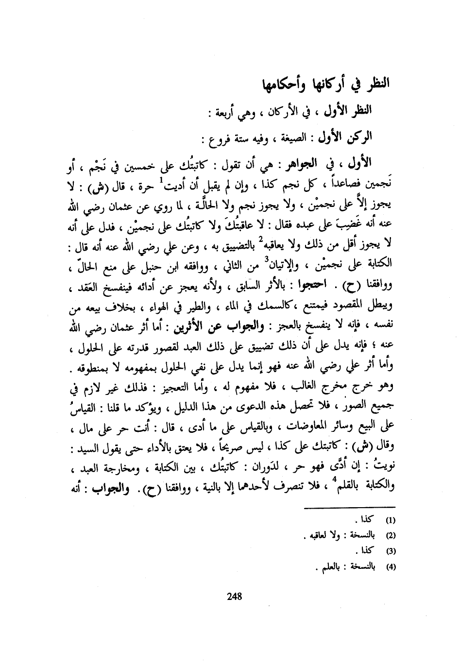 النَّظَرُ الْأَوَّلُ فِي الْأَرْكَانِ وَهِيَ أَرْبَعَةٌ الرُّكْنُ الْأَوَّلُ الصِّيغَةُ وَفِيهِ سِتَّةُ فُرُوعٍ الْأَوَّلُ فِي الْجَوَاهِرِ هِيَ أَنْ تَقُولَ كَاتَبْتُكَ عَلَى خَمْسِينَ فِي نَجْمٍ أَوْ نَجْمَيْنِ فَصَاعِدًا كُلُّ نَجْمٍ كَذَا وَإِنْ لَمْ يقبل أَن أدّيت حرَّة قَالَ ش لَا يجوز إِلَّا عَلَى نَجْمَيْنِ وَلَا يَجُوزُ نَجْمٌ وَلَا الْحَالَّةُ لِمَا رُوِيَ عَنْ عُثْمَانَ رَضِيَ اللَّهُ عَنهُ أَنه غضب على عَبده فَقَالَ لَا عاقبتك وَلَا كاتبتك عَلَى نَجْمَيْنِ فَدَلَّ عَلَى أَنَّهُ لَا يَجُوزُ اقل من ذَلِك وَلَا يُعَاقِبهُ بِالتَّضْيِيقِ بِهِ وَعَنْ عَلَيٍّ رَضِيَ اللَّهُ عَنْهُ أَنه قَالَ الْكِتَابَة على نجمين والإتيان مِنَ الثَّانِي وَوَافَقَهُ ابْنُ حَنْبَلٍ عَلَى مَنْعِ الْحَال ووافقنا ح احْتَجُّوا بالأثر السَّابِق وَلِأَنَّهُ يَعْجَزُ عَنْ أَدَائِهِ فَيَنْفَسِخُ الْعَقْدُ وَيَبْطُلُ الْمَقْصُودُ فَيَمْتَنِعُ كَالسَّمَكِ فِي الْمَاءِ وَالطَّيْرِ فِي الْهَوَاءِ بِخِلَافِ بَيْعِهِ مِنْ نَفْسِهِ فَإِنَّهُ لَا يَنْفَسِخُ بِالْعَجْزِ وَالْجَوَابُ عَنِ الْأَثَرَيْنِ أَمَّا أَثَرُ عُثْمَانَ رَضِيَ اللَّهُ عَنْهُ فَإِنَّهُ يَدُلُّ عَلَى أَنَّ ذَلِكَ تَضْيِيقٌ عَلَى ذَلِكَ الْعَبْدِ لِقُصُورِ قُدْرَتِهِ عَلَى الْحُلُولِ وَأَمَّا أَثَرُ عَلَيٍّ رَضِيَ اللَّهُ عَنْهُ فَهُوَ إِنَّمَا يَدُلُّ عَلَى نَفْيِ الْحُلُولِ بِمَفْهُومِهِ لَا بِمَنْطُوقِهِ وَهُوَ خَرَجَ مَخْرَجَ الْغَالِبِ فَلَا مَفْهُومَ لَهُ وَأَمَّا التَّعْجِيزُ فَذَلِكَ غَيْرُ لَازِمٍ فِي جَمِيعِ الصُّوَرِ فَلَا تَحْصُلُ هَذِهِ الدَّعْوَى مِنْ هَذَا الدَّلِيلِ وَيُؤَكِّدُ مَا قُلْنَا الْقِيَاسُ عَلَى الْبَيْعِ وَسَائِرِ الْمُعَاوَضَاتِ وَبِالْقِيَاسِ على مَا أدّى قَالَ أَنْتَ حُرٌّ عَلَى مَالٍ وَقَالَ ش كَاتَبْتُكَ عَلَى كَذَا لَيْسَ صَرِيحًا فَلَا يُعْتَقُ بِالْأَدَاءِ حَتَّى يَقُولَ السَّيِّدُ نَوَيْتُ إِنْ أَدَّى فَهُوَ حُرٌّ لِدَوَرَانِ كَاتَبْتُكَ بَيْنَ الْكِتَابَةِ وَمُخَارَجَةِ العَبْد وَالْكِتَابَة بالقلم فَلَا تَنْصَرِف لأَحَدهمَا إِلَّا بِالنِّيَّةِ وَوَافَقَنَا ح وَالْجَوَابُ أَنَّهُ