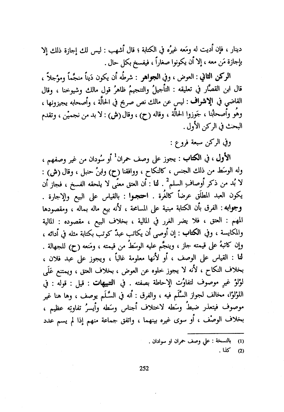 الْأَوَّلُ فِي الْكِتَابِ يَجُوزُ عَلَى وَصْفِ حُمْرَانِ أَوْ سُودَانِ مِنْ غَيْرِ وَصْفِهِمْ وَلَهُ الْوَسَطُ مِنْ ذَلِكَ الْجِنْسِ كَالنِّكَاحِ وَوَافَقَنَا ح وَابْنُ حَنْبَلٍ وَقَالَ ش لَا بُدَّ مِنْ ذِكْرِ أَوْصَافِ السَّلَمِ لَنَا أَنَّ الْعِتْقَ مَعْنًى لَا يَلْحَقُهُ الْفَسْخُ فَجَازَ أَنْ يَكُونَ الْعَبْدُ الْمُطْلَقُ عرضا كَالْغُرَّةِ احْتَجُّوا بِالْقِيَاسِ عَلَى الْبَيْعِ وَالْإِجَارَةِ وَجَوَابُهُ الْفَرْقُ بِأَنَّ الْكِتَابَةَ مَبْنِيَّةٌ عَلَى الْمُسَامَحَةِ لِأَنَّهُ بِيعَ مَالُهُ بِمَالِهِ وَمَقْصُودُهَا الْمُهِمُّ الْعِتْقُ فَلَا يُضَرُّ الْغَرَرُ فِي الْمَالِيَّةِ بِخِلَافِ الْبَيْعِ مَقْصُودُهُ الْمَالِيَّةُ وَالْمُكَايَسَةُ وَفِي الْكِتَابِ إِنْ أَوْصَى أَنْ يُكَاتَبَ عَبْدٌ كُوتِبَ بِكِتَابَةِ مِثْلِهِ فِي أَدَائِهِ وَإِنْ كَاتَبَهُ عَلَى قِيمَتِهِ جَازَ وَيُنَجَّمُ عَلَيْهِ الْوَسَطُ مِنْ قِيمَتِهِ وَمَنَعَهُ ح لِلْجَهَالَةِ لَنَا الْقِيَاسُ عَلَى الْوَصْفِ أَوْ لِأَنَّهَا مَعْلُومَةٌ غَالِبًا وَيَجُوزُ عَلَى عَبْدِ فُلَانٍ بِخِلَافِ النِّكَاحِ لِأَنَّهُ لَا يَجُوزُ خُلُوُّهُ عَنِ الْعِوَضِ بِخِلَافِ الْعِتْقِ وَيَمْتَنِعُ عَلَى لُؤْلُؤٍ غَيْرِ مَوْصُوفٍ لِتَفَاوُتِ الْإِحَاطَةِ بِصفتِهِ فِي التَّنْبِيهَات قيل قَوْله فِي الؤلؤا مُخَالِفٌ لِجَوَازِ السَّلَمِ فِيهِ وَالْفَرْقُ أَنَّهُ فِي السَّلَمِ يُوصَفُ وَهَاهُنَا غَيْرُ مَوْصُوفٍ فَيَتَعَذَّرُ ضَبْطُ وَسَطِهِ لِاخْتِلَافِ أَجْنَاسِ وَسَطِهِ وَأَيْسَرُ تَفَاوُتِهِ عَظِيمٌ بِخِلَاف الْوَصْف اَوْ سوى غَيْرُهُ بَيْنَهُمَا وَاتَّفَقَ جَمَاعَةٌ مِنْهُمْ إِذَا لَمْ يسم عدد