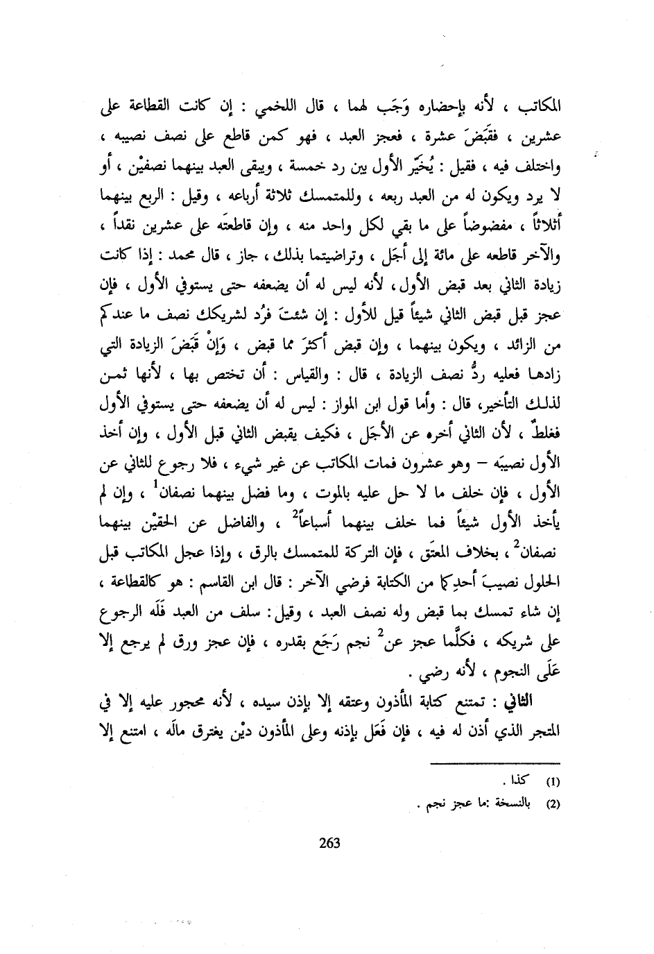 الْمُكَاتِبُ لِأَنَّهُ بِإِحْضَارِهِ وَجَبَ لَهُمَا قَالَ اللَّخْمِيُّ إِنْ كَانَتِ الْقِطَاعَةُ عَلَى عِشْرِينَ فَقَبَضَ عَشَرَةً فَعَجَزَ الْعَبْدُ فَهُوَ كَمَنْ قَاطَعَ عَلَى نِصْفِ نَصِيبِهِ وَاخْتُلِفَ فِيهِ فَقِيلَ يُخَيَّرُ الْأَوَّلُ بَيْنَ رَدِّ خَمْسَةٍ وَيَبْقَى الْعَبْدُ بَيْنَهُمَا نِصْفَيْنِ أَوْ لَا يُرَدُّ وَيَكُونُ لَهُ مِنَ الْعَبْدِ رُبُعُهُ وَلِلْمُتَمَسِّكِ ثَلَاثَةُ أَرْبَاعِهِ وَقِيلَ الرُبُعُ بَيْنَهُمَا أَثْلَاثًا مفضوضاً عَلَى مَا بَقِيَ لِكُلِّ وَاحِدٍ مِنْهُ وَإِنْ قَاطَعْتُهُ عَلَى عِشْرِينَ نَقْدًا وَالْآخَرُ قَاطَعَهُ عَلَى مِائَةٍ إِلَى أَجَلٍ وَتَرَاضَيْتُمَا بِذَلِكَ جَازَ قَالَ مُحَمَّدٌ إِذَا كَانَتْ زِيَادَةُ الثَّانِي بَعْدَ قَبْضِ الْأَوَّلِ لِأَنَّهُ لَيْسَ لَهُ أَنْ يُضْعِفَهُ حَتَّى يَسْتَوْفِيَ الْأَوَّلُ فَإِنْ عَجَزَ قَبْلَ قَبْضِ الثَّانِي شَيْئًا قِيلَ لِلْأَوَّلِ إِنْ شِئْتَ فَرُدَّ لِشَرِيكِكَ نصف مَا عنْدكُمْ مِنَ الزَّائِدِ وَيَكُونُ بَيْنَهُمَا وَإِنْ قَبَضَ أَكْثَرَ مِمَّا قَبَضَ الزِّيَادَةَ الَّتِي زَادَهَا فَعَلَيْهِ رَدُّ نِصْفِ الزِّيَادَةِ قَالَ وَالْقِيَاسُ أَنْ تَخْتَصَّ بِهَا لِأَنَّهَا ثَمَنٌ لِذَلِكَ التَّأْخِيرِ قَالَ وَأَمَّا قَوْلُ ابْنِ الْمَوَّازِ لَيْسَ لَهُ أَنْ يُضْعِفَهُ حَتَّى يَسْتَوْفِيَ الْأَوَّلُ فَغَلِطَ لِأَنَّ الثَّانِيَ أَخَّرَهُ عَنِ الْأَجَلِ فَكَيْفَ يَقْبِضُ الثَّانِيَ قَبْلَ الْأَوَّلِ وَإِنْ أَخَذَ الْأَوَّلُ نَصِيبَهُ وَهُوَ عِشْرُونَ فَمَاتَ الْمُكَاتِبُ عَنْ غَيْرِ شَيْءٍ فَلَا رُجُوعَ لِلثَّانِي عَنِ الْأَوَّلِ فَإِن خلف مَا لَا حل عَلَيْهِ بِالْمَوْتِ وَمَا فضل بَينهمَا نِصْفَانِ وَإِنْ لَمْ يَأْخُذِ الْأَوَّلُ شَيْئًا فَمَا خَلَّفَ بَيْنَهُمَا أَسْبَاعًا وَالْفَاضِلُ عَنِ الْحَقَّيْنِ بَيْنَهُمَا نِصْفَانِ بِخِلَافِ الْمُعْتَقِ فَإِنَّ التِّرْكَةَ لِلْمُتَمَسِّكِ بِالرِّقِّ وَإِذَا عَجَّلَ الْمُكَاتَبُ قَبْلَ الْحُلُولِ نَصِيبَ أَحَدِكُمَا مِنَ الْكِتَابَةِ فَرَضِيَ الْآخَرُ قَالَ ابْنُ الْقَاسِمِ هُوَ كَالْقِطَاعَةِ إِنْ شَاءَ تَمَسَّكَ بِمَا قَبَضَ وَلَهُ نِصْفُ الْعَبْدِ وَقِيلَ سَلَفَ مِنَ الْعَبْدِ فَلَهُ الرُّجُوعُ عَلَى شَرِيكِهِ فَكُلَّمَا عَجَزَ عَنْ نَجْمٍ رَجَعَ بِقَدرِهِ فَإِن عجز رق لَمْ يَرْجِعْ إِلَّا عَلَى النُّجُومِ لِأَنَّهُ رَضِيَ الثَّانِي تَمْتَنِعُ كِتَابَةُ الْمَأْذُونِ وَعِتْقُهُ إِلَّا بِإِذْنِ سَيِّدِهِ لِأَنَّهُ مَحْجُورٌ عَلَيْهِ إِلَّا فِي الْمَتْجَرِ الَّذِي أَذِنَ لَهُ فِيهِ فَإِنْ فَعَلَ بِإِذْنِهِ وَعَلَى الْمَأْذُونِ دَيْنٌ يَغْتَرِقُ مَالَهُ امْتَنَعَ إِلَّا
