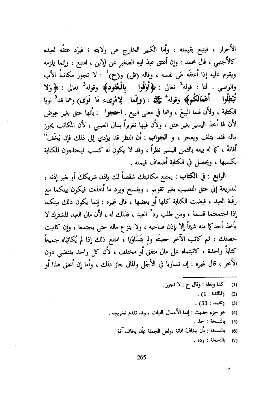 الْأَحْرَارَ فَيُتْبَعُ بِقِيمَتِهِ وَأَمَّا الْكَبِيرُ الْخَارِجُ عَنْ وِلَايَتِهِ فَيُرَدُّ عِتْقُهُ لِعَبْدِهِ كَالْأَجْنَبِيِّ قَالَ مُحَمَّدٌ وَإِنْ أَعْتَقَ عَبْدَ ابْنِهِ الصَّغِيرِ عَنِ الِابْنِ امْتَنَعَ وَإِنَّمَا يَلْزَمُهُ وَيُقَوَّمُ عَلَيْهِ إِذَا أَعْتَقَهُ عَن نَفسه وَقَالَهُ ش وح لَا تَجُوزُ مُكَاتَبَةُ الْأَبِ وَالْوَصِيِّ لَنَا قَوْله تَعَالَى {أَوْفوا بِالْعُقُودِ} وَقَوله تَعَالَى {وَلَا تُبْطِلُوا أَعمالكُم} وَقَوله - صَلَّى اللَّهُ عَلَيْهِ وَسَلَّم َ - وَإِنَّمَا لِامْرِئٍ مَا نَوَى وَهُمَا قَدْ نَوَيَا الْكِتَابَة وَلِأَن لَهما البيع وهما فِي مَعْنَى الْبَيْعِ احْتَجُّوا بِأَنَّهَا عِتْقٌ بِغَيْرِ عوض لِأَن لَهَا اخذ الْيَسِير بِغَيْرِ عِتْقٍ وَلِأَنَّ فِيهَا تَغْرِيرًا بِمَالِ الصَّبِيِّ لِأَنَّ الْمُكَاتَبَ يَحُوزُ مَالَهُ فَقَدْ يَتْلَفُ وَيَعْجَزُ وَالْجَوَابُ أَنَّ النَّظَرَ قَدْ يُؤَدِّي إِلَى ذَلِكَ فَإِن يخف افاته كَمَا لَهُ بَيْعُهُ بِالثَّمَنِ الْيَسِيرِ نَظَرًا وَقَدْ لَا يَكُونُ لَهُ كَسْبٌ فَيَحْتَاجُونَ لِلْكِتَابَةِ بِكَسْبِهَا وَيَحْصُلُ فِي الْكِتَابَةِ أَضْعَافُ قِيمَتِهِ الرَّابِعُ فِي الْكِتَابِ يُمْتَنَعُ مُكَاتَبَتُكَ شِقْصًا لَكَ بِإِذْنِ شَرِيكِكَ أَوْ بِغَيْرِ إِذْنِهِ لِلذَّرِيعَةِ إِلَى عِتْقِ النَّصِيبِ بِغَيْر تَقْوِيم وَيفْسخ وَيرد مَا أَخَذْتَ فَيَكُونُ بَيْنَكُمَا مَعَ رَقَبَةِ الْعَبْدِ قَبَضْتَ الْكِتَابَةَ كُلَّهَا أَوْ بَعْضَهَا قَالَ غَيْرُهُ إِنَّمَا يَكُونُ ذَلِكَ بَيْنَكُمَا إِذَا اجْتَمَعْتُمَا قِسْمَةً وَمَنْ طَلَبَ رَدَّ الْعَبْدِ فَذَلِكَ لَهُ لِأَنَّ مَالَ الْعَبْدِ الْمُشْتَرَكِ لَا يَأْخُذُ أَحَدُكُمَا مِنْهُ شَيْئًا إِلَّا بِإِذْنِ صَاحِبِهِ وَلَا يُنْزَعُ مَالُهُ حَتَّى يجتمعا وَإِنْ كَاتَبْتَ حِصَّتَكَ ثُمَّ كَاتَبَ الْآخَرُ حِصَّتَهُ وَلم يتساويا امْتنع ذَلِك إِذا لم يكاتباه جَمِيعًا كِتَابَةً وَاحِدَةً كَاتَبْتُمَاهُ عَلَى مَالٍ مُتَّفِقٍ أَوْ مُخْتَلِفٍ لِأَنَّ كُلَّ وَاحِدٍ يَقْتَضِي دُونَ الْآخَرِ قَالَ غَيْرُهُ إِنْ تَسَاوَيَا فِي الْأَجَلِ وَالْمَالِ جَازَ ذَلِكَ وَأَمَّا إِنْ أَعْتَقَ هَذَا اَوْ