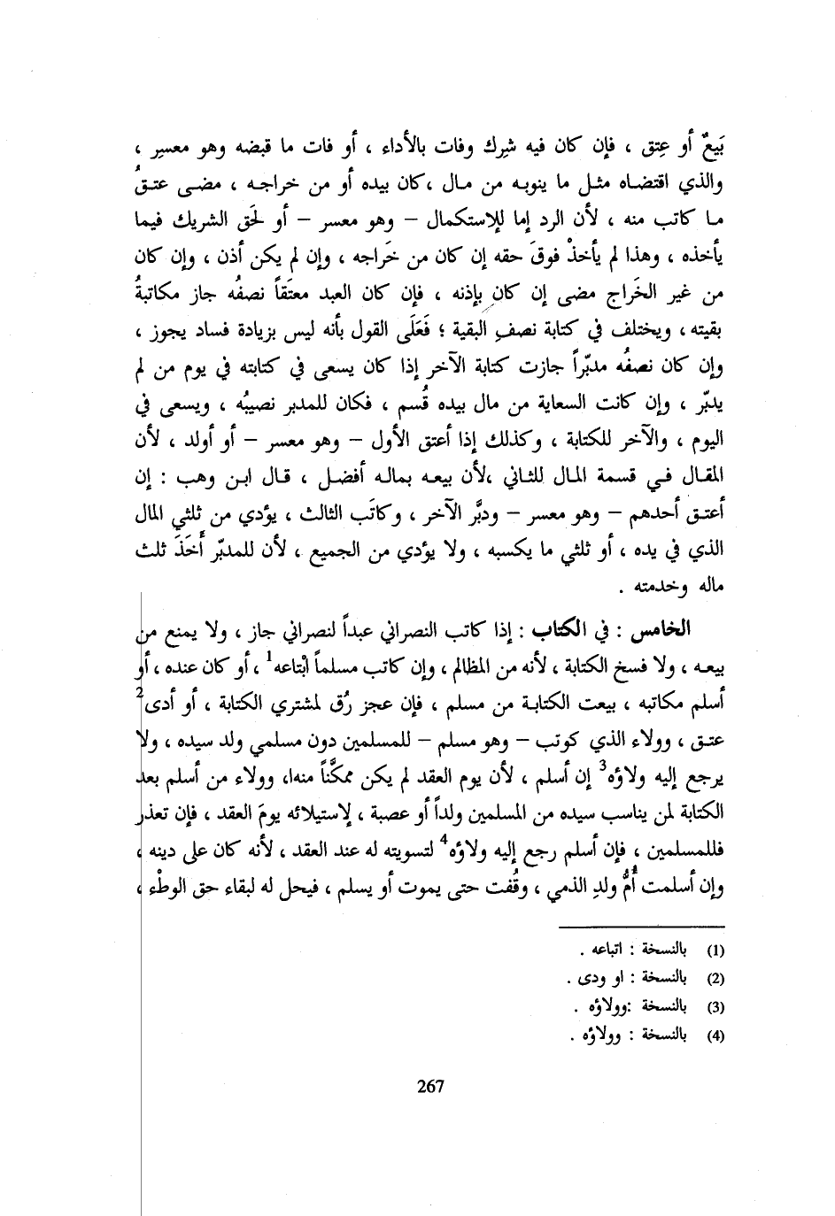 بَيْعٌ أَوْ عِتْقٌ فَإِنْ كَانَ فِيهِ شِرْكٌ وَفَاتَ بِالْأَدَاءِ أَوْ فَاتَ مَا قَبَضَهُ وَهُوَ مُعْسِرٌ وَالَّذِي اقْتَضَاهُ مِثْلُ مَا يَنُوبُهُ مِنْ مَالٍ كَانَ بِيَدِهِ أَوْ مِنْ خَرَاجِهِ مَضَى عِتْقُ مَا كَاتَبَ مِنْهُ لِأَنَّ الرَّدَّ إِمَّا لِلِاسْتِكْمَالِ وَهُوَ مُعْسِرٌ أَوْ لَحِقَ الشَّرِيكَ فِيمَا يَأْخُذُهُ وَهَذَا لَمْ يَأْخُذْ فَوْقَ حَقِّهِ إِنْ كَانَ مِنْ خَرَاجِهِ وَإِنْ لَمْ يَكُنْ أَذِنَ وَإِنْ كَانَ مِنْ غَيْرِ الْخَرَاجِ مَضَى إِنْ كَانَ بِإِذْنِهِ فَإِنْ كَانَ الْعَبْدُ مُعْتَقًا نِصْفُهُ جَازَ مَكَاتَبَةُ بَقِيَّتِهِ وَيُخْتَلَفُ فِي كِتَابَةِ نِصْفِ الْبَقِيَّةِ فَعَلَى الْقَوْلِ بِأَنَّهُ لَيْسَ بِزِيَادَةٍ فَسَادٌ يَجُوزُ وَإِنْ كَانَ نِصْفُهُ مُدَبَّرًا جَازَتْ كِتَابَةُ الْآخَرِ إِذَا كَانَ يَسْعَى فِي كِتَابَتِهِ فِي يَوْمِ مَنْ لَمْ يُدَبَّرْ وَإِنْ كَانَتِ السِّعَايَةُ مِنْ مَالٍ بِيَدِهِ قُسِّمَ فَكَانَ لِلْمُدَبَّرِ نَصِيبُهُ وَيسْعَى فِي الْيَوْم وَالْآخر لِلْكِتَابَةِ وَكَذَلِكَ إِذَا أَعْتَقَ الْأَوَّلُ وَهُوَ مُعْسِرٌ أَوْ أَوْلَدَ لِأَنَّ الْمَقَالَ فِي قِسْمَةِ الْمَالِ لِلثَّانِي لِأَنَّ بَيْعَهُ بِمَالِهِ أَفْضَلُ قَالَ ابْنُ وَهْبٍ إِنْ أَعْتَقَ أَحَدُهُمْ وَهُوَ مُعْسِرٌ وَدَبَّرَ الْآخَرُ وَكَاتَبَ الثَّالِثُ يُؤَدِّي مِنْ ثُلُثَيِ الْمَالِ الَّذِي فِي يَدِهِ أَوْ ثُلُثَيْ مَا يَكْسِبُهُ وَلَا يُؤَدِّي مِنَ الْجَمِيعِ لِأَنَّ لِلْمُدَبَّرِ أَخَذَ ثُلُثَ مَالِهِ وَخِدْمَتِهِ الْخَامِسُ فِي الْكِتَابِ إِذَا كَاتَبَ النَّصْرَانِيُّ عَبْدًا لِنَصْرَانِيٍّ جَازَ وَلَا يُمْنَعُ مِنْ بَيْعِهِ وَلَا فُسِخَ الْكِتَابَةُ لِأَنَّهُ مِنَ الْمَظَالِمِ وَإِنْ كَاتَبَ مُسْلِمًا ابْتَاعَهُ أَوْ كَانَ عِنْدَهُ أَوْ أَسْلَمَ مُكَاتَبُهُ بِيعَتِ الْكِتَابَةُ مِنْ مُسْلِمٍ فَإِنْ عَجَزَ رُقَّ لِمُشْتَرِي الْكِتَابَةِ أَوْ أَدَّى عَتَقَ وَوَلَاءُ الَّذِي كُوتِبَ وَهُوَ مُسْلِمٌ لِلْمُسْلِمِينَ دُونَ مُسْلِمِي وَلَدِ سَيِّدِهِ وَلَا يَرْجِعُ إِلَيْهِ وَلَاؤُهُ إِنْ أَسْلَمَ لِأَنَّ يَوْمَ الْعَقْدِ لَمْ يَكُنْ مُمَكَّنًا مِنْهُ وَوَلَاءُ مَنْ أَسْلَمَ بَعْدَ الْكِتَابَةِ لِمَنْ يُنَاسِبُ سَيِّدُهُ مِنَ الْمُسْلِمِينَ وَلَدًا أَوْ عَصَبَةً لِاسْتِيلَائِهِ يَوْمَ الْعَقْدِ فَإِنْ تَعَذَّرَ فَلِلْمُسْلِمِينَ فَإِنْ أَسْلَمَ رَجَعَ إِلَيْهِ وَلَاؤُهُ لِتَسْوِيَتِهِ لَهُ عِنْدَ الْعَقْدِ لِأَنَّهُ كَانَ عَلَى دِينِهِ وَإِنْ أَسْلَمَتْ أُمُّ وَلَدِ الذِّمِّيِّ وَقَفَتْ حَتَّى يَمُوت اَوْ يسلم فَيحل لَهُ لِبَقَاءِ حَقِّ الْوَطْءِ