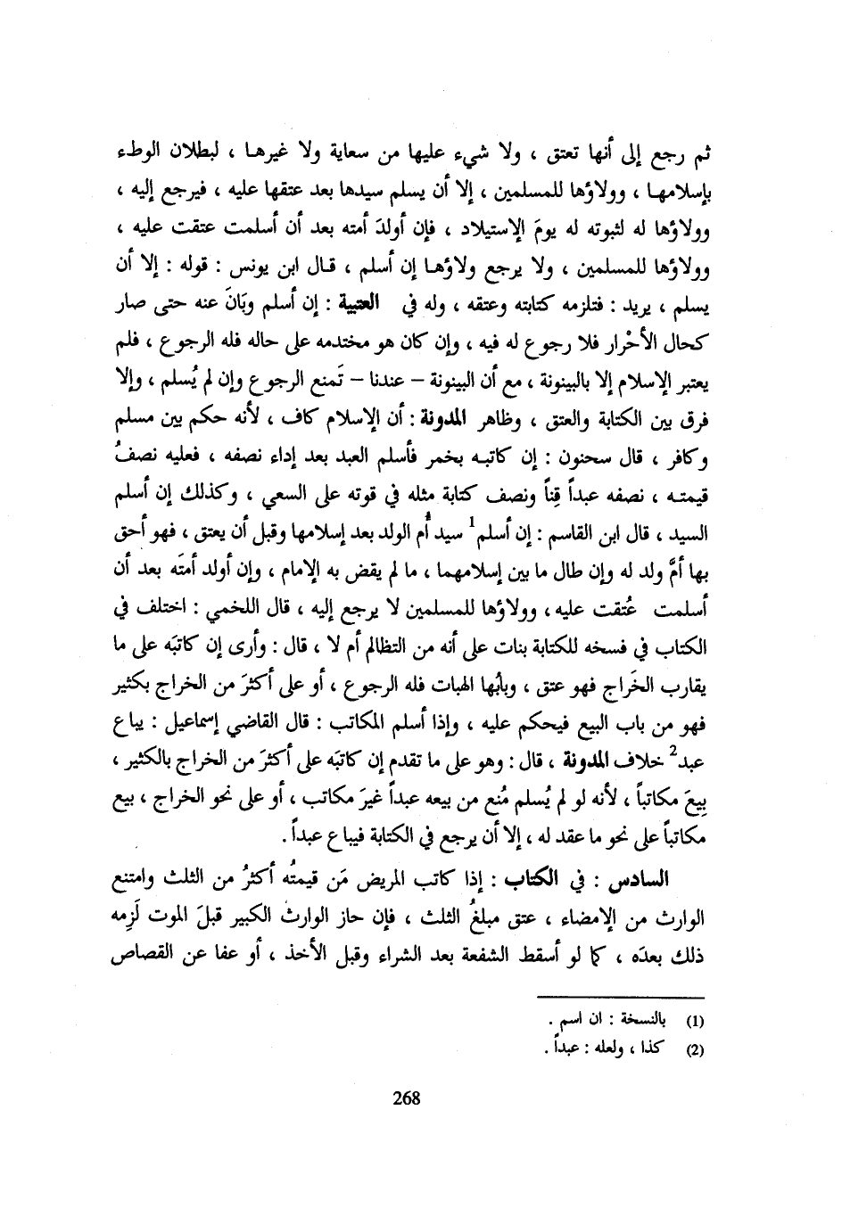 ثُمَّ رَجَعَ إِلَى أَنَّهَا تُعْتَقُ وَلَا شَيْءَ عَلَيْهَا مِنْ سِعَايَةٍ وَلَا غَيْرِهَا لِبُطْلَانِ الْوَطْءِ بِإِسْلَامِهَا وَوَلَاؤُهَا لِلْمُسْلِمِينَ إِلَّا أَنْ يُسْلِمَ سَيِّدُهَا بعد عتقهَا عَلَيْهِ فَيرجع إِلَيْهِ وَوَلَاؤُهَا لَهُ لِثُبُوتِهِ لَهُ يَوْمَ الِاسْتِيلَادِ فَإِنْ أَوْلَدَ أَمَتَهُ بَعْدَ أَنْ أَسْلَمَتْ عَتَقَتْ عَلَيْهِ وولاؤها للْمُسلمين وَلَا يرجع ولاؤها إِنْ أَسْلَمَ قَالَ ابْنُ يُونُسَ قَوْلُهُ إِلَّا أَنْ يُسْلِمَ يُرِيدُ فَتَلْزَمُهُ كِتَابَتُهُ وَعِتْقُهُ وَلَهُ فِي الْعُتْبِيَّةِ إِنْ أَسْلَمَ وَبَانَ عَنْهُ حَتَّى صاركحال الْأَحْرَارِ فَلَا رُجُوعَ لَهُ فِيهِ وَإِنْ كَانَ هُوَ مُخْتَدِمُهُ عَلَى حَالِهِ فَلَهُ الرُّجُوعُ فَلَمْ يُعْتَبَرِ الْإِسْلَامُ إِلَّا بِالْبَيْنُونَةِ مَعَ أَنَّ الْبَيْنُونَةَ عِنْدَنَا تَمْنَعُ الرُّجُوعَ وَإِنْ لَمْ يُسْلِمْ وَإِلَّا فُرِّقَ بَيْنَ الْكِتَابَةِ وَالْعِتْقِ وَظَاهِرُ الْمُدَوَّنَةِ أَنَّ الْإِسْلَامَ كَافٍ لِأَنَّهُ حَكَمَ بَيْنَ مُسْلِمٍ وَكَافِرٍ قَالَ سَحْنُونٌ إِنْ كَاتَبَهُ بِخَمْرٍ فَأَسْلَمَ الْعَبْدُ بعد إداء نصفه فَعَلَيهِ نصف قِيمَته نصفه عَبْدًا قِنًّا وَنِصْفُ كِتَابَةِ مِثْلِهِ فِي قُوَّتِهِ عَلَى السَّعْيِ وَكَذَلِكَ إِنْ أَسْلَمَ السَّيِّدُ قَالَ ابْنُ الْقَاسِمِ إِنْ أَسْلَمَ سَيِّدُ أُمِّ الْوَلَدِ بعد إسْلَامهَا وَقبل أَن يعْتق فَهُوَ أَحَقُّ بِهَا أُمَّ وَلَدٍ لَهُ وَإِنْ طَال مَا بَين إسْلَامهَا مَا لم يقْض بهَا الْإِمَامُ وَإِنْ أَوْلَدَ أَمَتَهُ بَعْدَ أَنْ أَسْلَمَتْ عَتَقَتْ عَلَيْهِ وَوَلَاؤُهَا لِلْمُسْلِمِينَ لَا يَرْجِعُ إِلَيْهِ قَالَ اللَّخْمِيُّ اخْتُلِفَ فِي الْكِتَابِ فِي فَسْخِهِ للكتابة بَنَات عَلَى أَنَّهُ مِنَ التَّظَالُمِ أَمْ لَا قَالَ وَأَرَى إِنْ كَاتَبَهُ عَلَى مَا يُقَارِبُ الْخَرَاجَ فَهُوَ عِتْقٌ وَبَابُهَا الْهِبَاتُ فَلَهُ الرُّجُوعُ أَوْ عَلَى أَكْثَرَ مِنَ الْخَرَاجِ بِكَثِيرٍ فَهُوَ مِنْ بَابِ الْبَيْعِ فَيُحْكَمُ عَلَيْهِ وَإِذَا أَسْلَمَ الْمُكَاتَبُ قَالَ القَاضِي إِسْمَاعِيل يُبَاع عبد خلاف الْمُدَوَّنَة قَالَ وَهُوَ عَلَى مَا تَقَدَّمَ إِنْ كَاتَبَهُ عَلَى أَكْثَرَ مِنَ الْخَرَاجِ بِالْكَثِيرِ بِيعَ مُكَاتِبًا لِأَنَّهُ لَوْ لَمْ يُسْلِمْ مُنِعَ مِنْ بَيْعِهِ عَبْدًا غَيْرَ مُكَاتَبٍ أَوْ عَلَى نَحْوِ الْخَرَاجِ بِيعَ مُكَاتَبًا عَلَى نَحْوِ مَا عَقَدَ لَهُ إِلَّا أَنْ يَرْجِعَ فِي الْكِتَابَةِ فَيُبَاعُ عَبْدًا السَّادِسُ فِي الْكِتَابِ إِذَا كَاتَبَ الْمَرِيضُ مَنْ قِيمَتُهُ أَكْثَرُ مِنَ الثُّلُثِ وَامْتَنَعَ الْوَارِثُ مِنَ الْإِمْضَاء عتق مبلغ الثُّلُث فَإِن حَاز الْوَارِث الْكَبِير قَبْلَ الْمَوْتِ لَزِمَهُ ذَلِكَ بَعْدَهُ كَمَا لَوْ أَسْقَطَ الشُّفْعَةَ بَعْدَ الشِّرَاءِ وَقَبْلَ الْأَخْذِ أَوْ عَفَا عَنِ الْقِصَاصِ