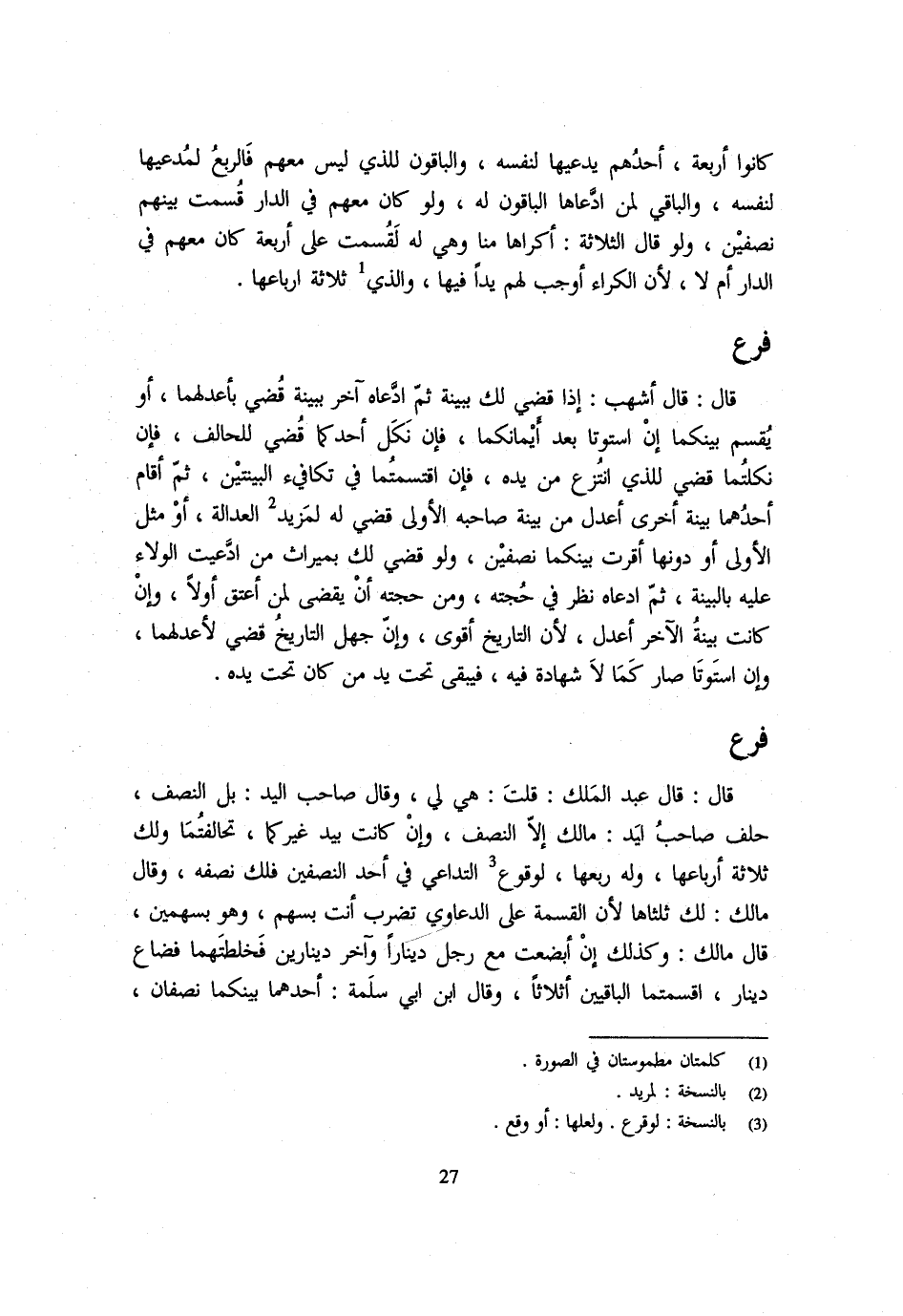 قَالَ قَالَ عَبْدُ الْمَلِكِ قُلْتَ هِيَ لِي وَقَالَ صَاحِبُ الْيَدِ بَلِ النّصْف حلف صَاحب ليد مَالَكَ إِلَّا النِّصْفُ وَإِنْ كَانَتْ بِيَدِ غَيْرِكُمَا تَحَالَفْتُمَا وَلَكَ ثَلَاثَةُ أَرْبَاعِهَا وَلَهُ رُبُعُهَا لِوُقُوعِ التَّدَاعِي فِي أَحَدِ النِّصْفَيْنِ فَلَكَ نِصْفُهُ وَقَالَ مَالِكٌ لَكَ ثُلُثَاهَا لِأَنَّ الْقِسْمَةَ عَلَى الدَّعَاوَى تضرب أَنْت بِسَهْم وَهُوَ بسهمين قَالَ ماك وَكَذَلِكَ إِنْ أَبْضَعْتَ مَعَ رَجُلٍ دِينَارًا وَآخَرَ دينارين فخلطتهما فَضَاعَ دِينَار اقسمتما الْبَاقِيَيْنِ أثلاثاُ وَقَالَ ابْنُ أَبِي سَلَمَةَ أَحَدُهُمَا بَيْنكُمَا نِصْفَانِ