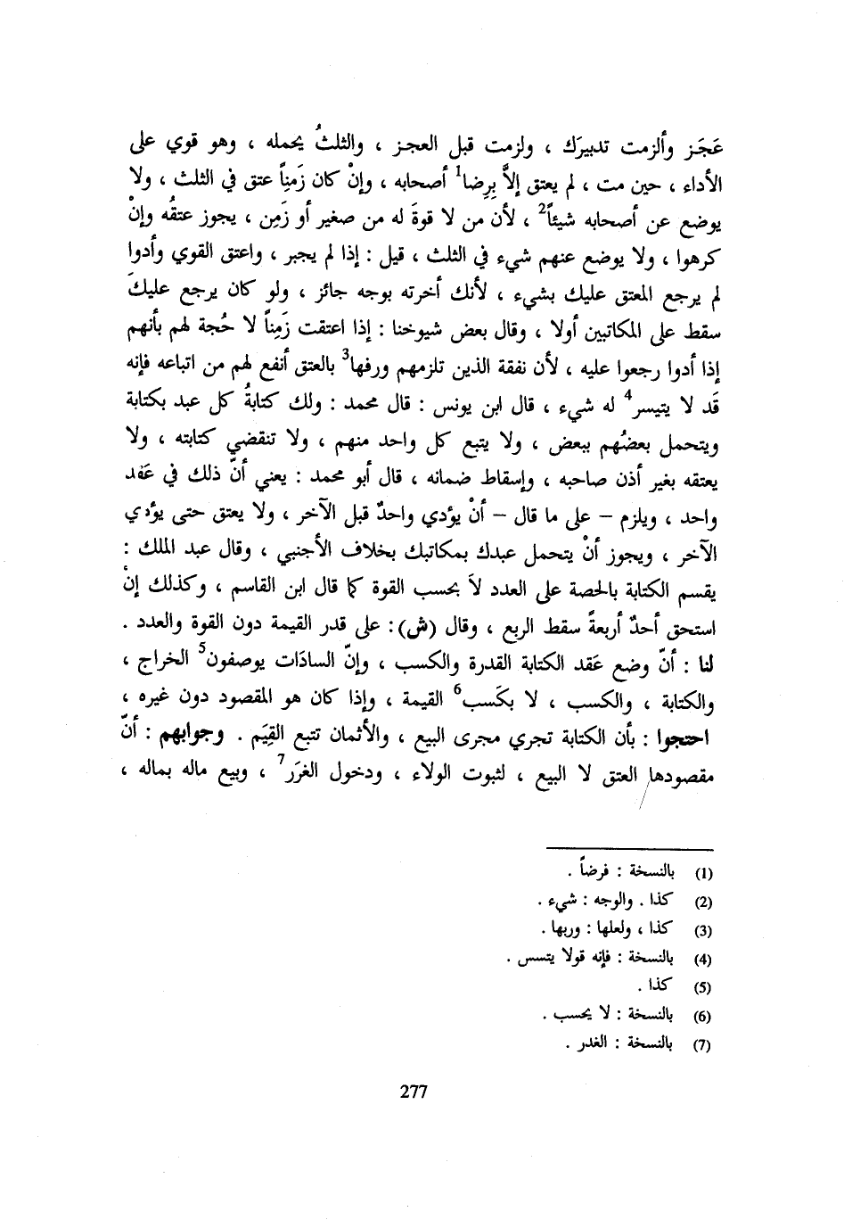 عجز وألزمت تدبيرك ولزمت قَبْلَ الْعَجْزِ وَالثُّلُثُ يَحْمِلُهُ وَهُوَ قَوِيٌّ عَلَى الْأَدَاءِ حِينَ مِتَّ لَمْ يُعْتَقْ إِلَّا بِرِضَا أَصْحَابِهِ وَإِنْ كَانَ زَمِنًا عَتَقَ فِي الثُّلُثِ وَلَا يُوضَعُ عَنْ أَصْحَابِهِ شَيْئًا لِأَنَّ مَنْ لَا قُوَّةَ لَهُ مِنْ صَغِيرٍ أَوْ زَمِنٍ يَجُوزُ عِتْقُهُ وَإِنْ كَرِهُوا وَلَا يُوضَعُ عَنْهُمْ شَيْء فِي الثُّلُث قيل إِذا لم يجْبر واعتق الْقَوِيُّ وَأَدُّوا لَمْ يَرْجِعِ الْمُعْتَقُ عَلَيْكَ بِشَيْءٍ لِأَنَّكَ أَخَّرْتَهُ بِوَجْهٍ جَائِزٍ وَلَوْ كَانَ يَرْجِعُ عَلَيْكَ سَقَطَ عَلَى الْمُكَاتَبِينَ أَوَّلًا وَقَالَ بَعْضُ شُيُوخِنَا إِذَا أَعْتَقْتَ زَمِنًا لَا حُجَّةَ لَهُمْ بِأَنَّهُمْ إِذَا أَدُّوا رَجَعُوا عَلَيْهِ لِأَنَّ نَفَقَةَ الَّذين تلزمهم ورفها بِالْعِتْقِ أَنْفَعُ لَهُمْ مِنَ اتِّبَاعِهِ فَإِنَّهُ قَدْ لَا يَتَيَسَّرُ لَهُ شَيْءٌ قَالَ ابْنُ يُونُسَ قَالَ مُحَمَّدٌ وَلَكَ كِتَابَةُ كُلِّ عَبْدٍ بِكِتَابَةٍ ويتحمل بَعضهم بِبَعْض وَلَا يتبع كل وَاحِد مِنْهُم وَلَا تَنْقَضِي كِتَابَته وَلَا يعتقهُ بِغَيْرِ إِذْنِ صَاحِبِهِ وَإِسْقَاطِ ضَمَانِهِ قَالَ أَبُو مُحَمَّدٍ يَعْنِي أَنَّ ذَلِكَ فِي عَقْدٍ وَاحِدٍ وَيُلْزَمُ عَلَى مَا قَالَ أَنْ يُؤَدِّيَ وَاحِدٌ قَبْلَ الْآخَرِ وَلَا يُعْتَقُ حَتَّى يُؤَدِّيَ الْآخَرُ وَيَجُوزَ أَنْ يَتَحَمَّلَ عَبْدُكَ بِمُكَاتَبِكَ بِخِلَافِ الْأَجْنَبِيِّ وَقَالَ عَبْدُ الْمَلِكِ يُقَسِّمُ الْكِتَابَةَ بِالْحِصَّةِ عَلَى الْعَدَدِ لَا بِحَسَبِ الْقُوَّةِ كَمَا قَالَ ابْنُ الْقَاسِمِ وَكَذَلِكَ إِنِ اسْتَحَقَّ أَحَدٌ أَرْبَعَةً سَقَطَ الرُبُعُ وَقَالَ ش عَلَى قَدْرِ الْقِيمَةِ دُونَ الْقُوَّةِ وَالْعَدَدِ لَنَا أَنَّ وَضْعَ عَقْدِ الْكِتَابَةِ الْقُدْرَةُ وَالْكَسْبُ وَإِنَّ السَّادَاتِ يُوَصِّفُونَ الْخَرَاجَ وَالْكِتَابَةَ وَالْكَسْبَ لَا بِكَسْبِ الْقِيمَةِ وَإِذَا كَانَ هُوَ الْمَقْصُودُ دُونَ غَيْرِهِ احْتَجُّوا بِأَنَّ الْكِتَابَةَ تَجْرِي مَجْرَى الْبَيْعِ وَالْأَثْمَانُ تَتْبَعُ الْقِيَمَ وَجَوَابُهُمْ أَنَّ مَقْصُودَهَا الْعِتْقُ لَا الْبَيْعُ لِثُبُوتِ الْوَلَاءِ وَدُخُولِ الْغرَر وَبيع مَاله بِمَالِه