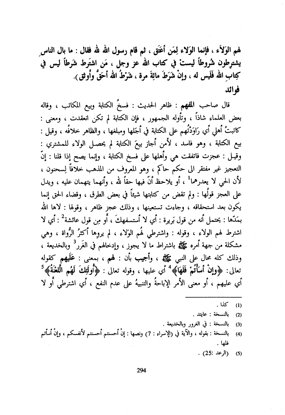 قَالَ صَاحِبُ الْمُفْهِمِ ظَاهِرُ الْحَدِيثِ فَسْخُ الْكِتَابَةِ وَبَيْعُ الْمُكَاتَبِ وَقَالَهُ بَعْضُ الْعُلَمَاءِ شَاذًّا وَتَأَوَّلَهُ الْجُمْهُورُ فَإِنَّ الْكِتَابَةَ لَمْ تَكُنِ انْعَقَدَتْ وَمَعْنَى كَاتَبْتُ أَهْلِي أَيْ رَاوَدْتُهُمْ عَلَى الْكِتَابَةِ فِي أَجَلِهَا وَمَبْلَغِهَا وَالظَّاهِرُ خِلَافُهُ وَقِيلَ بيع الْكِتَابَة وَهُوَ فَاسد لأمن أجَاز بيع الْكِتَابَة لم يحصل الْوَلَاءَ لِلْمُشْتَرِي وَقِيلَ عَجَزَتْ فَاتَّفَقَتْ هِيَ وَأَهْلُهَا عَلَى فَسْخِ الْكِتَابَةِ وَإِنَّمَا يَصِحُّ إِذَا قُلْنَا إِنَّ التَّعْجِيزَ غَيْرُ مُفْتَقِرٍ إِلَى حُكْمِ حَاكِمٍ وَهُوَ الْمَعْرُوفُ مِنَ الْمَذْهَبِ خِلَافًا لِسَحْنُونٍ لِأَنَّ الْحَيّ لَا يعدرهما أَوْ يُلَاحِظُ أَنَّ فِيهَا حَقًّا لِلَّهِ وَأَنَّهُمَا يَتَّهِمَانِ عَلَيْهِ وَيَدُلُّ عَلَى الْعَجْزِ قَوْلُهَا وَلَمْ تَقْضِ مِنْ كِتَابَتِهَا شَيْئًا فِي بَعْضِ الطُّرُقِ وَقَضَاءُ الْحَقِّ إِنَّمَا يَكُونُ بَعْدَ اسْتِحْقَاقِهِ وَجَاءَتْ تَسْتَعِينُهَا وَذَلِكَ عَجْزٌ ظَاهِرٌ وَقَوْلُهَا لَاهَا اللَّهِ بِمَدِّهَا يُحْتَمَلُ أَنَّهُ مِنْ قَوْلِ بَرِيرَةَ أَيْ لَا أَسْتَسْفِهُكَ أَوْ مِنْ قَوْلِ عَائِشَةَ أَيْ لَا أَشْتَرِطُ لَهُمُ الْوَلَاءَ وَقَوْلُهُ وَاشْتَرِطِي لَهُمُ الْوَلَاءَ لَمْ يَرْوِهَا أَكْثَرُ الرُّوَاةِ وَهِيَ مُشْكِلَةٌ مِنْ جِهَةِ أَمْرِهِ - صَلَّى اللَّهُ عَلَيْهِ وَسَلَّم َ - بِاشْتِرَاطِ مَا لَا يَجُوزُ وَإِدْخَالِهِمْ فِي الْغَرَرِ وَبِالْخَدِيعَةِ وَذَلِكَ كُلُّهُ مُحَالٌ عَلَى النَّبِيِّ - صَلَّى اللَّهُ عَلَيْهِ وَسَلَّم َ - وَأُجِيبُ بِأَنَّ لَهُمْ بِمَعْنَى عَلَيْهِمْ كَقَوْلِهِ تَعَالَى {وَإِن أسأتم فلهَا} أَيْ عَلَيْهَا وقَوْله تَعَالَى {أُولَئِكَ لَهُمُ اللَّعْنَةُ} أَيْ عَلَيْهِمْ أَوْ مَعْنَى الْأَمْرِ الْإِبَاحَةُ وَالتَّنْبِيهُ عَلَى عَدَمِ النَّفْعِ أَيِ اشْتَرِطِي أَوْ لَا