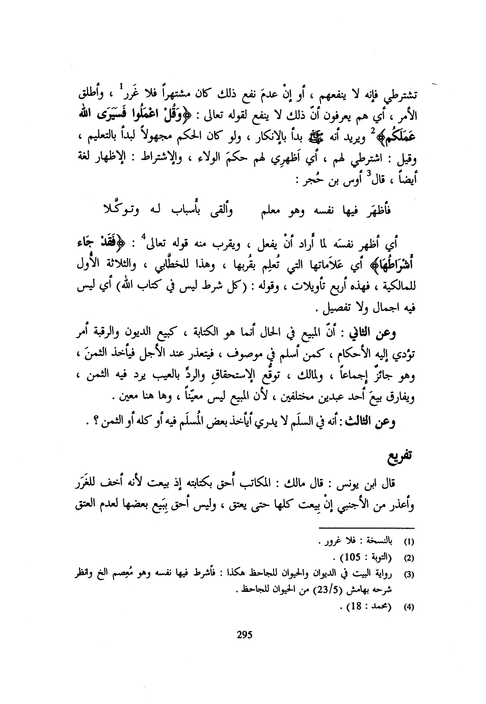 أَيْ أَظْهَرَ نَفْسَهُ لَمَّا أَرَادَ أَنْ يَفْعَلَ وَيَقْرُبُ مِنْهُ قَوْله تَعَالَى {فقد جَاءَ أشراطها} أَيْ عَلَامَاتُهَا الَّتِي تُعْلِمُ بِقُرْبِهَا وَهَذَا لِلْخَطَّابِيِّ وَالثَّلَاثَة الأول للمالكية فَهَذِهِ أَربع تَأْوِيلَاتٍ وَقَوْلُهُ كُلُّ شَرْطٍ لَيْسَ فِي كِتَابِ الله أَي لَيْسَ فِيهِ اجمال وَلَا تَفْصِيل وَعَنِ الثَّانِي أَنَّ الْمَبِيعَ فِي الْحَالِ إِنَّمَا هُوَ الْكِتَابَةُ كَبَيْعِ الدُّيُونِ وَالرَّقَبَةِ أَمْرٌ تُؤَدِّي إِلَيْهِ الْأَحْكَامُ كَمَنْ أَسْلَمَ فِي مَوْصُوفٍ فَيَتَعَذَّرُ عِنْدَ الْأَجَلِ فَيَأْخُذُ الثَّمَنَ وَهُوَ جَائِزٌ إِجْمَاعًا وَلِمَالِكٍ تَوَقُّعُ الِاسْتِحْقَاقِ وَالرَّدُّ بِالْعَيْبِ يُرَدُّ فِيهِ الثَّمَنُ وَيُفَارِقُ بَيْعَ أَحَدِ عَبْدَيْنِ مُخْتَلِفَيْنِ لِأَنَّ الْمَبِيعَ لَيْسَ مُعَيَّنًا وَهَاهُنَا مُعَيَّنٌ وَعَنِ الثَّالِثِ أَنَّهُ فِي السَّلَمِ لَا يَدْرِي أَيَأْخُذُ بَعْضَ الْمُسْلَمِ فِيهِ أَوْ كُلَّهُ أَوِ الثَّمَنَ