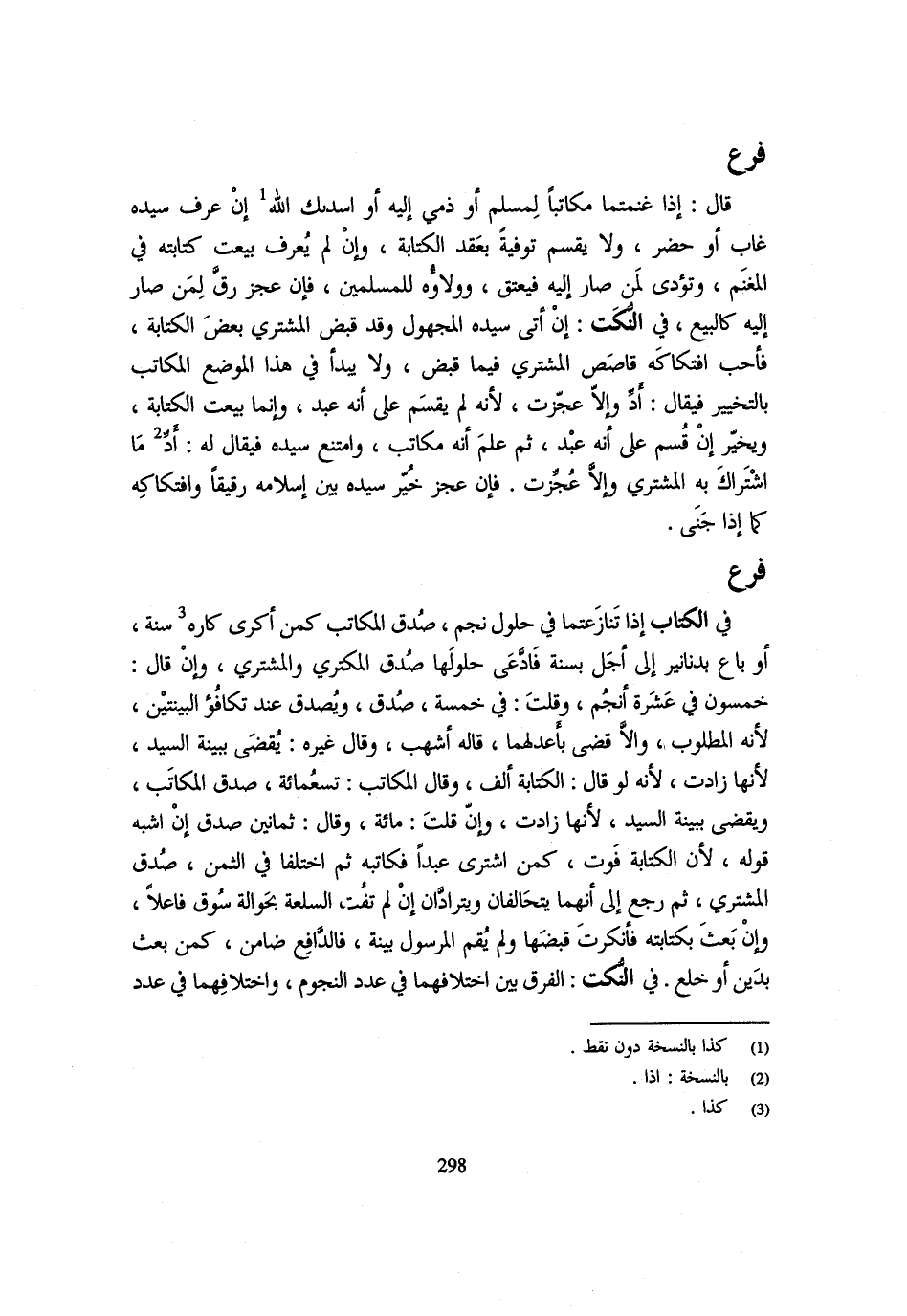 قَالَ إِذَا غَنِمْتُمَا مُكَاتَبًا لِمُسْلِمٍ أَوْ ذمِّي إِلَيْهِ اَوْ اسدلك اللَّهُ إِنْ عُرِفَ سَيِّدُهُ غَابَ أَوْ حَضَرَ وَلَا يُقْسَمُ تَوْفِيَةً بِعَقْدِ الْكِتَابَةِ وَإِنْ لَمْ يعرف بِيعَتْ كِتَابَته فِي الْمغنم وتؤدى لِمَنْ صَارَ إِلَيْهِ فَيُعْتَقُ وَوَلَاؤُهُ لِلْمُسْلِمِينَ فَإِنْ عَجَزَ رُقَّ لِمَنْ صَارَ إِلَيْهِ كَالْبَيْعِ فِي النُّكَتِ إِنْ أَتَى سَيِّدُهُ الْمَجْهُولُ وَقَدْ قَبَضَ المُشْتَرِي بعض الْكِتَابَة فَأحب افتكاكه قاصص الْمُشْتَرِيَ فِيمَا قَبَضَ وَلَا يَبْدَأُ فِي هَذَا الْمَوْضِعِ الْمُكَاتَبُ بِالتَّخْيِيرِ فَيُقَالُ أَدِّ وَإِلَّا عُجِّزْتَ لِأَنَّهُ لَمْ يُقْسَمْ عَلَى أَنَّهُ عَبْدٌ وَإِنَّمَا بِيعَتِ الْكِتَابَةُ وَيُخَيَّرُ إِنْ قُسِمَ عَلَى أَنَّهُ عَبْدٌ ثُمَّ عُلِمَ أَنَّهُ مَكَاتَبٌ وَامْتَنَعَ سَيِّدُهُ فَيُقَالُ لَهُ أَدِّ مَا اشْتَرَاكَ بِهِ الْمُشْتَرِي وَإِلَّا عُجِّزْتَ فَإِنْ عَجَزَ خُيِّرَ سَيِّدُهُ بَيْنَ إِسْلَامِهِ رَقِيقًا وَافْتِكَاكِهِ كَمَا إِذَا جَنَى