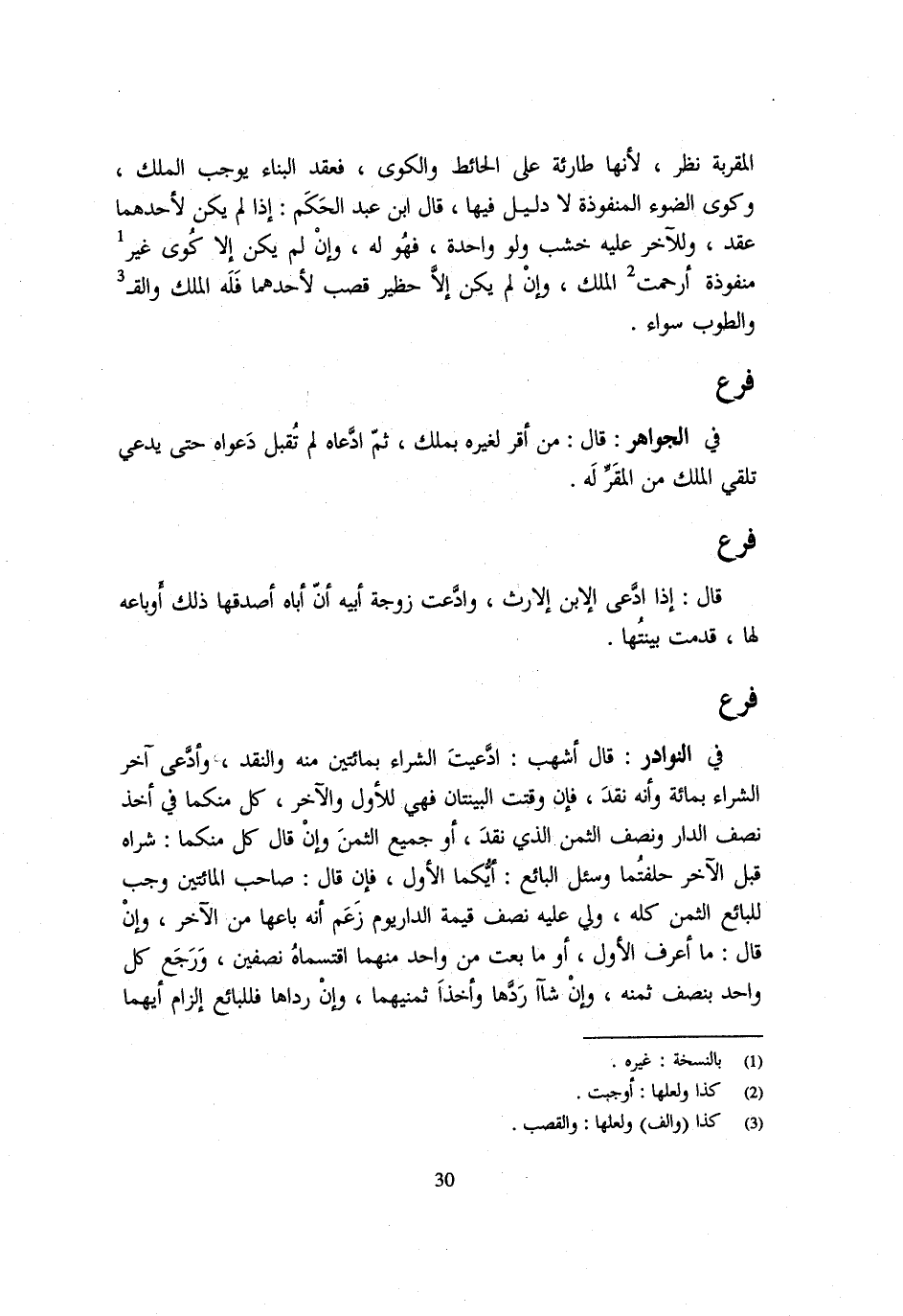 الْمَقْرُبَةِ نَظَرٌ لِأَنَّهَا طَارِئَةٌ عَلَى الْحَائِطِ وَالْكُوَى فَعَقْدُ الْبِنَاءِ يُوجِبُ الْمِلْكَ وَكُوَى الضَّوْءِ الْمَنْفُوذَةِ لَا دَلِيلَ فِيهَا قَالَ ابْنُ عَبْدِ الْحَكَمِ إِذَا لَمْ يَكُنْ لِأَحَدِهِمَا عَقْدٌ وَلِلْآخَرِ عَلَيْهِ خُشُبٌ وَلَوْ وَاحِدَةٌ فَهُوَ لَهُ وَإِنْ لَمْ يَكُنْ إِلَّا كُوًى غَيْرَ مَنْفُوذَةٍ أَرْحَمَتِ الْمِلْكَ وَإِنْ لَمْ يَكُنْ إِلَّا حَظِيرُ قَصَبٍ لِأَحَدِهِمَا فَلهُ الْملك والقصب وَالطُّوبُ سَوَاءٌ