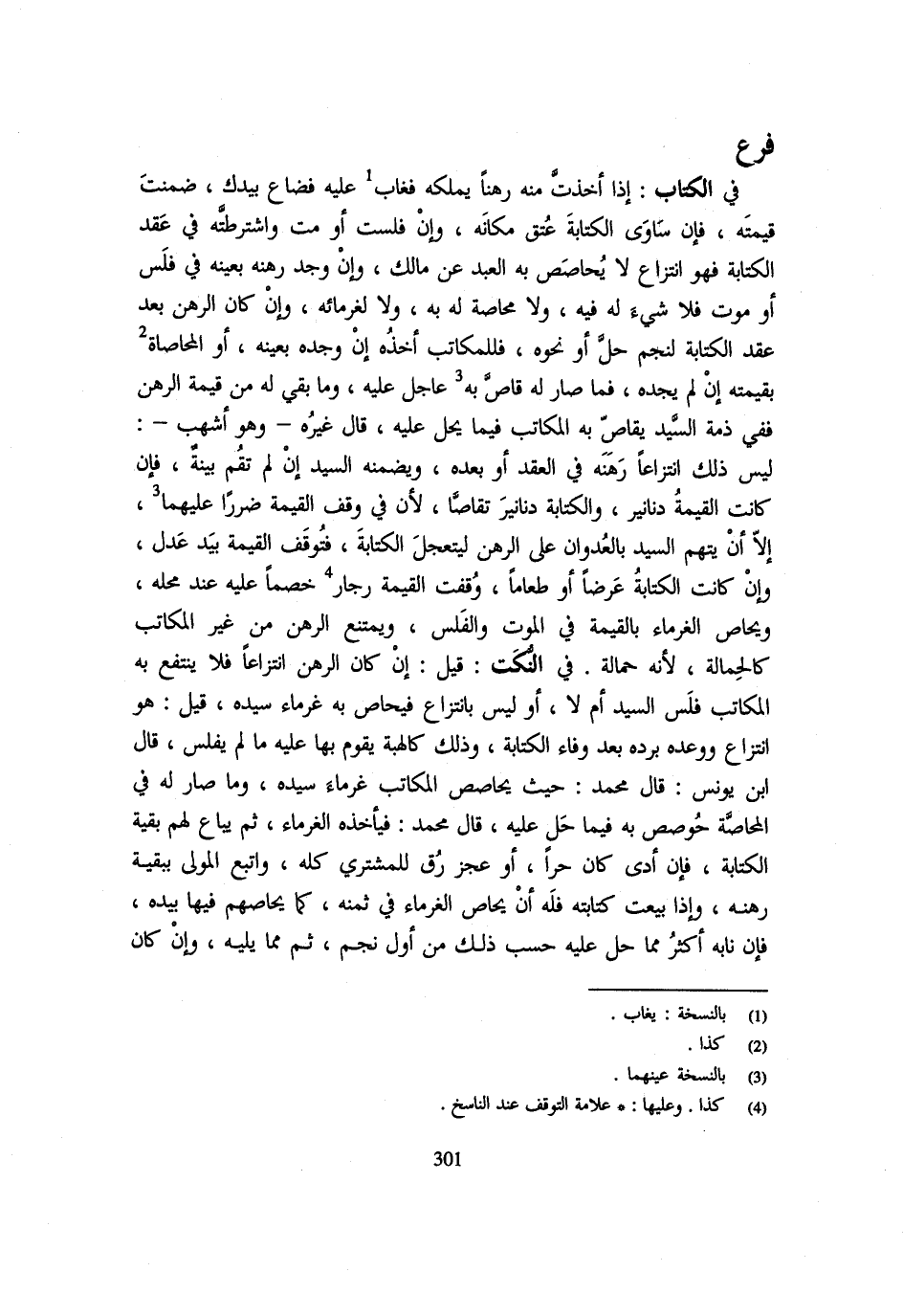 فِي الْكِتَابِ إِذَا أَخَذْتَ مِنْهُ رَهْنًا يَمْلِكُهُ فَغَابَ عَلَيْهِ فَضَاعَ بِيَدِكَ ضَمِنْتَ قِيمَتَهُ فَإِنْ سَاوَى الْكِتَابَةَ عَتَقَ مَكَانَهُ وَإِنْ فَلَسْتَ أَوْ مِتَّ وَاشْتَرَطْتَهُ فِي عَقْدِ الْكِتَابَةِ فَهُوَ انتزاع لَا يحاصص بِهِ العَبْد عَن مَالِكٍ وَإِنْ وُجِدَ رَهْنُهُ بِعَيْنِهِ فِي فَلَسٍ أَوْ مَوْتٍ فَلَا شَيْءَ لَهُ فِيهِ وَلَا مُحَاصَّةَ لَهُ بِهِ وَلَا لِغُرَمَائِهِ وَإِنْ كَانَ الرَّهْنُ بَعْدَ عَقْدِ الْكِتَابَةِ لِنَجْمٍ حَلَّ أَوْ نَحْوِهِ فَلِلْمُكَاتَبِ أَخْذُهُ إِنْ وَجَدَهُ بِعَيْنِهِ أَوِ المحاصاة بِقِيمَتِهِ إِنْ لَمْ يَجِدْهُ فَمَا صَارَ لَهُ قاص بِهِ عَاجل عَلَيْهِ وَمَا بَقِيَ لَهُ مِنْ قِيمَةِ الرَّهْنِ فَفِي ذمَّة اليسد يُقَاصُّ بِهِ الْمُكَاتَبُ فِيمَا يَحِلُّ عَلَيْهِ قَالَ غَيْرُهُ وَهُوَ أَشْهَبُ لَيْسَ ذَلِكَ انْتِزَاعًا رَهَنَهُ فِي الْعَقْدِ أَوْ بَعْدَهُ وَيَضْمَنُهُ السَّيِّدُ إِنْ لَمْ تَقُمْ بَيِّنَةٌ فَإِنْ كَانَتِ الْقِيمَةُ دَنَانِيرَ وَالْكِتَابَةُ دَنَانِيرَ تَقَاصَّا لِأَنَّ فِي وَقْفِ الْقِيمَةِ ضَرَرًا عَلَيْهِمَا إِلَّا أَنْ يَتَّهِمَ السَّيِّدَ بِالْعُدْوَانِ عَلَى الرَّهْنِ لِيَتَعَجَّلَ الْكِتَابَةَ فَتُوقَفُ الْقِيمَةُ بِيَدِ عَدْلٍ وَإِنْ كَانَتِ الْكِتَابَةُ عَرَضًا أَوْ طَعَامًا وقفت الْقيمَة رجار خصما عَلَيْهِ عِنْدَ مَحِلِّهِ وَيُحَاصُّ الْغُرَمَاءُ بِالْقِيمَةِ فِي الْمَوْتِ وَالْفَلَسِ وَيُمْتَنَعُ الرَّهْنُ مِنْ غَيْرِ الْمُكَاتَبِ كَالْحَمَالَةِ لِأَنَّهُ حَمَالَةٌ فِي النُّكَتِ قِيلَ إِنْ كَانَ الرَّهْنُ انْتِزَاعًا فَلَا يَنْتَفِعُ بِهِ الْمُكَاتَبُ فَلَسَ السَّيِّدُ أَمْ لَا أَوْ لَيْسَ بِانْتِزَاعٍ فَيُحَاصُّ بِهِ غُرَمَاءُ سَيِّدِهِ قِيلَ هُوَ انْتِزَاعٌ وَوَعَدَهُ بِرَدِّهِ بَعْدَ وَفَاءِ الْكِتَابَةِ وَذَلِكَ كَالْهِبَةِ يَقُومُ بِهَا عَلَيْهِ مَا لَمْ يُفْلِسْ قَالَ ابْنُ يُونُسَ قَالَ مُحَمَّدٌ حَيْثُ يُحَاصَصُ الْمُكَاتَبُ غُرَمَاءَ سَيِّدِهِ وَمَا صَارَ لَهُ فِي الْمَحَاصَّةِ حُوصِصَ بِهِ فِيمَا حَلَّ عَلَيْهِ قَالَ مُحَمَّدٌ فَيَأْخُذُهُ الْغُرَمَاءُ ثُمَّ يُبَاعُ لَهُمْ بَقِيَّةُ الْكِتَابَةِ فَإِنْ أَدَّى كَانَ حُرًّا أَوْ عَجَزَ رُقَّ لِلْمُشْتَرِي كُلُّهُ وَاتُّبِعَ الْمَوْلَى بِبَقِيَّةِ رَهْنِهِ وَإِذَا بِيعَتْ كِتَابَتُهُ فَلَهُ أَنْ يَحَاصَّ الْغُرَمَاءَ فِي ثَمَنِهِ كَمَا يَحَاصُّهُمْ فِيهَا بِيَدِهِ فَإِنَّ نَابَهُ أَكْثَرُ مِمَّا حَلَّ عَلَيْهِ حُسِبَ ذَلِكَ مِنْ أَوَّلِ نَجْمٍ ثُمَّ مِمَّا يَلِيهِ وَإِنْ كَانَ