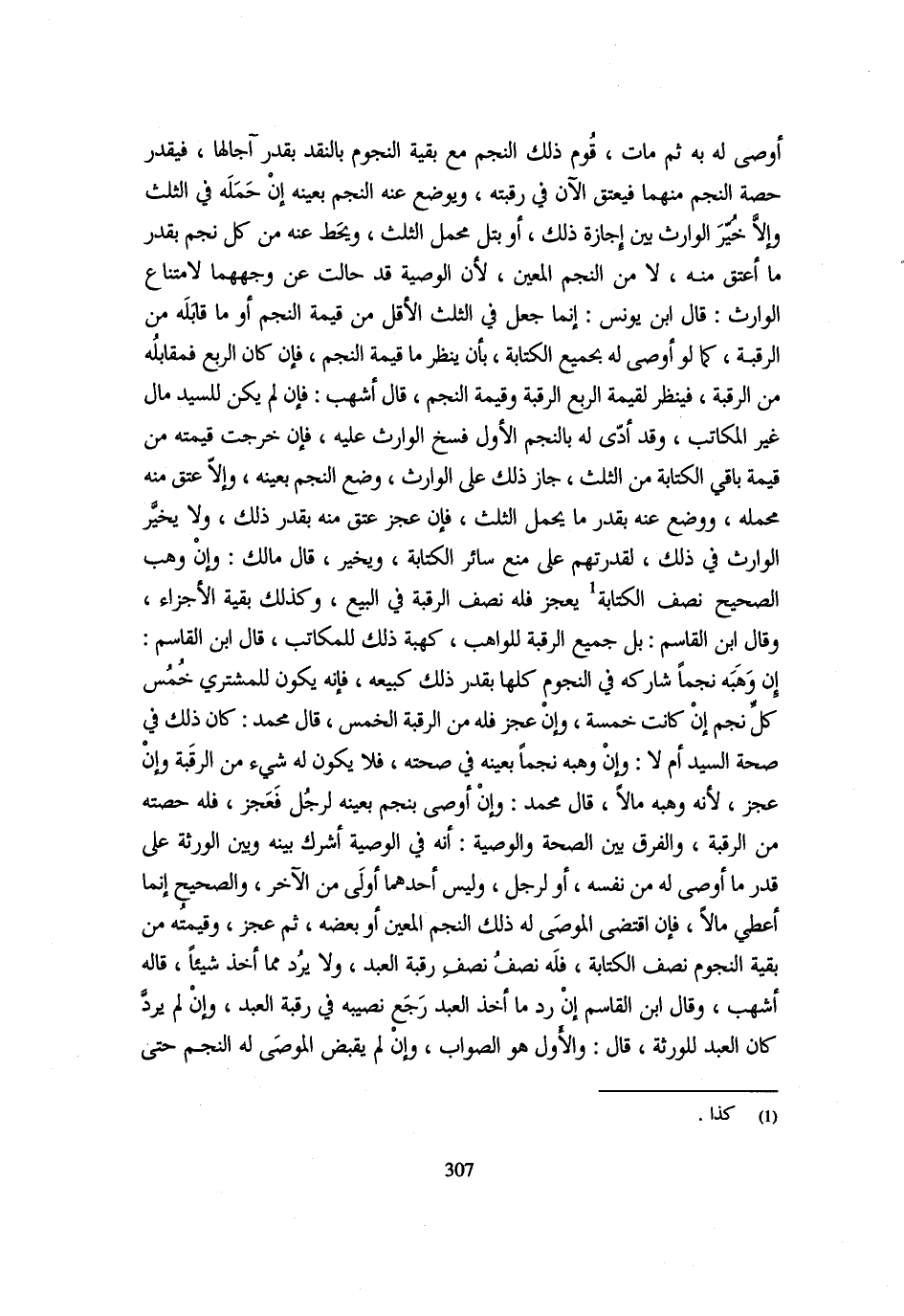 أَوْصَى لَهُ بِهِ ثُمَّ مَاتَ قُوِّمَ ذَلِكَ النَّجْمُ مَعَ بَقِيَّةِ النُّجُومِ بِالنَّقْدِ بِقَدْرِ آجَالِهَا فَيقدر حِصَّة النَّجْم مِنْهُمَا فَيعتق الْآن فِي رَقَبَتِهِ وَيُوضَعُ عَنْهُ النَّجْمُ بِعَيْنِهِ إِنْ حَمَلَهُ فِي الثُّلُثُ وَإِلَّا خُيِّرَ الْوَارِثُ بَيْنَ إِجَازَةِ ذَلِكَ أَوْ بَتْلِ مَحْمَلِ الثُّلُثِ وَيَحُطُّ عَنْهُ مِنْ كُلِّ نَجْمٍ بِقَدْرِ مَا أُعْتِقَ مِنْهُ لَا مِنَ النَّجْمِ الْمُعَيَّنِ لِأَنَّ الْوَصِيَّةَ قَدْ حَالَتْ عَن وجههما لِامْتِنَاعِ الْوَارِثِ قَالَ ابْنُ يُونُسَ إِنَّمَا جُعِلَ فِي الثُّلُثِ الْأَقَلِّ مِنْ قِيمَةِ النَّجْمِ أَوْ مَا قَابَلَهُ مِنَ الرَّقَبَةِ كَمَا لَوْ أَوْصَى لَهُ بِجَمِيعِ الْكِتَابَةِ بِأَنْ يَنْظُرَ مَا قِيمَةُ النَّجْمِ فَإِنْ كَانَ الرُبُعَ فَمُقَابِلُهُ مِنَ الرَّقَبَةِ فَينْظر لقيمة الرّبع الرَّقَبَةِ وَقِيمَةِ النَّجْمِ قَالَ أَشْهَبُ فَإِنْ لَمْ يكن للسَّيِّد مَال غير الْمكَاتب وَقد أدّى لَهُ بِالنَّجْمِ الأول فسخ الْوَارِثُ عَلَيْهِ فَإِنْ خَرَجَتْ قِيمَتُهُ مِنْ قِيمَةِ بَاقِي الْكِتَابَةِ مِنَ الثُّلُثِ جَازَ ذَلِكَ عَلَى الْوَارِث وضع النَّجْمِ بِعَيْنِهِ وَإِلَّا عَتَقَ مِنْهُ مَحْمَلُهُ وَوُضِعَ عَنْهُ بِقَدْرِ مَا يَحْمِلُ الثُّلُثُ فَإِنْ عَجَزَ عَتَقَ مِنْهُ بِقَدْرِ ذَلِكَ وَلَا يُخَيَّرُ الْوَارِثُ فِي ذَلِكَ لِقُدْرَتِهِمْ عَلَى مَنْعِ سَائِرِ الْكِتَابَةِ وَيُخَير قَالَ مَالِكٌ وَإِنْ وَهَبَ الصَّحِيحُ نِصْفَ الْكِتَابَةِ يعجز فَلَهُ نِصْفُ الرَّقَبَةِ فِي الْبَيْعِ وَكَذَلِكَ بَقِيَّةُ الْأَجْزَاءِ وَقَالَ ابْنُ الْقَاسِمِ بَلْ جَمِيعُ الرَّقَبَةِ لِلْوَاهِبِ كَهِبَةِ ذَلِكَ لِلْمُكَاتَبِ قَالَ ابْنُ الْقَاسِمِ إِنْ وَهَبَهُ نَجْمًا شَارَكَهُ فِي النُّجُومِ كُلِّهَا بِقَدْرِ ذَلِكَ كَبَيْعِهِ فَإِنَّهُ يَكُونُ لِلْمُشْتَرِي خُمُسُ كُلِّ نَجْمٍ إِنْ كَانَتْ خَمْسَةً وَإِنْ عَجَزَ فَلَهُ مِنَ الرَّقَبَةِ الْخُمُسُ قَالَ مُحَمَّدٌ كَانَ ذَلِكَ فِي صِحَّةِ السَّيِّدِ أَمْ لَا وَإِنْ وَهَبَهُ نَجْمًا بِعَيْنِهِ فِي صِحَّتِهِ فَلَا يَكُونُ لَهُ شَيْءٌ مِنَ الرَّقَبَةِ وَإِنْ عَجَزَ لِأَنَّهُ وَهَبَهُ مَالًا قَالَ مُحَمَّدٌ وَإِنْ أَوْصَى بِنَجْمٍ بِعَيْنِهِ لِرَجُلٍ فَعَجَزَ فَلَهُ حِصَّتُهُ مِنَ الرَّقَبَةِ وَالْفَرْقُ بَيْنَ الصِّحَّةِ وَالْوَصِيَّةِ أَنَّهُ فِي الْوَصِيَّةِ أَشْرَكَ بَيْنَهُ وَبَيْنَ الْوَرَثَةِ عَلَى قَدْرِ مَا أَوْصَى لَهُ مِنْ نَفْسِهِ أَوْ لِرَجُلٍ وَلَيْسَ أَحَدُهُمَا أَوْلَى مِنَ الْآخَرِ وَالصَّحِيحُ إِنَّمَا أُعْطِيَ مَالًا فَإِنِ اقْتَضَى الْمُوصَى لَهُ ذَلِكَ النَّجْمَ الْمُعَيَّنَ أَوْ بَعْضَهُ ثُمَّ عَجَزَ وَقِيمَتُهُ مِنْ بَقِيَّةِ النُّجُومِ نِصْفُ الْكِتَابَةِ فَلَهُ نِصْفُ نِصْفِ رَقَبَةِ الْعَبْدِ وَلَا يَرُدُّ مِمَّا أَخَذَ شَيْئًا قَالَهُ أَشْهَبُ وَقَالَ ابْنُ الْقَاسِمِ إِنْ رَدَّ مَا أَخَذَ الْعَبْدُ رَجَعَ نَصِيبُهُ فِي رَقَبَةِ الْعَبْدِ وَإِنْ لَمْ يَرُدَّ كَانَ الْعَبْدُ لِلْوَرَثَةِ قَالَ وَالْأَوَّلُ هُوَ الصَّوَابُ وَإِنْ لَمْ يَقْبِضِ الْمُوصَى لَهُ النَّجْمَ حَتَّى