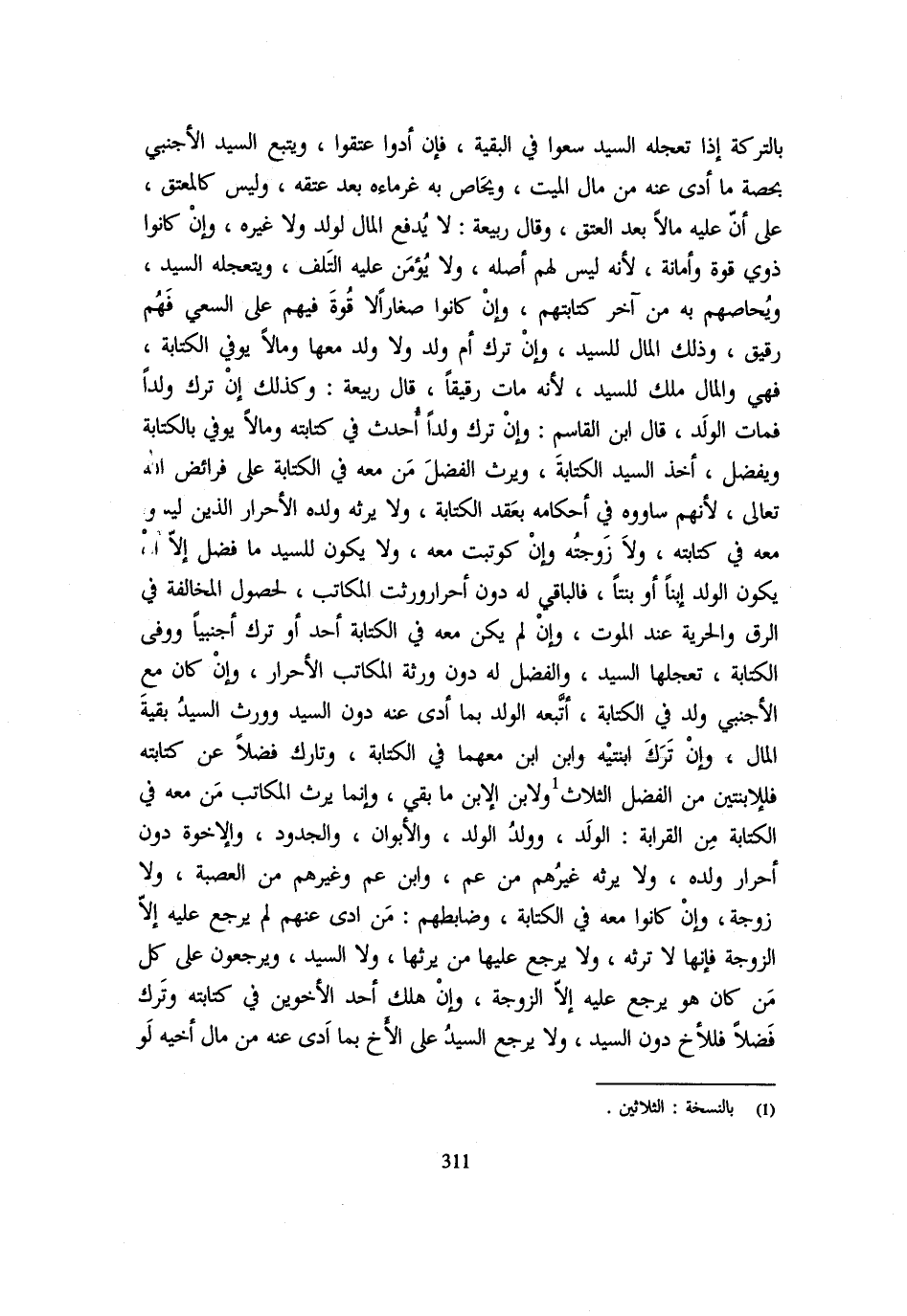 بِالتَّرِكَةِ إِذا تَعَجَّلَهُ السَّيِّدُ سَعَوْا فِي الْبَقِيَّةِ فَإِنْ أَدُّوا عَتَقُوا وَيُتْبِعُ السَّيِّدُ الْأَجْنَبِيَّ بِحِصَّةِ مَا أَدَّى عَنْهُ مِنْ مَالِ الْمَيِّتِ وَيَحَاصُّ بِهِ غُرَمَاءَهُ بَعْدَ عِتْقِهِ وَلَيْسَ كَالْمُعْتَقِ عَلَى أَنَّ عَلَيْهِ مَالًا بَعْدَ الْعِتْقِ وَقَالَ رَبِيعَةُ لَا يَدْفَعُ الْمَالَ لِوَلَدٍ وَلَا غَيْرِهِ وَإِنْ كَانُوا ذَوِي قُوَّةٍ وَأَمَانَةٍ لِأَنَّهُ لَيْسَ لَهُمْ أَصْلُهُ وَلَا يُؤْمَنُ عَلَيْهِ التَّلَفُ وَيَتَعَجَّلُهُ السَّيِّدُ وَيَحَاصُّهُمْ بِهِ مِنْ آخِرِ كِتَابَتِهِمْ وَإِنْ كَانُوا صِغَارًا لَا قُوَّةَ فِيهِمْ عَلَى السَّعْيِ فَهُمْ رَقِيقٌ وَذَلِكَ الْمَالُ لِلسَّيِّدِ وَإِنْ تَرَكَ أُمَّ وَلَدٍ وَلَا وَلَدَ مَعَهَا وَمَالًا يُوَفِّي الْكِتَابَةَ فَهِيَ وَالْمَالُ مِلْكٌ لِلسَّيِّدِ لِأَنَّهُ مَاتَ رَقِيقًا قَالَ رَبِيعَةُ وَكَذَلِكَ إِنْ تَرَكَ وَلَدًا فَمَاتَ الْوَلَدُ قَالَ ابْنُ الْقَاسِمِ وَإِنْ تَرَكَ وَلَدًا أَحْدَثَ فِي كِتَابَتِهِ وَمَالًا يُوفِي بِالْكِتَابَةِ وَيُفْضِلُ أَخَذَ السَّيِّدُ الْكِتَابَةَ وَيَرِثُ الْفَضْلَ مَنْ مَعَهُ فِي الْكِتَابَةِ عَلَى فَرَائِضِ اللَّهِ تَعَالَى لِأَنَّهُمْ سَاوَوْهُ فِي أَحْكَامِهِ بِعَقْدِ الْكِتَابَةِ وَلَا يَرِثُهُ وَلَدُهُ الْأَحْرَارُ الَّذِينَ لَيْسُوا مَعَهُ فِي كِتَابَتِهِ وَلَا زَوْجَتُهُ وَإِنْ كُوتِبَتْ مَعَهُ وَلَا يَكُونُ لِلسَّيِّدِ مَا فَضَلَ إِلَّا أَنْ يَكُونَ الْوَلَدُ ابْنًا أَوْ بِنْتا فالباقي لَهُ دون أَحْرَار ورثت الْمُكَاتَبِ لِحُصُولِ الْمُخَالَفَةِ فِي الرِّقِّ وَالْحُرِّيَّةِ عِنْدَ الْمَوْتِ وَإِنْ لَمْ يَكُنْ مَعَهُ فِي الْكِتَابَةِ أحد اَوْ ترك اجنبيا ووفى الْكِتَابَةِ تَعَجَّلَهَا السَّيِّدُ وَالْفَضْلُ لَهُ دُونَ وَرَثَةِ الْمُكَاتَبِ الْأَحْرَارِ وَإِنْ كَانَ مَعَ الْأَجْنَبِيِّ وَلَدٌ فِي الْكِتَابَةِ اتَّبَعَهُ الْوَلَدُ بِمَا أَدَّى عَنْهُ دُونَ السَّيِّدِ وَوَرِثَ السَّيِّدُ بَقِيَّةَ الْمَالِ وَإِنْ تَرَكَ ابْنَتَيْهِ وَابْنَ ابْنٍ مَعَهُمَا فِي الْكِتَابَةِ وتارك فضلا عَن كِتَابَته فلإبنتين من الْفضل الثَّلَاث وَلابْن الأبن وَمَا بَقِيَ وَإِنَّمَا يَرِثُ الْمُكَاتَبَ مَنْ مَعَهُ فِي الْكِتَابَةِ مِنَ الْقَرَابَةِ الْوَلَدُ وَوَلَدُ الْوَلَدِ وَالْأَبَوَانِ وَالْجُدُودُ وَالْإِخْوَةُ دُونَ أَحْرَارِ وَلَدِهِ وَلَا يَرِثُهُ غَيْرُهُمْ مِنْ عَمٍّ وَابْنِ عَمٍّ وَغَيْرِهِمْ مِنَ الْعَصَبَةِ وَلَا زَوْجَةٍ وَإِنْ كَانُوا مَعَهُ فِي الْكِتَابَةِ وَضَابِطُهُمْ مَنْ أَدَّى عَنْهُمْ لَمْ يَرْجِعْ عَلَيْهِ إِلَّا الزَّوْجَةَ فَإِنَّهَا لَا تَرِثُهُ وَلَا يَرْجِعُ عَلَيْهَا مَنْ يَرِثُهَا وَلَا السَّيِّدُ وَيَرْجِعُونَ عَلَى كُلِّ مَنْ كَانَ هُوَ يَرْجِعُ عَلَيْهِ إِلَّا الزَّوْجَةَ وَإِنْ هَلَكَ أَحَدُ الْأَخَوَيْنِ فِي كِتَابَتِهِ وَتَرَكَ فَضْلًا فَلِلْأَخِ دُونَ السَّيِّدِ وَلَا يَرْجِعُ السَّيِّدُ عَلَى الْأَخِ بِمَا أَدَّى عَنْهُ من مَال أَخِيه لَو