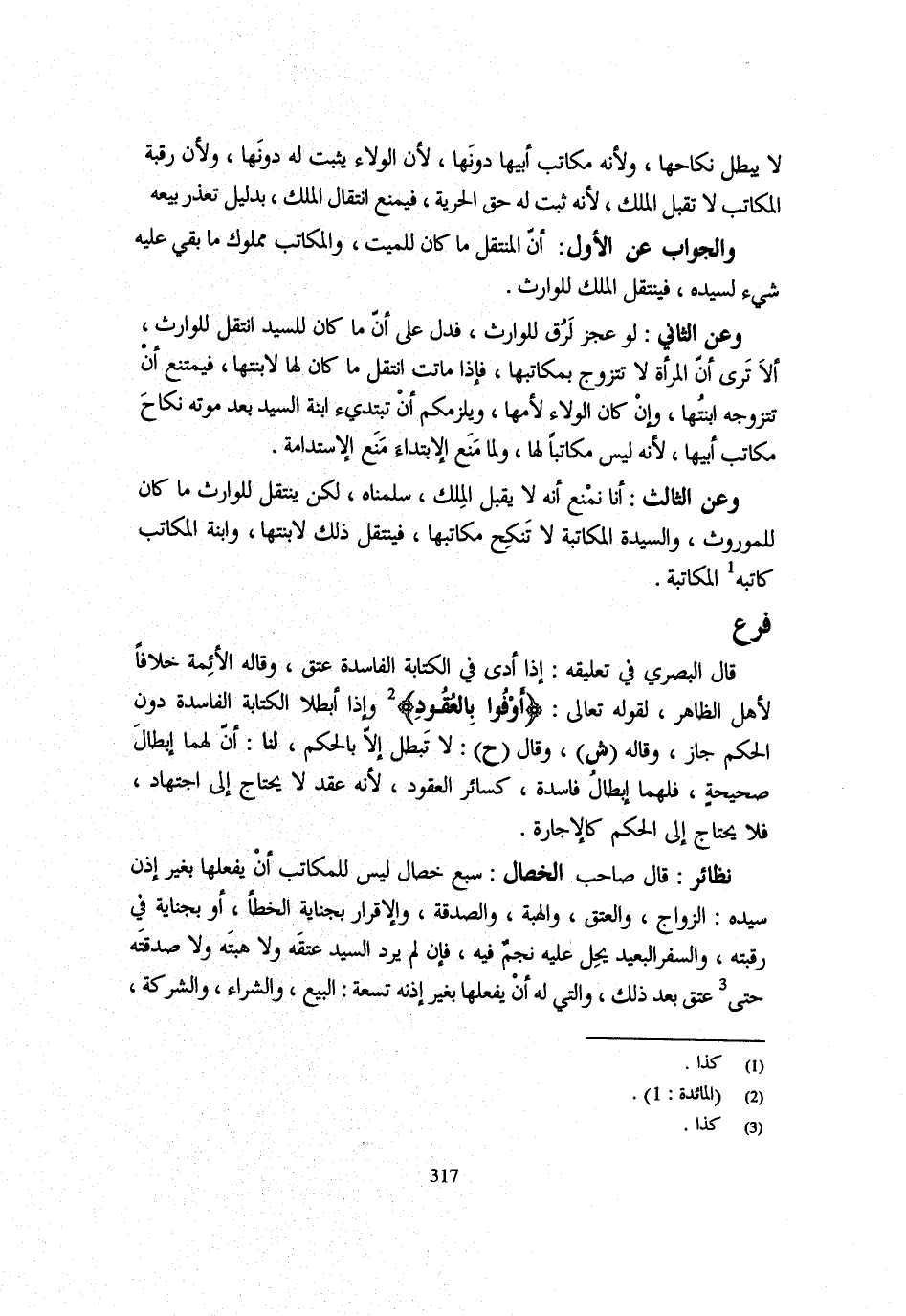 قَالَ الْبَصْرِيُّ فِي تَعْلِيقِهِ إِذَا أَدَّى فِي الْكِتَابَةِ الْفَاسِدَةِ عَتَقَ وَقَالَهُ الْأَئِمَّةُ خِلَافًا لِأَهْلِ الظَّاهِرِ لِقَوْلِهِ تَعَالَى {أَوْفُوا بِالْعُقُودِ} وَإِذا ابطلا الْكِتَابَة ألفاسدة دون الحكم جَازَ وَقَالَهُ ش وَقَالَ ح لَا تَبْطُلُ إِلَّا بالحكم لَنَا أَنَّ لَهُمَا إِبْطَالَ صَحِيحَةٍ فَلَهُمَا إِبْطَالُ فَاسِدَةٍ كَسَائِرِ الْعُقُودِ لِأَنَّهُ عَقْدٌ لَا يَحْتَاجُ إِلَى اجْتِهَادٍ فَلَا يَحْتَاجُ إِلَى الْحُكْمِ كَالْإِجَارَةِ نَظَائِرُ قَالَ صَاحِبُ الْخِصَالِ سَبْعُ خِصَالٍ لَيْسَ لِلْمَكَاتَبِ أَنْ يَفْعَلَهَا بِغَيْرِ إِذَنْ سَيِّدِهِ الزَّوَاجُ وَالْعِتْقُ وَالْهِبَةُ وَالصَّدَقَةُ وَالْإِقْرَارُ بِجِنَايَةِ الْخَطَأِ أَوْ بِجِنَايَةٍ فِي رَقَبَتِهِ وَالسَّفَرُ الْبَعِيدُ يَحِلُّ عَلَيْهِ نَجْمٌ فِيهِ فَإِنْ لَمْ يُرِدِ السَّيِّدُ عِتْقَهُ وَلَا هِبته وَلَا صدقته حَتَّى عتق بعد ذَلِكَ وَالَّتِي لَهُ أَنْ يَفْعَلَهَا بِغَيْرِ إِذْنِهِ تِسْعَةٌ الْبَيْعُ وَالشِّرَاءُ وَالشَّرِكَةُ