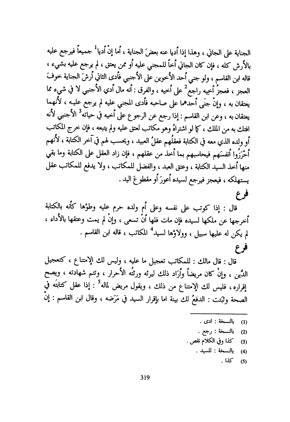 الْجِنَايَة على الْجَانِي وَهَذَا إِذا أَدَّيَا عَنْهُ بَعْضَ الْجِنَايَةِ أَمَّا إِنْ أَدَّيَا جَمِيعًا فَيَرْجِعُ عَلَيْهِ بِالْأَرْشِ كُلِّهِ فَإِنْ كَانَ الْجَانِي أَخًا لِلْمَجْنِيِّ عَلَيْهِ أَوْ مِمَّنْ يُعْتَقُ لَمْ يَرْجِعْ عَلَيْهِ بِشَيْءٍ قَالَهُ ابْنُ الْقَاسِمِ وَلَوْ جَنَى أَحَدُ الْأَخَوَيْنِ عَلَى الْأَجْنَبِيِّ فَأَدَّى الثَّانِي ارش الْجِنَايَة خوف الْعَجز فعجز أَخِيه رَاجع على أَخِيه وألفرق أَنه مَال أُدي الْأَجْنَبِيّ لَا فِي شَيْءٍ مِمَّا يُعْتَقَانِ بِهِ وَإِنْ جَنَى أَحَدُهُمَا عَلَى صَاحِبِهِ فَأَدَّى الْمَجْنِيُّ عَلَيْهِ لَمْ يَرْجِعْ عَلَيْهِ لِأَنَّهُمَا يُعْتَقَانِ بِهِ وَعَنِ ابْنِ الْقَاسِمِ إِذَا رَجَعَ عَنِ الرُّجُوعِ عَلَى أَخِيهِ فِي حَيَاتِهِ الْأَجْنَبِيُّ لِأَنَّهُ افْتَكَّ بِهِ مِنَ الْمِلْكِ كَمَا لَوِ اشْتَرَاهُ وَهُوَ مُكَاتَبٌ لعتق عَلَيْهِ وَلم يتبعهُ فَإِن خرج الْمكَاتب اَوْ وَلَدَهُ الَّذِي مَعَهُ فِي الْكِتَابَةِ فَعَقْلُهُمْ عَقْلُ الْعَبِيدِ وَيُحْسَبُ لَهُمْ فِي آخِرِ الْكِتَابَةِ لِأَنَّهُمْ أَحْرَزُوا أَنْفُسَهُمْ فَيُحَاسِبُهُمْ بِمَا أَخَذَ مِنْ عَقْلِهِمْ فَإِن زَاد الْعقل على الْكِتَابَة وَمَا بَقِيَ مِنْهَا أَخَذَ السَّيِّدُ الْكِتَابَةَ وَعَتَقَ الْعَبْدُ وَالْفَضْلُ لِلْمُكَاتَبِ وَلَا يُدْفَعُ لِلْمُكَاتَبِ عَقْلٌ يَسْتَهْلِكُهُ فَيَعْجَزُ فَيَرْجِعُ لِسَيِّدِهِ أَعْوَرَ أَوْ مَقْطُوعَ الْيَدِ
