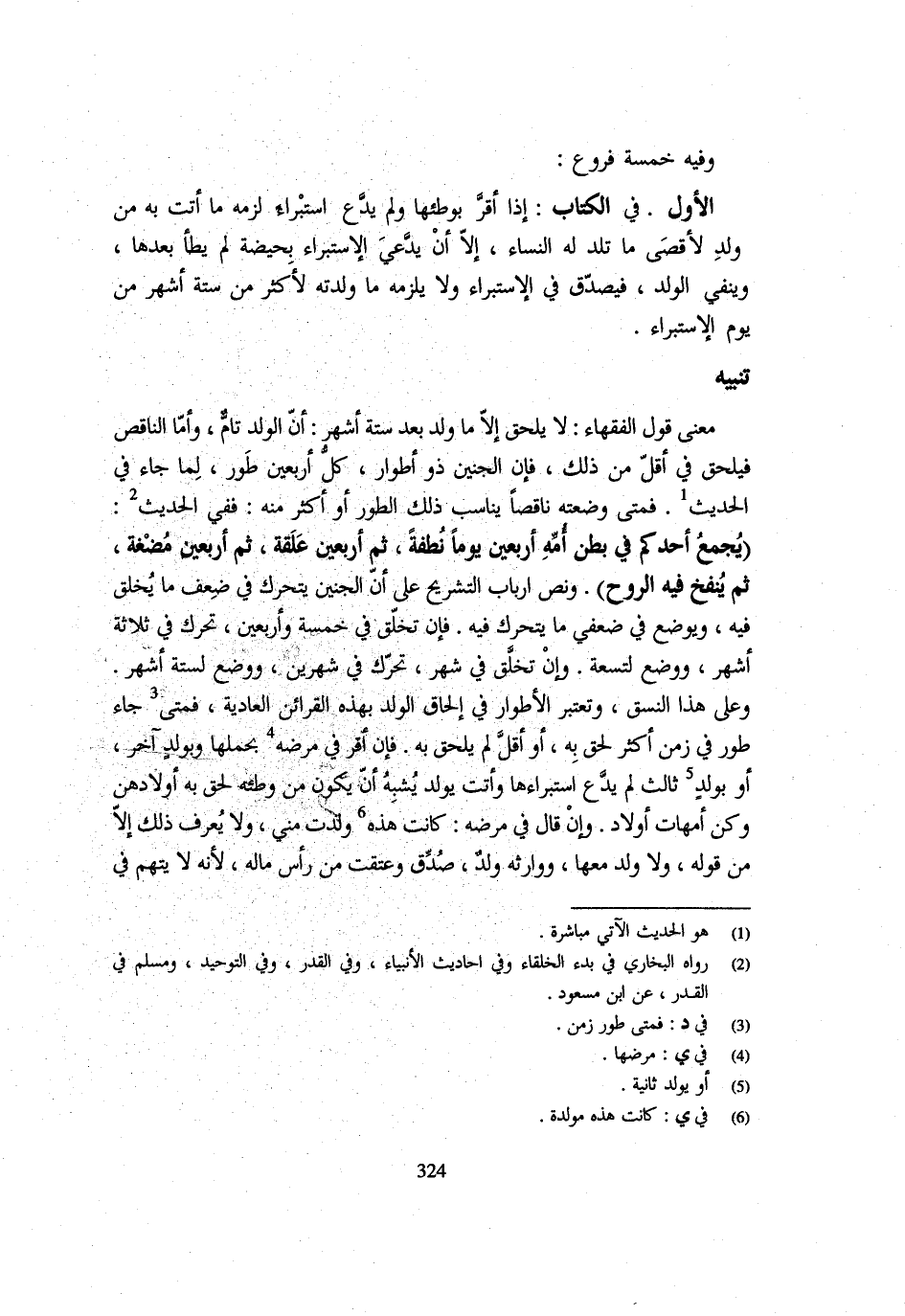 وَفِيهِ خَمْسَةُ فُرُوعٍ الْأَوَّلُ فِي الْكِتَابِ إِذَا أَقَرَّ بِوَطْئِهَا وَلَمْ يَدَّعِ اسْتِبْرَاءً لَزِمَهُ مَا أَتَتْ بِهِ مِنْ وَلَدٍ لِأَقْصَى مَا تَلِدُ لَهُ النِّسَاءُ إِلَّا أَنْ يَدَّعِيَ الِاسْتِبْرَاءَ بِحَيْضَةٍ لَمْ يَطَأْ بَعْدَهَا وَيَنْفِي الْوَلَدَ فَيُصَدَّقُ فِي الِاسْتِبْرَاءِ وَلَا يَلْزَمُهُ مَا وَلَدَتْهُ لِأَكْثَرَ مِنْ سِتَّةِ أَشْهُرٍ مِنْ يَوْمِ الِاسْتِبْرَاءِ تَنْبِيهٌ مَعْنَى قَوْلِ الْفُقَهَاءِ لَا يَلْحَقُ إِلَّا مَا وُلِدَ بَعْدَ سِتَّةِ أَشْهُرٍ أَنَّ الْوَلَدَ تَامٌّ وَأَمَّا النَّاقِصُ فَيَلْحَقُ فِي أَقَلَّ مِنْ ذَلِكَ فَإِنَّ الْجَنِين ذُو اطوار كل أَرْبَعِينَ طور لما جَاءَ فِي الْحَدِيثِ فَمَتَى وَضَعَتْهُ نَاقِصًا يُنَاسِبُ ذَلِك الطّور اَوْ اكثر مِنْهُ فَفِي الْحَدِيثِ يُجْمَعُ أَحَدُكُمْ فِي بَطْنِ أُمِّهِ أَرْبَعِينَ يَوْمًا نُطْفَةً ثُمَّ أَرْبَعِينَ عَلَقَةً ثُمَّ أَرْبَعِينَ مُضْغَةً ثُمَّ يُنْفَخُ فِيهِ الرُّوحُ وَنَصَّ أَرْبَابُ التَّشْرِيحِ عَلَى أَنَّ الْجَنِينَ يَتَحَرَّكُ فِي ضِعْفِ مَا يُخْلَقُ فِيهِ وَيُوضَعُ فِي ضِعْفَيْ مَا يَتَحَرَّكُ فِيهِ فَإِنْ تَخَلَّقَ فِي خَمْسَةٍ وَأَرْبَعِينَ تَحَرَّكَ فِي ثَلَاثَةِ أَشْهُرٍ وَوُضِعَ لِتِسْعَةٍ وَإِنْ تَخَلَّقَ فِي شَهْرٍ تَحَرَّكَ فِي شَهْرَيْنِ وَوضع لسِتَّة اشهر وعَلى هَذَا النَّسَقِ وَتُعْتَبَرُ الْأَطْوَارُ فِي إِلْحَاقِ الْوَلَدِ بِهَذِهِ الْقَرَائِنِ الْعَادِيَّةِ فَمَتَى جَاءَ طَوْرٌ فِي زَمَنٍ أَكْثَرَ لَحِقَ بِهِ أَوْ أَقَلَّ لَمْ يَلْحَقْ بِهِ فَإِنْ أَقَرَّ فِي مَرَضِهِ بِحَمْلِهَا وبولد آخر اَوْ بِولد ثَالِث لم يدع استبراءها وَأَتَتْ يُولد يُشْبِهُ أَنْ يَكُونَ مِنْ وَطْئِهِ لَحِقَ بِهِ أَوْلَادُهُنَّ وَكُنَّ أُمَّهَاتِ أَوْلَادٍ وَإِنْ قَالَ فِي مَرَضِهِ كَانَتْ هَذِهِ وَلَدَتْ مِنِّي وَلَا يُعْرَفُ ذَلِكَ إِلَّا مِنْ قَوْلِهِ وَلَا وَلَدَ مَعَهَا وَوَارِثُهُ وَلَدٌ صُدِّقَ وَعَتَقَتْ مِنْ رَأْسِ مَالِهِ لِأَنَّهُ لَا يُتَّهَمُ فِي