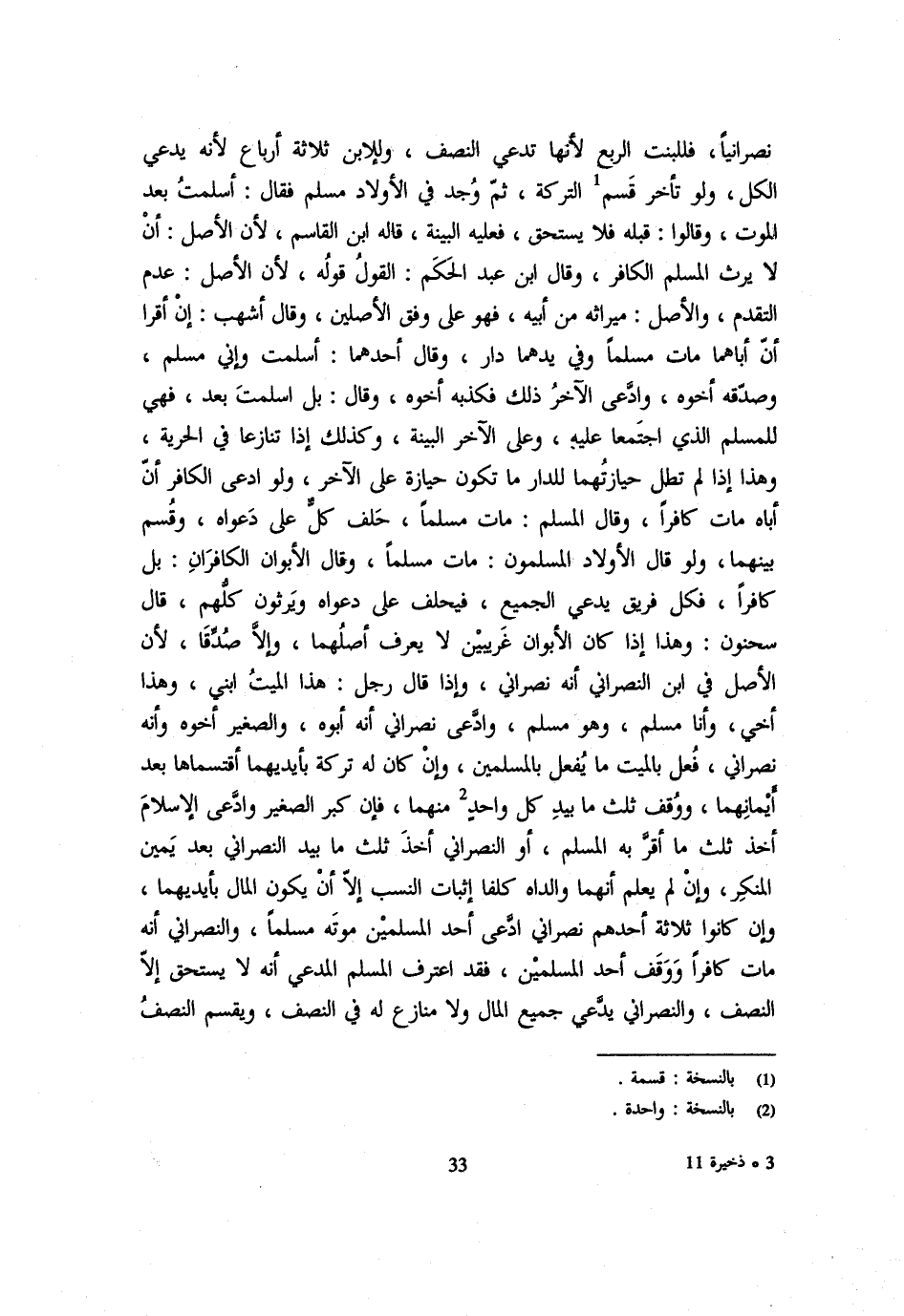 نَصْرَانِيًّا فَلِلْبِنْتِ الرُّبُعُ لِأَنَّهَا تَدَّعِي النِّصْفَ وَلِلِابْنِ ثَلَاثَةُ أَرْبَاعٍ لِأَنَّهُ يَدَّعِي الْكُلَّ وَلَوْ تَأَخَّرَ قَسْمُ التَّرِكَةِ ثُمَّ وُجِدَ فِي الْأَوْلَادِ مُسْلِمٌ فَقَالَ أَسْلَمْتُ بَعْدَ الْمَوْتِ وَقَالُوا قَبْلَهُ فَلَا يسْتَحق فَعَلَيْهِ الْبَيِّنَةُ قَالَهُ ابْنُ الْقَاسِمِ لِأَنَّ الْأَصْلُ أَنْ لَا يَرِثَ الْمُسْلِمُ الْكَافِرَ وَقَالَ ابْنُ عَبْدِ الْحَكَمِ الْقَوْلُ قَوْلُهُ لِأَنَّ الْأَصْلَ عَدَمُ التَّقَدُّمِ وَالْأَصْلُ مِيرَاثُهُ مِنْ أَبِيهِ فَهُوَ عَلَى وفْق الْأَصْلَيْنِ وَقَالَ أَشهب إِن أقرّ أَنَّ أَبَاهُمَا مَاتَ مُسْلِمًا وَفِي يَدِهِمَا دَارٌ وَقَالَ أَحدهمَا أسلمت وَإِنِّي مُسلم وَصَدَّقَهُ أَخُوهُ وَادَّعَى الْآخَرُ ذَلِكَ فَكَذَّبَهُ أَخُوهُ وَقَالَ بَلِ أَسْلَمْتُ بَعْدُ فَهِيَ لِلْمُسْلِمِ الَّذِي اجْتَمَعَا عَلَيْهِ وَعَلَى الْآخَرِ الْبَيِّنَةُ وَكَذَلِكَ إِذَا تَنَازَعَا فِي الْحُرِّيَّةِ وَهَذَا إِذَا لَمْ تَطُلْ حِيَازَتُهُمَا لِلدَّارِ مَا تَكُونُ حِيَازَةً عَلَى الْآخَرِ وَلَوِ ادَّعَى الْكَافِرُ أَنَّ أَبَاهُ مَاتَ كَافِرًا وَقَالَ الْمُسْلِمُ مَاتَ مُسْلِمًا حَلَفَ كُلٌّ عَلَى دَعْوَاهُ وَقُسِّمَ بَيْنَهُمَا وَلَوْ قَالَ الْأَوْلَادُ الْمُسْلِمُونَ مَاتَ مُسْلِمًا وَقَالَ الْأَبَوَانِ الْكَافِرَانِ بَلْ كَافِرًا فَكُلُّ فَرِيقٍ يَدَّعِي الْجَمِيعَ فَيَحْلِفُ عَلَى دَعْوَاهُ وَيَرِثُونَ كُلُّهُمْ قَالَ سَحْنُونٌ وَهَذَا إِذَا كَانَ الْأَبَوَانِ غَرِيبَيْنِ لَا يُعْرَفُ أَصْلُهُمَا وَإِلَّا صُدِّقَا لِأَنَّ الْأَصْلَ فِي ابْنِ النَّصْرَانِيِّ أَنَّهُ نَصْرَانِيٌّ وَإِذَا قَالَ رَجُلٌ هَذَا الْمَيِّتُ ابْنِي وَهَذَا أَخِي وَأَنَا مُسْلِمٌ وَهُوَ مُسْلِمٌ وَادَّعَى نَصْرَانِيٌّ أَنَّهُ أَبُوهُ وَالصَّغِيرُ أَخُوهُ وَأَنَّهُ نَصْرَانِيٌّ فُعِلَ بِالْمَيِّتِ مَا يُفْعَلُ بِالْمُسْلِمِينَ وَإِنْ كَانَ لَهُ تَرِكَةٌ بِأَيْدِيهِمَا اقْتَسَمَاهَا بَعْدَ أَيْمَانِهِمَا وَوُقِفَ ثُلُثُ مَا بِيَدِ كُلِّ وَاحِدٍ مِنْهُمَا فَإِنْ كَبُرَ الصَّغِيرُ وَادَّعَى الْإِسْلَامَ أَخَذَ ثُلُثَ مَا أَقَرَّ بِهِ الْمُسْلِمُ أَوِ النَّصْرَانِيُّ أَخَذَ ثُلُثَ مَا بِيَدِ النَّصْرَانِيِّ بَعْدَ يَمِينِ الْمُنْكِرِ وَإِنْ لَمْ يعلم أَنَّهُمَا والداه كُلِّفَا إِثْبَاتَ النَّسَبِ إِلَّا أَنْ يَكُونَ الْمَالُ بأيديهما وَإِن كَانُوا ثَلَاثَة أحدهم نَصْرَانِيّ وَادّعى أَحَدُ الْمُسْلِمِينَ مَوْتَهُ مُسْلِمًا وَالنَّصْرَانِيُّ أَنَّهُ مَاتَ كَافِرًا وَوَقَفَ أَحَدُ الْمُسْلِمِينَ فَقَدِ اعْتَرَفَ الْمُسْلِمُ الْمُدَّعِي أَنَّهُ لَا يَسْتَحِقُّ إِلَّا النِّصْفَ وَالنَّصْرَانِيُّ يَدَّعِي جَمِيعَ الْمَالِ وَلَا مُنَازِعَ لَهُ فِي النِّصْفِ وَيُقَسَّمُ النِّصْفُ