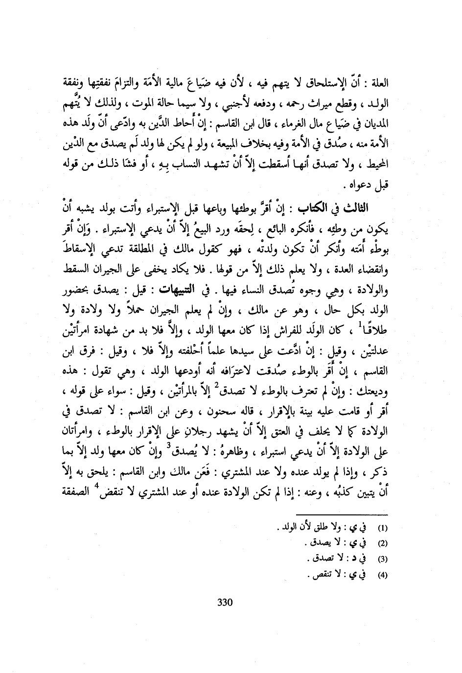 الْعِلَّةُ أَنَّ الِاسْتِلْحَاقَ لَا يُتَّهَمُ فِيهِ لِأَنَّ فِيهِ ضَيَاعَ مَالِيَّةِ الْأَمَةِ وَالْتِزَامَ نَفَقَتِهَا وَنَفَقَةِ الْوَلَدِ وَقَطْعَ مِيرَاثِ رَحِمِهِ وَدَفْعَهُ لِأَجْنَبِيٍّ وَلَا سِيَّمَا حَالَةَ الْمَوْتِ وَلِذَلِكَ لَا يُتَّهَمُ الْمِدْيَانُ فِي ضَيَاعِ مَالِ الْغُرَمَاءِ قَالَ ابْنُ الْقَاسِمِ إِنْ أَحَاطَ الدَّيْنُ بِهِ وَادَّعَى أَنَّ وَلَدَ هَذِهِ الْأَمَةِ مِنْهُ صُدِّقَ فِي الْأَمَةِ وَفِيهِ بِخِلَافِ الْمَبِيعَةِ وَلَوْ لَمْ يَكُنْ لَهَا وَلَدٌ لَمْ يُصَدَّقْ مَعَ الدَّيْنِ الْمُحِيطِ وَلَا تُصَدَّقْ أَنَّهَا أسقطت إِلَّا أَن تشهد النساب بِهِ أَوْ فَشَا ذَلِكَ مِنْ قَوْلِهِ قَبْلَ دَعْوَاهُ الثَّالِثُ فِي الْكِتَابِ إِنْ أَقَرَّ بِوَطْئِهَا وَبَاعَهَا قَبْلَ الِاسْتِبْرَاءِ وَأَتَتْ بِوَلَدٍ يُشْبِهُ أَنْ يَكُونَ مِنْ وَطْئِهِ فَأَنْكَرَهُ الْبَائِعُ لِحَقِّهِ وَرَدَّ الْبَيْعَ إِلَّا أَنْ يَدَّعِيَ الِاسْتِبْرَاءَ وَإِنْ أَقَرَّ بِوَطْءِ أَمَتِهِ وَأَنْكَرَ أَنْ تَكُونَ وَلَدَتْهُ فَهُوَ كَقَوْلِ مَالِكٍ فِي الْمُطَلَّقَةِ تَدَّعِي الْإِسْقَاطَ وَانْقِضَاءَ الْعِدَّةِ وَلَا يُعْلَمُ ذَلِكَ إِلَّا مِنْ قَوْلِهَا فَلَا يَكَادُ يَخْفَى عَلَى الْجِيرَانِ السَّقْطُ وَالْوِلَادَةُ وَهِيَ وُجُوهٌ تُصَدَّقُ النِّسَاءُ فِيهَا فِي التَّنْبِيهَاتِ قِيلَ يُصَدَّقُ بِحُضُورِ الْوَلَدِ بِكُلِّ حَالٍ وَهُوَ عَنْ مَالِكٍ وَإِنْ لَمْ يَعْلَمِ الْجِيرَانُ حَمْلًا وَلَا وِلَادَةً وَلَا طَلَاقًا كَانَ الْوَلَدُ لِلْفِرَاشِ إِذَا كَانَ مَعَهَا الْوَلَدُ وَإِلَّا فَلَا بُدَّ مِنْ شَهَادَةِ امْرَأَتَيْنِ عَدْلَتَيْنِ وَقِيلَ إِنِ ادَّعَتْ عَلَى سَيِّدِهَا عِلْمًا أَحْلَفَتْهُ وَإِلَّا فَلَا وَقِيلَ فَرَّقَ ابْنُ الْقَاسِمِ إِنْ أَقَرَّ بِالْوَطْءِ صُدِّقَتْ لِاعْتِرَافِهِ أَنَّهُ أَوْدَعَهَا الْوَلَدَ وَهِيَ تَقُولُ هَذِهِ وَدِيعَتُكَ وَإِنْ لَمْ تَعْتَرِفْ بِالْوَطْءِ لَا تُصَدَّقُ إِلَّا بِالْمَرْأَتَيْنِ وَقِيلَ سَوَاءً عَلَى قَوْلِهِ أَقَرَّ أَوْ قَامَتْ عَلَيْهِ بَيِّنَةٌ بِالْإِقْرَارِ قَالَهُ سَحْنُونٌ وَعَنِ ابْنِ الْقَاسِمِ لَا تُصَدَّقُ فِي الْوِلَادَةِ كَمَا لَا يَحْلِفُ فِي الْعِتْقِ إِلَّا أَنْ يَشْهَدَ رَجُلَانِ عَلَى الْإِقْرَارِ بِالْوَطْءِ وَامْرَأَتَانِ عَلَى الْوِلَادَةِ إِلَّا أَنْ يَدَّعِيَ اسْتِبْرَاءً وَظَاهِرُهُ لَا يُصَدَّقُ وَإِنْ كَانَ مَعَهَا وَلَدٌ إِلَّا بِمَا ذُكِرَ وَإِذَا لَمْ يُولَدْ عِنْدَهُ وَلَا عِنْدَ الْمُشْتَرِي فَعَنْ مَالِكٍ وَابْنِ الْقَاسِمِ يَلْحَقُ بِهِ إِلَّا أَنْ يَتَبَيَّنَ كَذِبُهُ وَعَنْهُ إِذَا لَمْ تَكُنِ الْوِلَادَةُ عِنْدَهُ أَوْ عِنْدَ الْمُشْتَرِي لَا تنقض الصَّفْقَة