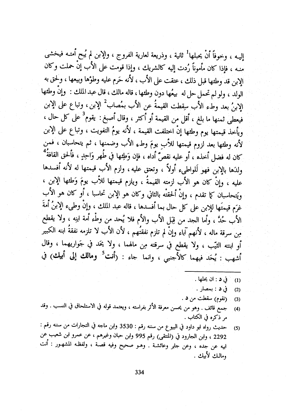 إِلَيْهِ وَخَوْفًا أَنْ يُحْبِلَهَا ثَانِيَةً وَذَرِيعَةً لِعَارِيَةِ الْفُرُوجِ وَالِابْنُ لَمْ يُبِحْ أَمَتَهُ فَيُخْشَى مِنْهُ فَإِذَا كَانَ مَأْمُونًا رُدَّتْ إِلَيْهِ كَالشَّرِيكِ وَإِذَا قَوِّمَتْ عَلَى الْأَبِ إِنْ حَمَلَتْ وَكَانَ الِابْنُ قَدْ وَطِئَهَا قَبْلَ ذَلِكَ عَتَقَتْ عَلَى الْأَبِ لِأَنَّهُ حَرُمَ عَلَيْهِ وَطْؤُهَا وَبَيْعُهَا وَلَحِقَ بِهِ الْوَلَدُ وَلَوْ لَمْ تَحْمِلْ حَلَّ لَهُ بَيْعُهَا دُونَ وَطْئِهَا قَالَهُ مَالِكٌ قَالَ عَبْدُ الْمَلِكِ وَإِنْ وَطِئَهَا الِابْنُ بَعْدَ وَطْءِ الْأَبِ سَقَطَتِ الْقِيمَةُ عَنِ الْأَبِ بِمُصَابِ الِابْنِ وَتُبَاعُ عَلَى الِابْنِ فَيُعْطَى ثَمَنَهَا مَا بَلَغَ أَقَلَّ مِنَ الْقيمَة اَوْ اكثر وَقَالَ اصبغ يقوم عَلَى كُلِّ حَالٍ وَيَأْخُذُ قِيمَتَهَا يَوْمَ وَطِئَهَا إِنِ اخْتَلَفَتِ الْقِيمَةُ لِأَنَّهُ يَوْمُ التَّفْوِيتِ وَتُبَاعُ عَلَى الِابْنِ لِأَنَّهُ وَطِئَهَا بَعْدَ لُزُومِ قِيمَتِهَا لِلْأَبِ يَوْمَ وَطْءِ الْأَبِ وَضَمِنَهَا ثُمَّ يَتَحَاسَبَانِ فَمَنْ كَانَ لَهُ فَضْلٌ أَخَذَهُ أَوْ عَلَيْهِ نقص أَدَّاهُ فَإِن وَطئهَا فِي طُهْرٍ وَاحِدٍ فَأَلْحَقَ الْقَافَةَ وَلَدَهَا بِالِابْنِ فَهُوَ لِلْوَاطِئِ أَوَّلًا وَتُعْتَقُ عَلَيْهِ وَلَزِمَ الْأَبُ قِيمَتَهَا لَهُ لِأَنَّهُ أَفْسَدَهَا عَلَيْهِ وَإِنْ كَانَ هُوَ الْأَبُ لَزِمَتْهُ الْقِيمَةُ وَيَلْزَمُ قِيمَتُهَا لِلْأَبِ يَوْمَ وَطِئَهَا الِابْنُ وَيَتَحَاسَبَانِ كَمَا تَقَدَّمَ وَإِنَ أَلْحَقْتَهُ بِالثَّانِي وَكَانَ هُوَ الِابْنَ تَحَاسَبَا أَوْ كَانَ هُوَ الْأَبَ غَرِمَ قِيمَتَهَا لِلِابْنِ عَلَى كُلِّ حَالٍ بِمَا أَفْسَدَهَا قَالَهُ عَبْدُ الْمَلِكِ وَإِنْ وَطِئَ الِابْنُ أَمَةَ الْأَبِ حُدَّ وَأَمَّا الْجَدُّ مِنْ قِبَلِ الْأَبِ وَالْأُمِّ فَلَا يُحَدُّ مِنْ وَطْءِ أَمَةِ ابْنِهِ وَلَا يُقْطَعُ مِنْ سَرِقَةِ مَالِهِ لِأَنَّهُمْ آبَاءٌ وَإِنْ لَمْ تَلْزَمْ نَفَقَتُهُمْ لِأَنَّ الْأَبَ لَا تَلْزَمُهُ نَفَقَةُ ابْنِهِ الْكَبِيرِ أَوِ ابْنَتِهِ الثَّيِّبِ وَلَا يُقْطَعُ فِي سَرِقَتِهِ مِنْ مَالِهِمَا وَلَا يُحَدُّ فِي جَوَارِيهِمَا وَقَالَ أَشْهَبُ يُحَدُّ فِيهِمَا كَالْأَجْنَبِيِّ وَإِنَّمَا جَاءَ أَنْتَ وَمَالُكَ إِلَى أَبِيكَ فِي