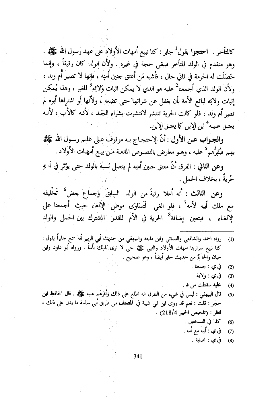 كالمتأخر احتجبوا بِقَوْلِ جَابِرٍ كُنَّا نَبِيعُ أُمَّهَاتَ الْأَوْلَادِ عَلَى عَهْدِ رَسُولِ اللَّهِ - صَلَّى اللَّهُ عَلَيْهِ وَسَلَّم َ - وَهُوَ مُتَقَدِّمٌ فِي الْوَلَدِ الْمُتَأَخِّرِ فَيَبْقَى حُجَّةً فِي غَيْرِهِ وَلِأَنَّ الْوَلَدَ كَانَ رَقِيقًا وَإِنَّمَا حَصَلَتْ لَهُ الْحُرْمَةُ فِي ثَانِي حَالٍ فَأَشْبَهَ مَنْ أَعْتَقَ جَنِينَ أَمَتِهِ فَإِنَّهَا لَا تَصِيرُ أُمَّ وَلَدٍ وَلِأَنَّ الْوَلَدَ الَّذِي أَجْمَعْنَا عَلَيْهِ هُوَ الَّذِي لَا يُمْكِنُ إِثْبَاتُ وَلَائِهِ لِلْغَيْرِ وَهَذَا يُمْكِنُ إِثْبَاتُ وَلَائِهِ لِبَائِعِ الْأَمَةِ بِأَنْ يَغْفُلَ عَنْ شِرَائِهَا حَتَّى تَضَعَهُ وَلِأَنَّهَا لَوِ اشْتَرَاهَا أَبوهُ تَصِرْ أُمَّ وَلَدٍ فَلَوْ كَانَتِ الْحُرِّيَّةُ تَنْتَشِرُ لَانْتَشَرَتْ بِشِرَاءِ الْجَدِّ لِأَنَّهُ كَالْأَبِ لِأَنَّهُ يَعْتِقُ عَلَيْهِ ابْنُ الِابْنِ كَمَا يَعْتِقُ الِابْنُ وَالْجَوَابُ عَنِ الْأَوَّلِ أَنَّ الِاحْتِجَاجَ بِهِ مَوْقُوفٌ عَلَى عِلْمِ رَسُولِ اللَّهِ - صَلَّى اللَّهُ عَلَيْهِ وَسَلَّم َ - بِهِمْ فَيُقِرُّهُمْ عَلَيْهِ وَهُوَ مُعَارَضٌ بِالنُّصُوصِ الْمَانِعَةِ مِنْ بَيْعِ أُمَّهَاتِ الْأَوْلَادِ وَعَنِ الثَّانِي الْفَرُقُ أَنَّ مُعْتِقَ جَنِينَ أَمَتِهِ لَمْ يَتَّصِلْ نَسَبُهُ بِالْوَلَدِ حَتَّى يُؤَثِّرَ فِي أَمَتِهِ حَرِيَّةً بِخِلَافِ الْحمل وَعَن الثَّالِث أَنه اعلا رُتْبَةً مِنَ الْوَلَدِ السَّابِقِ بِإِجْمَاعِ بَعْضِ تَخْلِيقِهِ مَعَ مِلْكِ أَبِيهِ لِأُمِّهِ فَلَوِ أُلْغِيَ لَتَسَاوَى مَوْطِنُ الْإِلْغَاءِ حَيْثُ أَجْمَعْنَا عَلَى الْإِلْغَاءِ فَيَتَعَيَّنُ إِضَافَةُ الْحُرِّيَّةِ فِي الْأُمِّ لِلْقَدْرِ الْمُشْتَرَكِ بَيْنَ الْحمل وَالْولد