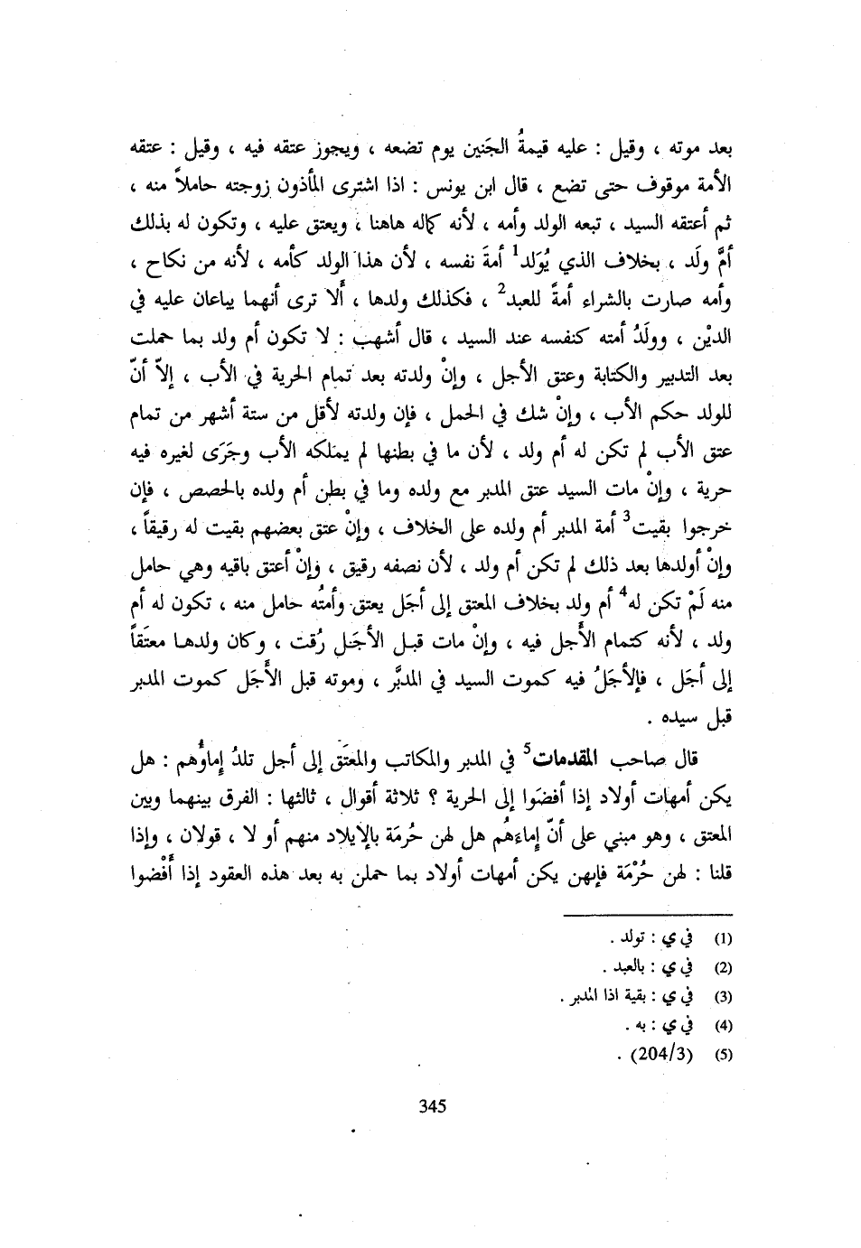 بَعْدَ مَوْتِهِ وَقِيلَ عَلَيْهِ قِيمَةُ الْجَنِينِ يَوْمَ تَضَعُهُ وَيَجُوزُ عِتْقُهُ فِيهِ وَقِيلَ عِتْقُهُ الْأَمَةَ مَوْقُوفٌ حَتَّى تَضَعَ قَالَ ابْنُ يُونُسَ إِذَا اشْتَرَى الْمَأْذُونُ زَوْجَتَهُ حَامِلًا مِنْهُ ثُمَّ أَعْتَقَهُ السَّيِّدُ تَبِعَهُ الْوَلَدُ وَأُمُّهُ لِأَنَّهُ كَمَالِهِ هَاهُنَا وَيُعْتَقُ عَلَيْهِ وَتَكُونُ لَهُ بِذَلِكَ أُمَّ وَلَدٍ بِخِلَافِ الَّذِي يُوَلِّدُ أَمَةَ نَفْسِهِ لِأَنَّ هَذَا الْوَلَدَ كَأُمِّهِ لِأَنَّهُ مِنْ نِكَاحٍ وَأُمُّهُ صَارَتْ بِالشِّرَاءِ أَمَةً لِلْعَبْدِ فَكَذَلِكَ وَلَدُهَا أَلَا تَرَى أَنَّهُمَا يُبَاعَانِ عَلَيْهِ فِي الدَّيْنِ وَوَلَدُ أَمَتِهِ كنفسه عِنْد السَّيِّد قَالَ أَشْهَبُ لَا تَكُونُ أُمَّ وَلَدٍ بِمَا حَمَلَتْ بَعْدَ التَّدْبِيرِ وَالْكِتَابَةِ وَعِتْقِ الْأَجَلِ وَإِنْ وَلَدَتْهُ بَعْدَ تَمَامِ الْحُرِّيَّةِ فِي الْأَبِ إِلَّا أَنَّ لِلْوَلَدِ حُكْمَ الْأَبِ وَإِنْ شَكَّ فِي الْحَمْلِ فَإِنْ وَلَدَتْهُ لِأَقَلَّ مِنْ سِتَّةِ أَشْهُرٍ مِنْ تَمَامِ عِتْقِ الْأَبِ لَمْ تَكُنْ لَهُ أُمَّ وَلَدٍ لِأَنَّ مَا فِي بَطْنِهَا لَمْ يَمْلِكْهُ الْأَبُ وَجَرَى لِغَيْرِهِ فِيهِ حُرِّيَّةٌ وَإِنْ مَاتَ السَّيِّدُ عَتَقَ الْمُدَبَّرُ مَعَ وَلَدِهِ وَمَا فِي بَطْنِ أُمِّ وَلَدِهِ بِالْحِصَصِ فَإِنْ خَرَجُوا بَقِيَتْ أَمَةُ الْمُدَبَّرِ أُمَّ وَلَدِهِ عَلَى الْخِلَافِ وَإِنْ عَتَقَ بَعْضُهُمْ بَقِيَتْ لَهُ رَقِيقًا وَإِنْ أَوْلَدَهَا بَعْدَ ذَلِكَ لَمْ تَكُنْ أُمَّ وَلَدٍ لِأَنَّ نِصْفَهُ رَقِيقٌ وَإِنْ أَعْتَقَ بَاقِيهِ وَهِيَ حَامِلٌ مِنْهُ لَمْ تَكُنْ لَهُ أُمَّ وَلَدٍ بِخِلَافِ الْمُعَتَقِ إِلَى أَجَلٍ يُعْتَقُ وَأَمَتُهُ حَامِلٌ مِنْهُ تَكُونُ لَهُ أُمَّ وَلَدٍ لِأَنَّهُ كَتَمَامِ الْأَجَلِ فِيهِ وَإِنْ مَاتَ قَبْلَ الْأَجَلِ رُقَّتْ وَكَانَ وَلَدُهَا مُعْتَقًا إِلَى أَجَلٍ فَالْأَجْلُ فِيهِ كَمَوْتِ السَّيِّدِ فِي الْمُدَبَّرِ وَمَوْتُهُ قَبْلَ الْأَجَلِ كَمَوْتِ الْمُدَبَّرِ قَبْلَ سَيِّدِهِ قَالَ صَاحِبُ الْمُقَدِّمَاتِ فِي الْمُدَبَّرِ وَالْمُكَاتَبِ وَالْمُعَتَقِ إِلَى أَجَلٍ تَلِدُ إِمَاؤُهُمْ هَلْ يَكُنَّ أُمَّهَاتِ أَوْلَادٍ إِذَا أَفْضَوْا إِلَى الْحُرِّيَّةِ ثَلَاثَةُ أَقْوَالٍ ثَالِثُهَا الْفَرْقُ بَيْنَهُمَا وَبَيْنَ الْمُعَتَقِ وَهُوَ مَبْنِيٌّ عَلَى أَنَّ إِمَاءَهُمْ هَلْ لَهُنَّ حُرْمَةٌ بِالْإِيلَادِ مِنْهُمْ أَوْ لَا قَوْلَانِ وَإِذَا قُلْنَا لَهُنَّ حُرْمَةٌ فَإِنَّهُنَّ يَكُنَّ أُمَّهَاتِ أَوْلَادٍ بِمَا حَمَلْنَ بِهِ بَعْدَ هَذِهِ الْعُقُودِ إِذا افضوا