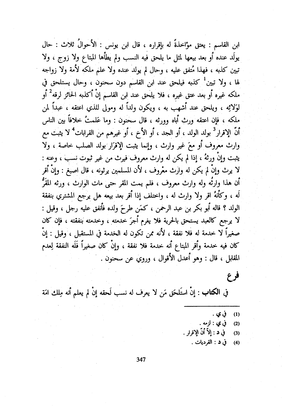 ابْنُ الْقَاسِمِ يُعْتَقُ مُؤَاخَذَةً لَهُ بِإِقْرَارِهِ قَالَ ابْنُ يُونُسَ الْأَحْوَالُ ثَلَاثٌ حَالٌ يُولَدُ عِنْدَهُ أَوْ بَعْدَ بَيْعِهَا لِمِثْلِ مَا يَلْحَقُ فِيهِ النَّسَبُ وَلَمْ يَطَأْهَا الْمُبْتَاعُ وَلَا زَوْجٌ وَلَا تَبَيَّنَ كَذِبُهُ فَهَذَا مُتَّفَقٌ عَلَيْهِ وَحَالٌ لَمْ يُولد عِنْده وَلَا علم ملكه لأمة وَلَا زَوَاجُهُ لَهَا وَلَا تَبَيَّنَ كَذِبُهُ فَيَلْحَقُ عِنْدَ ابْنِ الْقَاسِمِ دُونَ سَحْنُونٍ وَحَالٌ يَسْتَلْحِقُ فِي ملكه غَيْرَهُ أَوْ بَعْدَ عِتْقِ غَيْرِهِ فَلَا يَلْحَقُ عِنْدَ ابْنِ الْقَاسِمِ إِنْ أَكْذَبَهُ الْحَائِزُ لِرِقِّهِ أَوْ لِوَلَائِهِ وَيَلْحَقُ عِنْدَ أَشْهَبَ بِهِ وَيَكُونُ وَلَدًا لَهُ وَمَوْلًى لِلَّذِي أَعْتَقَهُ عَبْدًا لِمَنْ مَلَكَهُ فَإِنِ أَعْتَقَهُ وَرِثَ أَبَاهُ وَوَرِثَهُ قَالَ سَحْنُونٌ وَمَا عَلِمْتُ خِلَافًا بَيْنَ النَّاسِ أَنَّ الْإِقْرَارَ بِوَلَدِ الْوَلَدِ أَوِ الْجَدِّ أَوِ الْأَخِ اَوْ غَيرهم من الْقرَابَات لَا يَثْبُتُ مَعَ وَارِثٍ مَعْرُوفٍ أَوْ مَعَ غَيْرِ وَارِثٍ وَإِنَّمَا يَثْبُتُ الْإِقْرَارُ بِوَلَدِ الصُّلْبِ خَاصَّةً وَلَا يَثْبُتُ وَإِنْ وَرِثَهُ إِذَا لَمْ يَكُنْ لَهُ وَارِثٌ مَعْرُوفٌ فَيَرِثُ مِنْ غَيْرِ ثُبُوتِ نَسَبٍ وَعَنْهُ لَا يَرْثُ وَإِنْ لَمْ يَكُنْ لَهُ وَارِثٌ مَعْرُوفٌ لِأَنَّ الْمُسْلِمِينَ يَرِثُونَهُ قَالَ أَصْبَغُ وَإِنْ أَقَرَّ أَنَّ هَذَا وَارِثُهُ وَلَهُ وَارِثٌ مَعْرُوفٌ فَلَمْ يَمُتِ الْمُقِرُّ حَتَّى مَاتَ الْوَارِثُ وَرِثَهُ الْمُقِرُّ لَهُ وَكَأَنَّهُ أَقَرَّ وَلَا وَارِثَ لَهُ وَاخْتُلِفَ إِذَا أَقَرَّ بَعْدَ بَيْعِهِ هَلْ يَرْجِعُ الْمُشْتَرِي بِنَفَقَةِ الْوَلَدِ قَالَهُ أَبُو بَكْرِ بْنُ عَبْدِ الرَّحْمَنِ كَمَنْ طَرَحَ وَلَدَهُ فَأَنْفَقَ عَلَيْهِ رَجُلٌ وَقِيلَ لَا يَرْجِعُ كَالْعَبْدِ يَسْتَحِقُّ بِالْحُرِّيَّةِ فَلَا يَغْرَمُ أَجْرَ خِدْمَتِهِ وَخِدْمَتُهُ بِنَفَقَتِهِ فَإِنْ كَانَ صَغِيرًا لَا خِدْمَةَ لَهُ فَلَا نَفَقَة لِأَنَّهُ مِمَّنْ تَكُونُ لَهُ الْخِدْمَةُ فِي الْمُسْتَقْبَلِ وَقِيلَ إِنْ كَانَ فِيهِ خِدْمَةٌ وَأَقَرَّ الْمُبْتَاعُ أَنَّهُ خَدَمَهُ فَلَا نَفَقَةَ وَإِنْ كَانَ صَغِيرًا فَلَهُ النَّفَقَةُ لِعَدَمِ الْمُقَابِلِ قَالَ وَهُوَ أَعْدَلُ الْأَقْوَالِ وَرُوِيَ عَنْ سَحْنُونٍ