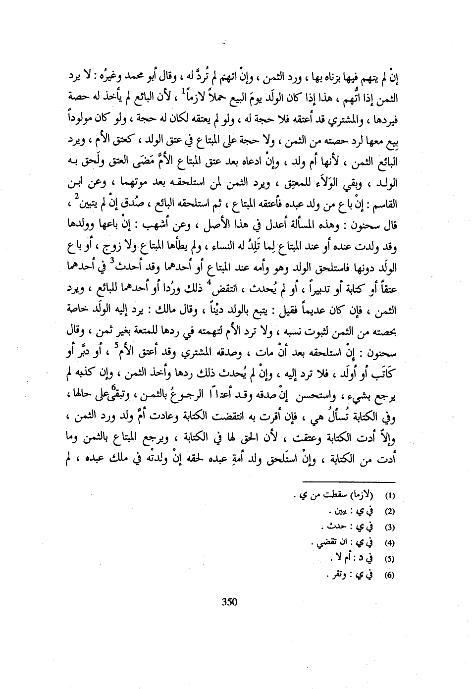 إِنْ لَمْ يُتَّهَمْ فِيهَا بِزِنَاهُ بِهَا وَرُدَّ الثَّمَنُ وَإِنِ اتُّهِمَ لَمْ تُرَدَّ لَهُ وَقَالَ أَبُو مُحَمَّدٍ وَغَيْرُهُ لَا يُرَدُّ الثَّمَنُ إِذَا اتُّهِمَ هَذَا إِذَا كَانَ الْوَلَدُ يَوْمَ الْبَيْعِ حَمْلًا لَازِمًا لِأَنَّ الْبَائِعَ لَمْ يَأْخُذْ لَهُ حِصَّةً فَيَرُدُّهَا وَالْمُشْتَرِي قَدْ أَعْتَقَهُ فَلَا حُجَّةَ لَهُ وَلَوْ لَمْ يُعْتِقْهُ لَكَانَ لَهُ حُجَّةً وَلَوْ كَانَ مَوْلُودًا بِيعَ مَعَهَا لِرَدِّ حِصَّتِهِ مِنَ الثَّمَنِ وَلَا حُجَّةَ عَلَى الْمُبْتَاعِ فِي عِتْقِ الْوَلَدِ كَعِتْقِ الْأُمِّ وَيَرُدُّ الْبَائِعُ الثَّمَنَ لِأَنَّهَا أُمُّ وَلَدٍ وَإِنِ ادَّعَاهُ بَعْدَ عِتْقِ الْمُبْتَاعِ الْأُمَّ مَضَى الْعِتْقُ وَلَحِقَ بِهِ الْوَلَدُ وَبَقِيَ الْوَلَاءُ لِلْمُعْتِقِ وَيُرَدُّ الثَّمَنُ لِمَنِ اسْتَلْحَقَهُ بَعْدَ مَوْتِهِمَا وَعَنِ ابْنِ الْقَاسِمِ إِنْ بَاعَ مِنْ وَلَدِ عَبْدِهِ فَأَعْتَقَهُ الْمُبْتَاعُ ثُمَّ اسْتَلْحَقَهُ البَائِع صدق إِن لم يتَبَيَّن قَالَ سَحْنُونٌ وَهَذِهِ الْمَسْأَلَةُ أَعْدَلُ فِي هَذَا الْأَصْلِ وَعَنْ أَشْهَبَ إِنْ بَاعَهَا وَوَلَدَهَا وَقَدْ وَلَدَتْ عِنْدَهُ أَوْ عِنْدَ الْمُبْتَاعِ لِمَا تَلِدُ لَهُ النِّسَاءُ وَلَمْ يَطَأْهَا الْمُبْتَاعُ وَلَا زَوْجَ أَوْ بَاعَ الْوَلَدَ دُونَهَا فَاسْتَلْحَقَ الْوَلَدَ وَهُوَ وَأُمُّهُ عِنْدَ الْمُبْتَاعِ أَوْ أَحَدُهُمَا وَقَدْ أَحْدَثَ فِي أَحَدِهِمَا عِتْقًا أَوْ كِتَابَةً أَوْ تَدْبِيرًا أَوْ لَمْ يُحْدِثِ انْتَقَضَ ذَلِكَ وَرُدَّا أَوْ أَحَدُهُمَا لِلْبَائِعِ وَيُرَدُّ الثَّمَنُ فَإِنْ كَانَ عَدِيمًا فَقِيلَ يُتْبَعُ بِالْوَلَدِ دَيْنًا وَقَالَ مَالِكٌ يُرَدُّ إِلَيْهِ الْوَلَدُ خَاصَّةً بِحِصَّتِهِ مِنَ الثَّمَنِ لِثُبُوتِ نَسَبِهِ وَلَا تُرَدُّ الْأُمُّ لِتُهْمَتِهِ فِي رَدِّهَا لِلْمُتْعَةِ بِغَيْرِ ثَمَنٍ وَقَالَ سَحْنُونٌ إِنِ اسْتَلْحَقَهُ بَعْدَ أَنْ مَاتَ وَصَدَّقَهُ الْمُشْتَرِي وَقَدْ أَعْتَقَ الْأُمَّ أَوْ دَبَّرَ أَوْ كَاتَبَ أَوْ أَوْلَدَ فَلَا تُرَدُّ إِلَيْهِ وَإِنْ لَمْ يُحْدِثْ ذَلِكَ رَدَّهَا وَأَخَذَ الثَّمَنَ وَإِنْ كَذَّبَهُ لَمْ يَرْجِعْ بِشَيْء وَاسْتحْسن إِن صدقه وَقد اعتاا الرُّجُوعُ بِالثَّمَنِ وَتَبْقَى عَلَى حَالِهَا وَفِي الْكِتَابَةِ تُسْأَلُ هِيَ فَإِنْ أَقَرَّتْ بِهِ انْتَقَضَتِ الْكِتَابَةُ وَعَادَتْ أُمَّ وَلَدٍ وَرُدَّ الثَّمَنُ وَإِلَّا أَدَّتِ الْكِتَابَةَ وَعَتَقَتْ لِأَنَّ الْحَقَّ لَهَا فِي الْكِتَابَةِ وَيَرْجِعُ الْمُبْتَاعُ بِالثَّمَنِ وَمَا أَدَّتْ مِنَ الْكِتَابَةِ وَإِن استلحق ولد امة عبد لَحِقَهُ إِنْ وَلَدَتْهُ فِي مِلْكِ عَبْدِهِ لَمْ
