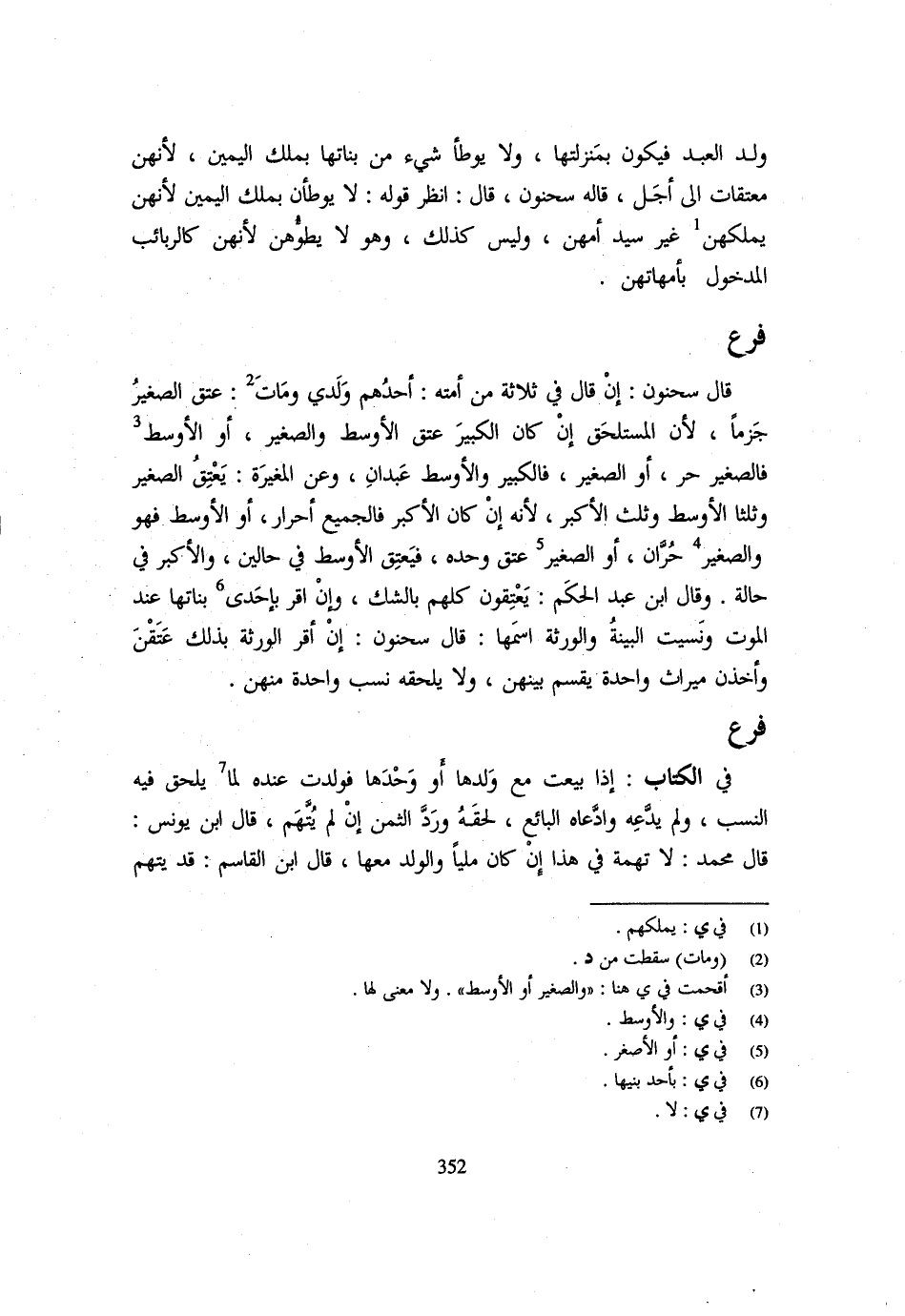 قَالَ سَحْنُونٌ إِنْ قَالَ فِي ثَلَاثَةٍ مِنْ أَمَتِهِ أَحَدُهُمْ وَلَدِي وَمَاتَ عَتَقَ الصَّغِيرُ جَزْمًا لِأَنَّ الْمُسْتَلْحَقَ إِنْ كَانَ الْكَبِيرَ عَتَقَ الْأَوْسَطُ وَالصَّغِيرُ أَوِ الْأَوْسَطُ فَالصَّغِيرُ حُرٌّ أَوِ الصَّغِيرُ فَالْكَبِيرُ وَالْأَوْسَطُ عَبْدَانِ وَعَنِ الْمُغِيرَةِ يُعْتَقُ الصَّغِيرُ وَثُلُثَا الْأَوْسَطِ وَثُلُثُ الْأَكْبَرِ لِأَنَّهُ إِنْ كَانَ الْأَكْبَرَ فَالْجَمِيعُ أَحْرَارٌ أَوِ الْأَوْسَطَ فَهُوَ وَالصَّغِيرُ حُرَّانِ أَوِ الصَّغِيرُ عَتَقَ وَحْدَهُ فَيُعْتَقُ الْأَوْسَطُ فِي حَالَيْنِ وَالْأَكْبَرُ فِي حَالِهِ وَقَالَ ابْنُ عَبْدِ الْحَكَمِ يُعْتَقُونَ كُلُّهُمْ بِالشَّكِّ وَإِنْ أَقَرَّ بِإِحْدَى بَنَاتِهَا عِنْدَ الْمَوْت ونسيت الْبَيِّنَة وَالْوَرَثَة اسْمَهَا قَالَ سَحْنُونٌ إِنْ أَقَرَّ الْوَرَثَةُ بِذَلِكَ عَتَقْنَ وَأَخَذْنَ مِيرَاثَ وَاحِدَةٍ يُقَسَّمُ بَيْنَهُنَّ وَلَا يَلْحَقُهُ نَسَبُ وَاحِدَةٍ مِنْهُنَّ
