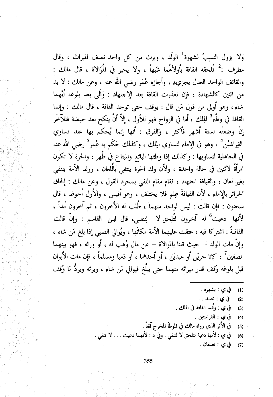 وَلَا يَزُولُ النَّسَبُ لِشَهْوَةِ الْوَلَدِ وَيَرِثُ مِنْ كُلِّ وَاحِدٍ نِصْفَ الْمِيرَاثِ وَقَالَ مُطَرِّفٌ تُلْحِقُهُ الْقَافة باولهما شبها وَلَا يخبر فِي الْمُوَالَاةِ قَالَ مَالِكٌ وَالْقَائِفُ الْوَاحِدُ الْعَدْلُ يجزيء وَأَجَازَهُ عُمَرُ رَضِيَ اللَّهُ عَنْهُ وَعَنْ مَالِكٍ لَا بُدَّ مِنَ اثْنَيْنِ كَالشَّهَادَةِ فَإِنْ تَعَذَّرَتِ الْقَافَةُ بَعْدَ الِاجْتِهَادِ وَالَى بَعْدَ بُلُوغِهِ أَيَّهُمَا شَاءَ وَهُوَ أَوْلَى مِنْ قَوْلِ مَنْ قَالَ يُوقَفُ حَتَّى تُوجَدَ الْقَافَةُ قَالَ مَالِكٌ وَإِنَّمَا الْقَافَةُ فِي وَطْءِ الْمِلْكِ أَمَّا فِي الزَّوَاجِ فَهُوَ لِلْأَوَّلِ إِلَّا أَنْ يَنْكِحَ بَعْدَ حَيْضَةٍ فَلِلْآخَرِ إِنْ وَضَعَتْهُ لِسِتَّةِ أَشْهُرٍ فَأَكْثَرَ وَالْفَرْقُ أَنَّهَا إِنَّمَا يُحْكَمُ بِهَا عِنْدَ تَسَاوِي الْفِرَاشَيْنِ وَهُوَ فِي الْإِمَاءِ لِتَسَاوِي الْمِلْكِ وَكَذَلِكَ حَكَمَ بِهِ عُمَرُ رَضِيَ اللَّهُ عَنْهُ فِي الْجَاهِلِيَّةِ لِتَسَاوِيهَا وَكَذَلِكَ إِذَا وَطِئَهَا الْبَائِعُ وَالْمُبْتَاعُ فِي طُهْرٍ وَالْحُرَّةُ لَا تَكُونُ امْرَأَةً لِاثْنَيْنِ فِي حَالَة وَاحِدَة وَلِأَن ولد الْحرَّة يَنْتَفِي بِاللّعانِ وَولد الْأمة يَنْتَفِي بِغَيْر لعان وَالْقِيَافَةُ اجْتِهَادٌ فَقَامَ مَقَامَ النَّفْيِ بِمُجَرَّدِ الْقَوْلِ وَعَنْ مَالِكٍ إِلْحَاقُ الْحَرَائِرِ بِالْإِمَاءِ لِأَنَّ الْقِيَافَةَ عِلْمٌ فَلَا يُخْتَلَفُ وَهُوَ أَقْيَسُ وَالْأَوَّلُ أَحْوَطُ قَالَ سَحْنُونٌ فَإِنْ قَالَتْ لَيْسَ لِوَاحِدٍ مِنْهُمَا طُلِبَ لَهُ الْآخَرُونَ ثُمَّ آخَرُونَ أَبَدًا لِأَنَّهَا دُعِيَتْ لَهُ آخَرُونَ لِتُلْحِقَ لَا لِتَنْفِيَ قَالَ ابْنُ الْقَاسِمِ وَإِنْ قَالَتِ الْقَافَةُ اشْتَرَكَا فِيهِ عَتَقَتْ عَلَيْهِمَا الْأَمَةُ مَكَانَهَا وَيُوَالِي الصَّبِيُّ إِذَا بلغ من شَاءَ وَإِن مَاتَ الْوَلَد حَيْثُ قُلْنَا بِالْمُوَالَاةِ عَنْ مَالٍ وُهِبَ لَهُ أَوْ وَرِثَهُ فَهُوَ بَيْنُهُمَا نِصْفَيْنِ كَانَا حُرَّيْنِ أَوْ عَبْدَيْنِ أَوْ أَحَدُهُمَا أَوْ ذِمِّيًّا وَمُسْلِمًا فَإِنْ مَاتَ الْأَبَوَانِ قَبْلَ بُلُوغِهِ وُقِفَ قَدْرُ مِيرَاثِهِ مِنْهُمَا حَتَّى يَبْلُغَ فَيُوَالِي مَنْ شَاءَ وَيَرِثُهُ وَيُرَدُّ مَا وُقِفَ
