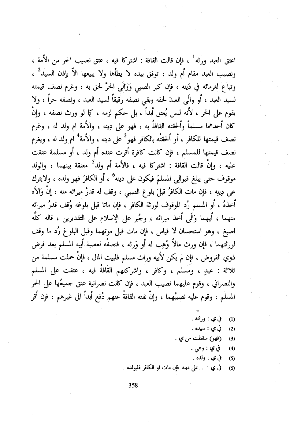 أُعْتِقَ الْعَبْدُ وَرِثَهُ فَإِنْ قَالَتِ الْقَافَةُ اشْتَرَكَا فِيهِ عَتَقَ نَصِيبُ الْحُرِّ مِنَ الْأَمَةِ وَنصِيب العَبْد مقَام أم ولد توفق بِيَدِهِ لَا يَطَأُهَا وَلَا يَبِيعُهَا إِلَّا بِإِذْنِ السَّيِّدِ وَتُبَاعُ لِغُرَمَائِهِ فِي دَيْنِهِ فَإِنْ كَبُرَ الصَّبِيُّ وَوَالَى الْحُرَّ لَحِقَ بِهِ وَغَرِمَ نِصْفَ قِيمَتِهِ لِسَيِّدِ الْعَبْدِ أَوْ وَالَى الْعَبْدَ لَحِقَهُ وَبَقِيَ نِصْفُهُ رَقِيقًا لِسَيِّدِ الْعَبْدِ وَنِصْفُهُ حُرًّا وَلَا يُقَوَّمُ عَلَى الْحُرِّ لِأَنَّهُ لَيْسَ يُعْتَقُ أَبَدًا بَلْ حُكْمٌ لَزِمَهُ كَمَا لَوْ وَرِثَ نِصْفَهُ وَإِنْ كَانَ أَحَدُهُمَا مُسْلِمًا وَأَلْحَقَتْهُ الْقَافَةُ بِهِ فَهُوَ عَلَى دِينِهِ وَالْأَمَةُ أُمُّ وَلَدٍ لَهُ وَغرم نِصْفَ قِيمَتِهَا لِلْكَافِرِ أَوْ أَلْحَقَتْهُ بِالْكَافِرِ فَهُوَ على دينه وَالْأمة أم ولد لَهُ وَيغرم نِصْفَ قِيمَتِهَا لِلْمُسْلِمِ فَإِنْ كَانَتْ كَافِرَةً أُقِرَّتْ عِنْدَهُ أُمَّ وَلَدٍ أَوْ مُسْلِمَةً عَتَقَتْ عَلَيْهِ وَإِنْ قَالَتِ الْقَافَةُ اشْتَرَكَا فِيهِ فَالْأَمَةُ أُمُّ وَلَدٍ مُعَتَقَةٌ بَيْنَهُمَا وَالْوَلَدُ مَوْقُوفٌ حَتَّى يَبْلُغَ فَيُوَالِيَ الْمُسْلِمَ فَيَكُونُ عَلَى دِينِهِ أَوِ الْكَافِرَ فَهُوَ وَلَدُهُ وَلَا يُتْرَكُ عَلَى دِينِهِ فَإِنْ مَاتَ الْكَافِرُ قَبْلَ بُلُوغِ الصَّبِيِّ وُقِفَ لَهُ قَدْرُ مِيرَاثِهِ مِنْهُ إِنْ وَالَاهُ أَخَذَهُ أَوِ الْمُسْلِمُ رُدَّ الْمَوْقُوفُ لِوَرَثَةِ الْكَافِرِ فَإِنْ مَاتَا قَبْلَ بُلُوغِهِ وُقِفَ قَدْرُ مِيرَاثِهِ مِنْهُمَا أَيُّهُمَا وَالَى أَخَذَ مِيرَاثَهُ وَجُبِرَ عَلَى الْإِسْلَامِ عَلَى التَّقْدِيرَيْنِ قَالَهُ كُلَّهُ أَصْبَغُ وَهُوَ اسْتِحْسَانٌ لَا قِيَاسَ فَإِنْ مَاتَ قَبْلَ مَوْتِهِمَا وَقَبْلَ الْبُلُوغِ رُدَّ مَا وُقِفَ لِوَرَثَتِهِمَا فَإِنْ وَرِثَ مَالًا وُهِبَ لَهُ أَوْ وَرِثَهُ فَنِصْفُهُ لِعَصَبَةِ أَبِيهِ الْمُسْلِمِ بَعْدَ فَرْضِ ذَوِي الْفُرُوضِ فَإِنْ لَمْ يَكُنْ لِأَبِيهِ وَرَاثٌ مُسْلِمٌ فَلِبَيْتِ الْمَالِ فَإِنْ حَمَلَتْ مُسْلِمَةٌ مِنْ ثَلَاثَةٍ عَبْدٍ وَمُسْلِمٍ وَكَافِرٍ وَأَشْرَكَتْهُمُ الْقَافَةُ فِيهِ عَتَقَتْ عَلَى الْمُسْلِمِ وَالنَّصْرَانِيِّ وَقُوِّمَ عَلَيْهِمَا نَصِيبُ الْعَبْدِ فَإِنْ كَانَتْ نَصْرَانِيَّةً عَتَقَ جَمِيعُهَا عَلَى الْحُرِّ الْمُسْلِمِ وَقُوِّمَ عَلَيْهِ نُصِيبُهُمَا وَإِنْ نَفَتْهُ الْقَافَةُ عَنْهُمْ دُفِعَ أَبَدًا الى غَيرهم فَإِن اقر