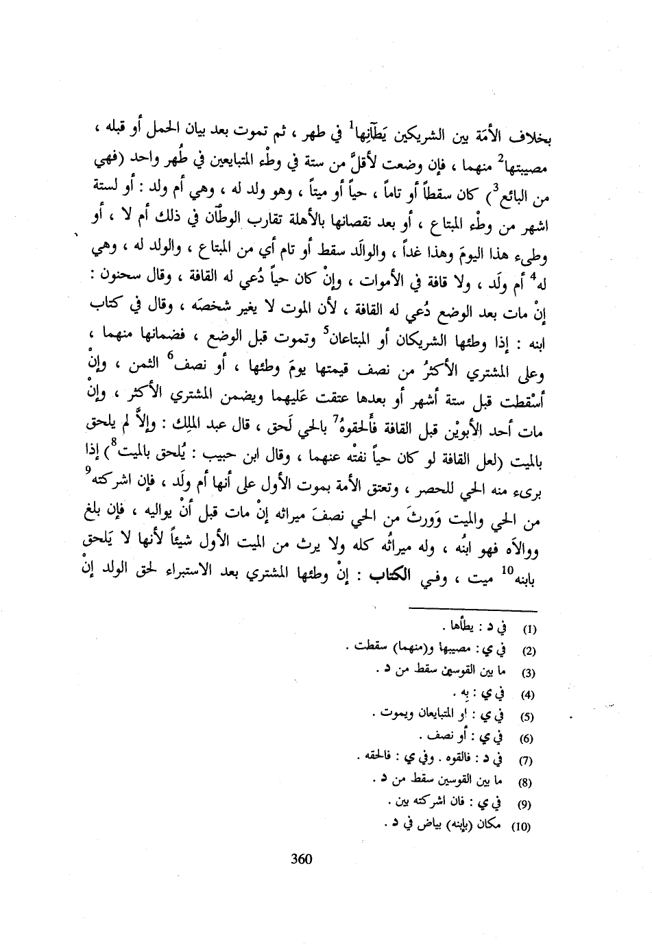 بِخِلَافِ الْأَمَةِ بَيْنَ الشَّرِيكَيْنِ يَطَآنِهَا فِي طُهْرٍ ثمَّ تَمُوت بَعْدَ بَيَانِ الْحَمْلِ أَوْ قَبْلَهُ مُصِيبَتُهَا مِنْهُمَا فَإِن وضعت لأَقل من سِتَّة فِي وَطْءِ الْمُتَبَايِعَيْنِ فِي طُهْرٍ وَاحِدٍ فَهِيَ مِنَ الْبَائِعِ كَانَ سَقْطًا أَوْ تَامًّا حَيًّا أَوْ مَيِّتًا وَهُوَ وَلَدٌ لَهُ وَهِيَ أُمُّ وَلَدٍ أَوْ لِسِتَّةِ أَشْهُرٍ مِنْ وَطْءِ الْمُبْتَاعِ أَوْ بَعْدَ نُقْصَانِهَا بِالْأَهِلَّةِ تَقَارَبَ الْوَطْآنِ فِي ذَلِكَ أَمْ لَا أَوْ وَطِئَ هَذَا الْيَوْمَ وَهَذَا غَدا وَالْوَالِد سَقْطٌ أَوْ تَامٌّ أَيِ مِنَ الْمُبْتَاعِ وَالْوَلَدُ لَهُ وَهِيَ لَهُ أُمُّ وَلَدٍ وَلَا قَافَةَ فِي الْأَمْوَاتِ وَإِنْ كَانَ حَيًّا دُعِيَ لَهُ الْقَافَةُ وَقَالَ سَحْنُونٌ إِنْ مَاتَ بَعْدَ الْوَضْعِ دُعِيَ لَهُ الْقَافَةُ لِأَنَّ الْمَوْتَ لَا يُغَيِّرُ شَخْصَهُ وَقَالَ فِي كِتَابِ ابْنِهِ إِذَا وَطِئَهَا الشَّرِيكَانِ أَوِ الْمُبْتَاعَانِ وَتَمُوتُ قَبْلَ الْوَضْعِ فَضَمَانُهَا مِنْهُمَا وَعَلَى الْمُشْتَرِي الْأَكْثَرِ مِنْ نِصْفِ قِيمَتِهَا يَوْمَ وَطِئَهَا أَوْ نِصْفِ الثَّمَنِ وَإِنْ أَسْقَطَتْ قَبْلَ سِتَّةِ أَشْهُرٍ أَوْ بَعْدَهَا عَتَقَتْ عَلَيْهِمَا وَيَضْمَنُ الْمُشْتَرِي الْأَكْثَرَ وَإِنْ مَاتَ أَحَدُ الْأَبَوَيْنِ قَبْلَ الْقَافَةِ فَأَلْحَقُوهُ بِالْحَيِّ لَحِقَ قَالَ عَبْدُ الْمَلِكِ وَإِلَّا لَمْ يَلْحَقْ بِالْمَيِّتِ لَعَلَّ الْقَافَةَ لَوْ كَانَ حَيًّا نَفَتْهُ عَنْهُمَا وَقَالَ ابْنُ حَبِيبٍ يَلْحَقُ بِالْمَيِّتِ إِذَا بَرِئَ مِنْهُ الْحَيُّ لِلْحَصْرِ وَتُعْتَقُ الْأَمَةُ بِمَوْتِ الْأَوَّلِ عَلَى أَنَّهَا أُمُّ وَلَدٍ فَإِنِ أَشْرَكَتْهُ مِنَ الْحَيِّ وَالْمَيِّتِ وَوَرِثَ مِنَ الْحَيِّ نِصْفَ مِيرَاثِهِ إِنْ مَاتَ قَبْلَ أَنْ يُوَالِيَهُ فَإِنْ بَلَغَ وَوَالَاهُ فَهُوَ ابْنُهُ وَلَهُ مِيرَاثُهُ كُلُّهُ وَلَا يَرِثُ مِنَ الْمَيِّت الأول شَيْئا لِأَنَّهَا لَا يلْحق بِابْنِهِ مَيِّتٌ وَفِي الْكِتَابِ إِنْ وَطِئَهَا الْمُشْتَرِي بَعْدَ الِاسْتِبْرَاءِ لَحِقَ الْوَلَدُ إِنْ