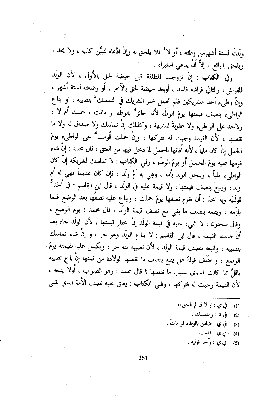 وَلَدَتْهُ لِسِتَّةِ أَشْهُرٍ مِنْ وَطْئِهِ أَوْ لَا فَلَا يَلْحَقُ بِهِ وَإِنِ ادَّعَاهُ لِتَبَيُّنِ كَذِبِهِ وَلَا يُحَدُّ وَيُلْحَقُ بِالْبَائِعِ إِلَّا أَنْ يَدَّعِيَ اسْتِبْرَاءً وَفِي الْكِتَابِ إِنْ تَزَوَّجَتِ الْمُطَلَّقَةُ قَبْلَ حَيْضَةٍ لَحِقَ بِالْأَوَّلِ لِأَنَّ الْوَلَدَ لِلْفِرَاشِ وَالثَّانِي فرَاشه فَاسد أوبعد حَيْضَةٍ لَحِقَ بِالْآخِرِ أَوْ وَضَعَتْهُ لِسِتَّةِ أَشْهُرٍ وَإِنْ وَطِئَ أَحَدُ الشَّرِيكَيْنِ فَلَمْ تَحْمِلْ خُيِّرَ الشَّرِيك فِي التَّمَسُّك بِنَصِيبِهِ اَوْ ابْتَاعَ الْوَاطِئِ بِنِصْفِ قِيمَتِهَا يَوْمَ الْوَطْءِ لِأَنَّهُ حَائِزٌ بِالْوَطْءِ لَوْ مَاتَتْ حَمَلَتْ أَمْ لَا وَلَا حَدَّ عَلَى الْوَاطِئِ وَلَا عُقُوبَةَ لِلشُّبْهَةِ وَكَذَلِكَ إِنْ تَمَاسَكَ وَلَا صَدَاقَ لَهُ وَلَا مَا نَقَصَهَا لِأَنَّ الْقِيمَةَ وَجَبَتْ لَهُ فَتَرَكَهَا وَإِنْ حَمَلَتْ قَوِّمَتْ عَلَى الْوَاطِئِ يَوْمَ الْحَمْلِ إِنْ كَانَ مَلِيًّا لِأَنَّهُ أَفَاتَهَا بِالْحَمْلِ لِمَا دَخَلَ فِيهَا مِنَ الْعِتْقِ قَالَ مُحَمَّدٌ إِنْ شَاءَ قَوَّمَهَا عَلَيْهِ يَوْمَ الْحَمْلِ أَوْ يَوْمَ الْوَطْءِ وَفِي الْكِتَابِ لَا تَمَاسُكَ لِشَرِيكِهِ إِنْ كَانَ الْوَاطِئ مَلِيًّا وَيلْحق الْوَلَد بِأُمِّهِ وَهِيَ بِهِ أُمُّ وَلَدٍ فَإِنْ كَانَ عَدِيمًا فَهِيَ لَهُ أُمُّ وَلَدٍ وَيُتْبَعُ بِنِصْفِ قِيمَتِهَا وَلَا قِيمَةَ عَلَيْهِ فِي الْوَلَدِ قَالَ ابْنُ الْقَاسِمِ فِي أَحَدِ قَوْلَيْهِ وَبِهِ آخُذُ أَنْ يُقَوَّمَ نِصْفُهَا يَوْمَ حَمَلَتْ وَيُبَاعُ عَلَيْهِ نَصِفُهَا بعد الْوَضع فِيمَا يلْزمه ويتبعه بِنصْف مَا بَقِي مَعَ نصف قيمَة الْوَلَد قَالَ مُحَمَّد يَوْم الْوَضْعِ وَقَالَ سَحْنُونٌ لَا شَيْءَ عَلَيْهِ فِي قِيمَةِ الْوَلَدِ إِنِ اخْتَارَ قِيمَتَهَا لِأَنَّ الْوَلَدَ جَاءَ بَعْدَ أَنْ ضَمَّنَهُ الْقِيمَةَ قَالَ ابْنُ الْقَاسِمِ لَا يُبَاعُ الْوَلَدُ وَهُوَ حُرٌّ وَإِنْ شَاءَ تَمَاسَكَ بِنَصِيبِهِ وَاتَّبَعَهُ بِنِصْفِ قِيمَةِ الْوَلَدِ لِأَنَّ نَصِيبَهُ مِنْهُ حُرٌّ وَيُكْمِلُ عَلَيْهِ بِقِيمَتِهِ يَوْمَ الْوَضْعِ وَاخْتَلَفَ قَوْلُهُ هَلْ يَتْبَعُ بِنِصْفِ مَا نَقصهَا الْوِلَادَةُ مِنْ ثَمَنِهَا إِنْ بَاعَ نَصِيبَهُ بِأَقَلَّ مِمَّا كَانَت تسوى بِسَبَبِ مَا نَقَصَهَا قَالَ مُحَمَّدٌ وَهُوَ الصَّوَابُ أَولا يَتْبَعُهُ لِأَنَّ الْقِيمَةَ وَجَبَتْ لَهُ فَتَرَكَهَا وَفِي الْكِتَابِ يُعْتَقُ عَلَيْهِ نِصْفُ الْأَمَةِ الَّذِي بَقِيَ
